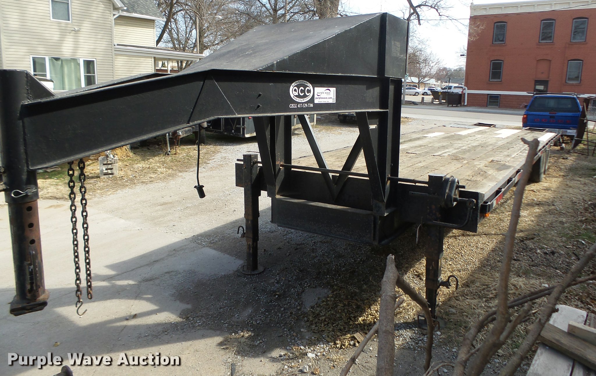 Shop built equipment trailer. 28'L x 102"W wood deck, 34.5" floor height, 5'L dove tail, 48"L x 20.5"W ramps, Stake side pockets, Rear stabilizers, Toolbox, Dual leg landing gear, Receiver hitch, Gooseneck hitch, Spring suspension, Electric brakes, Steel wheels, LT235/85R16 tires, Break-away cable broken. Nebraska title. DRXMVB000203538MO. M.T. Systems Inc.. 2818 N 48th St. Lincoln, NE 68504
