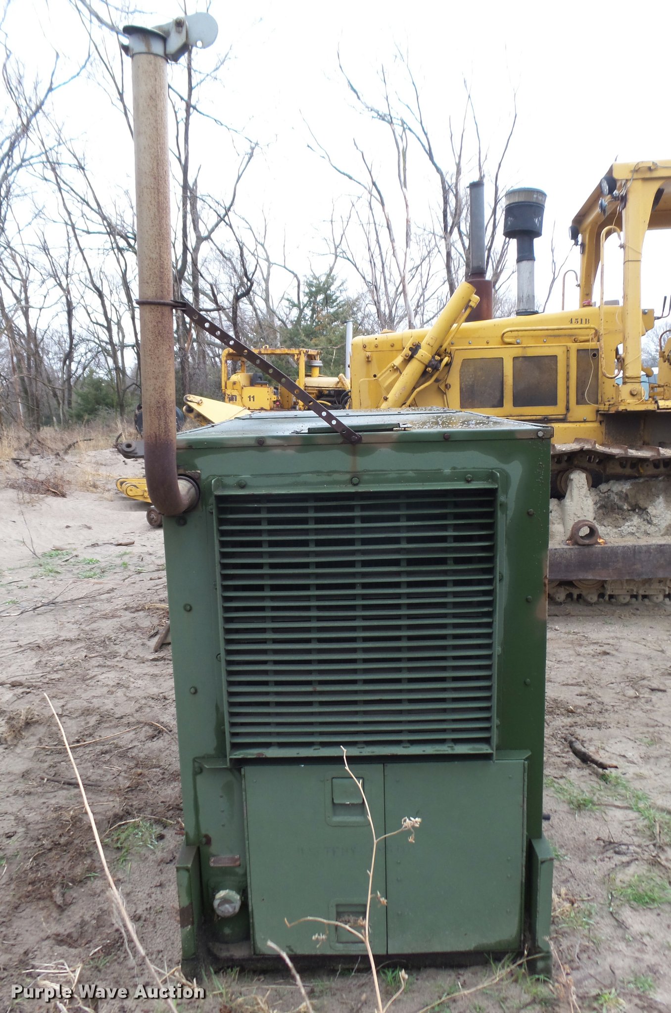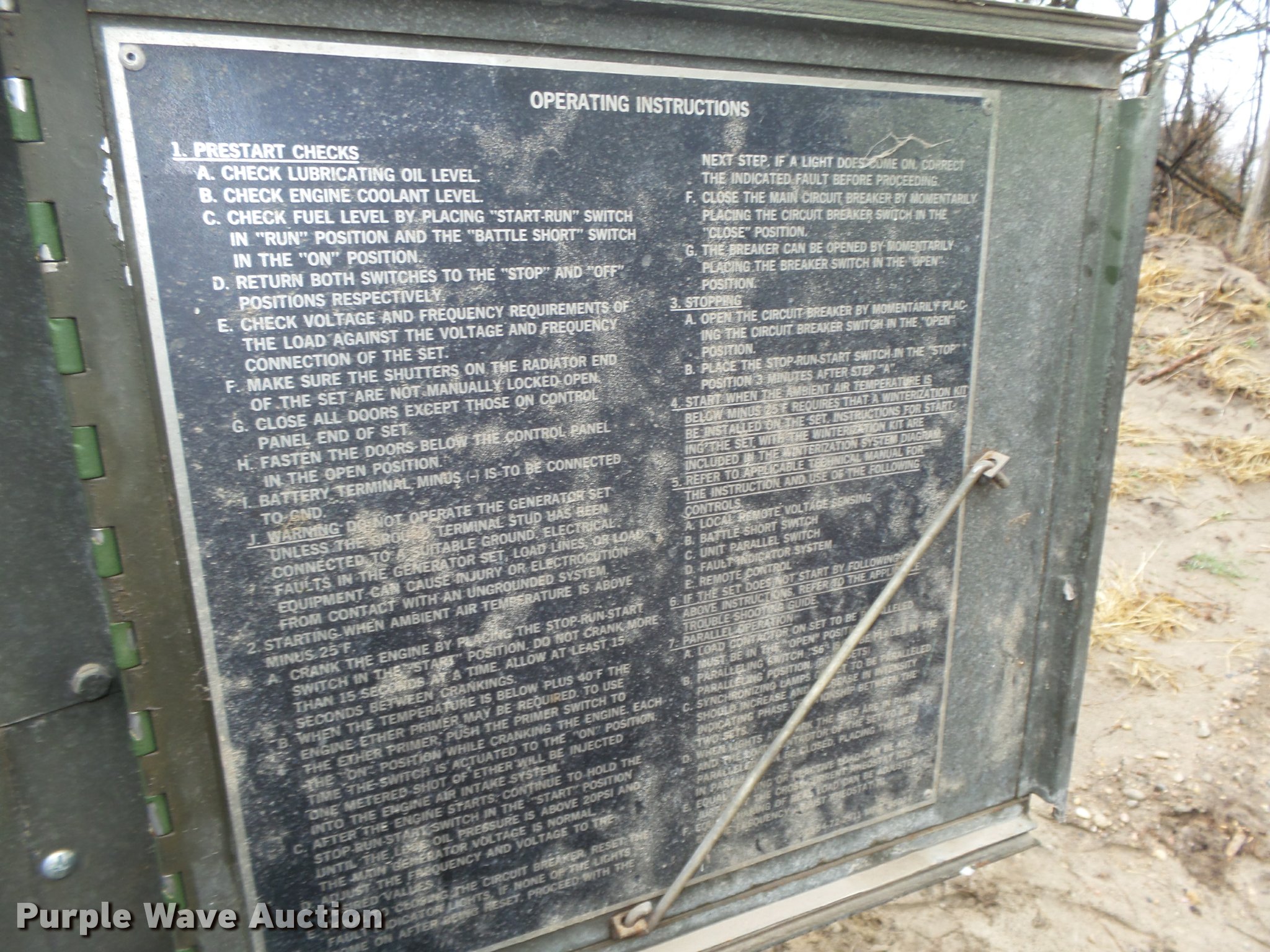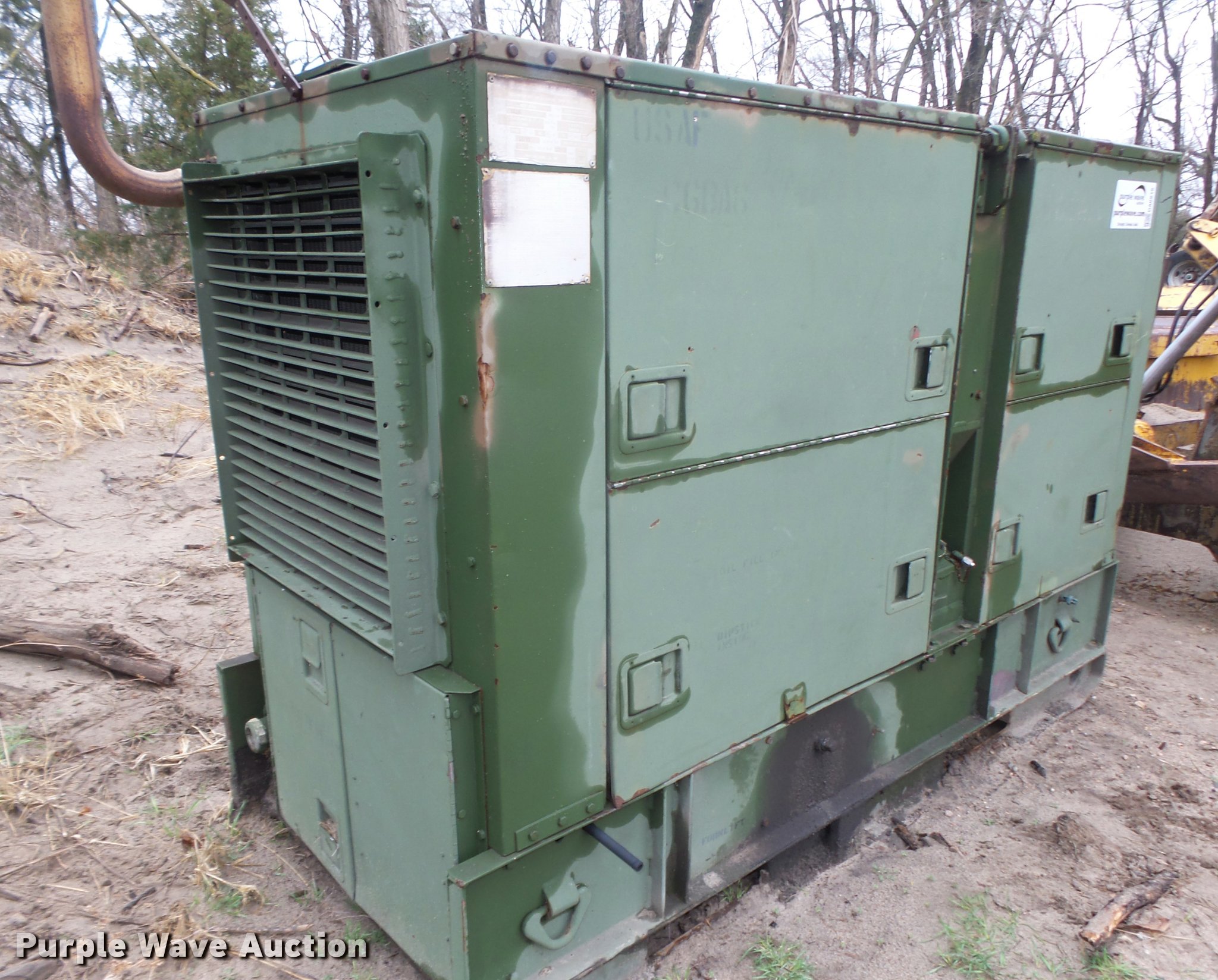 Purple Wave is selling a used Generator Set in Nebraska. This item is a 1983 Libby Welding Co. MEP005A generator with the following: 6,105 hours on meter, Six cylinder diesel engine, 80"L x 36"W x 55'H O.D. main body, 30 kW, Single phase, Electric start, Control panel, 26 gallon fuel tank, Forklift pockets, Skid mounted, 2,850 lbs dry weight, Serial RZ54416