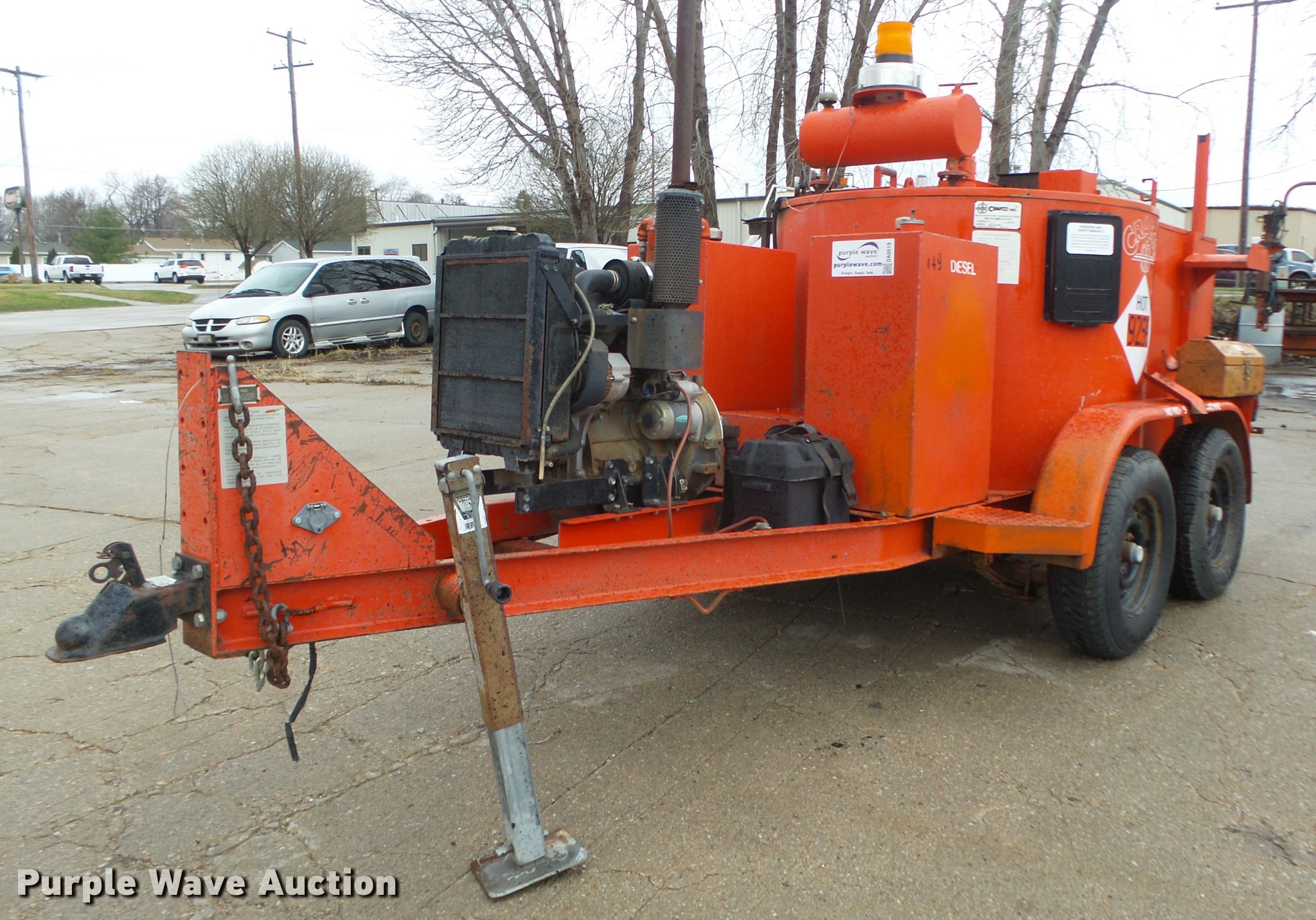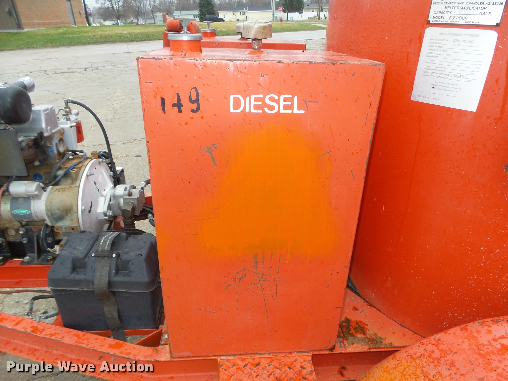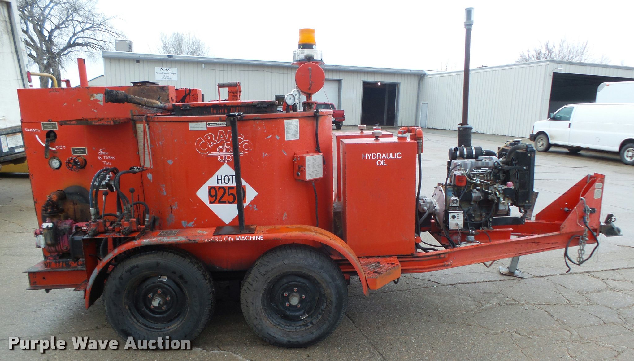 Purple Wave is selling a used Pot Hole Patcher in Nebraska. This item is a 1994 Crafco EZ Pour 200D melter applicator with the following: Isuzu 3KC1VA-U three cylinder diesel engine, 3,397 hours on meter, 14'L x 73"W, 17" floor height, 200 gallon capacity, Toolbox, Beacon light, Single leg landing gear, Safety chains, Brake-away cable, 2 5/16" ball hitch, Tandem axle, Spring suspension, Electric brakes, Steel wheels, ST205/75D14 tires, GVWR 7,000 lbs, GAWR 3,500 lbs, 4,340 lbs tare weight, 2,000 lbs maximum product weight, Operator manual, No battery or hose, Some material in kettle