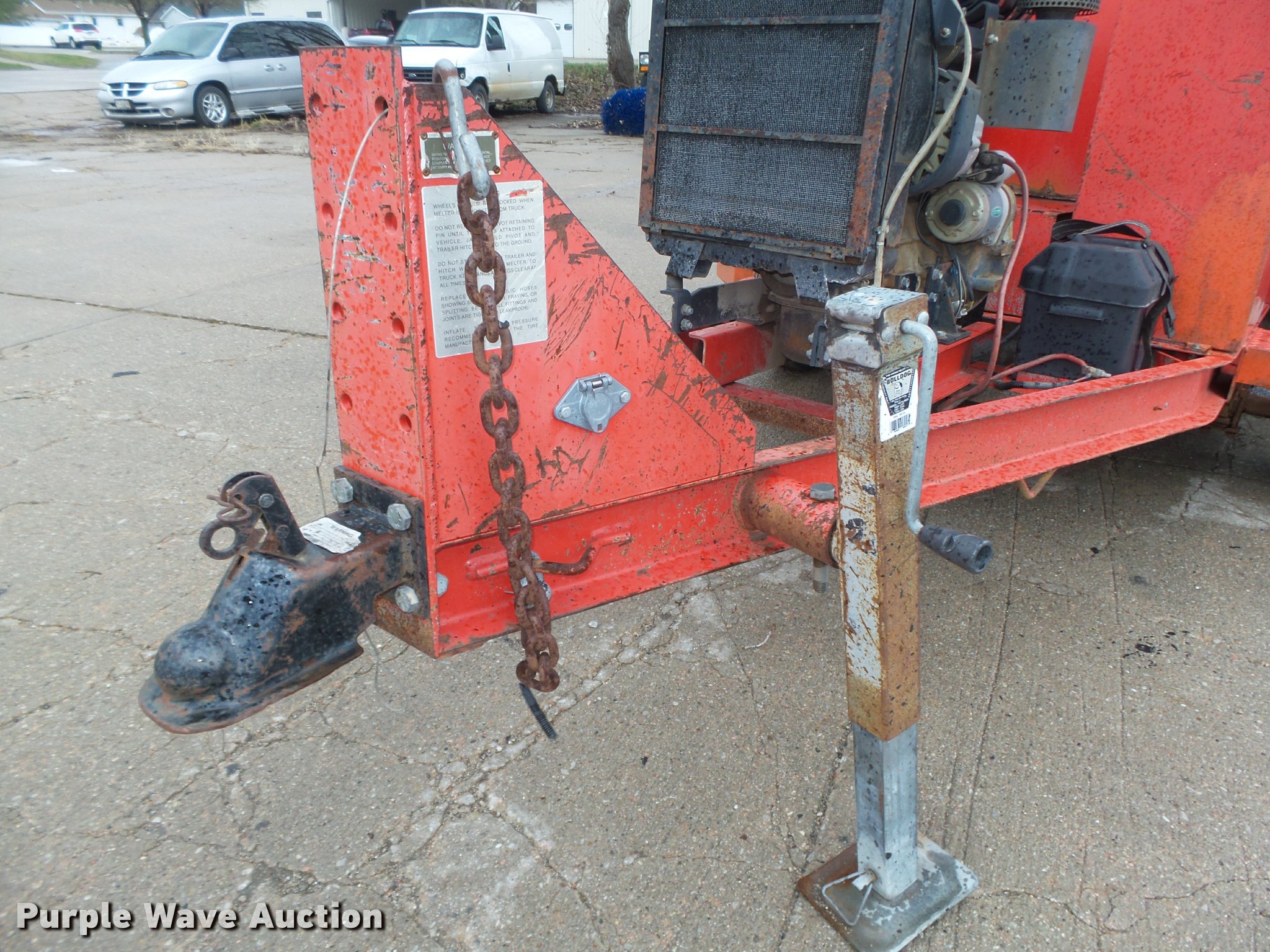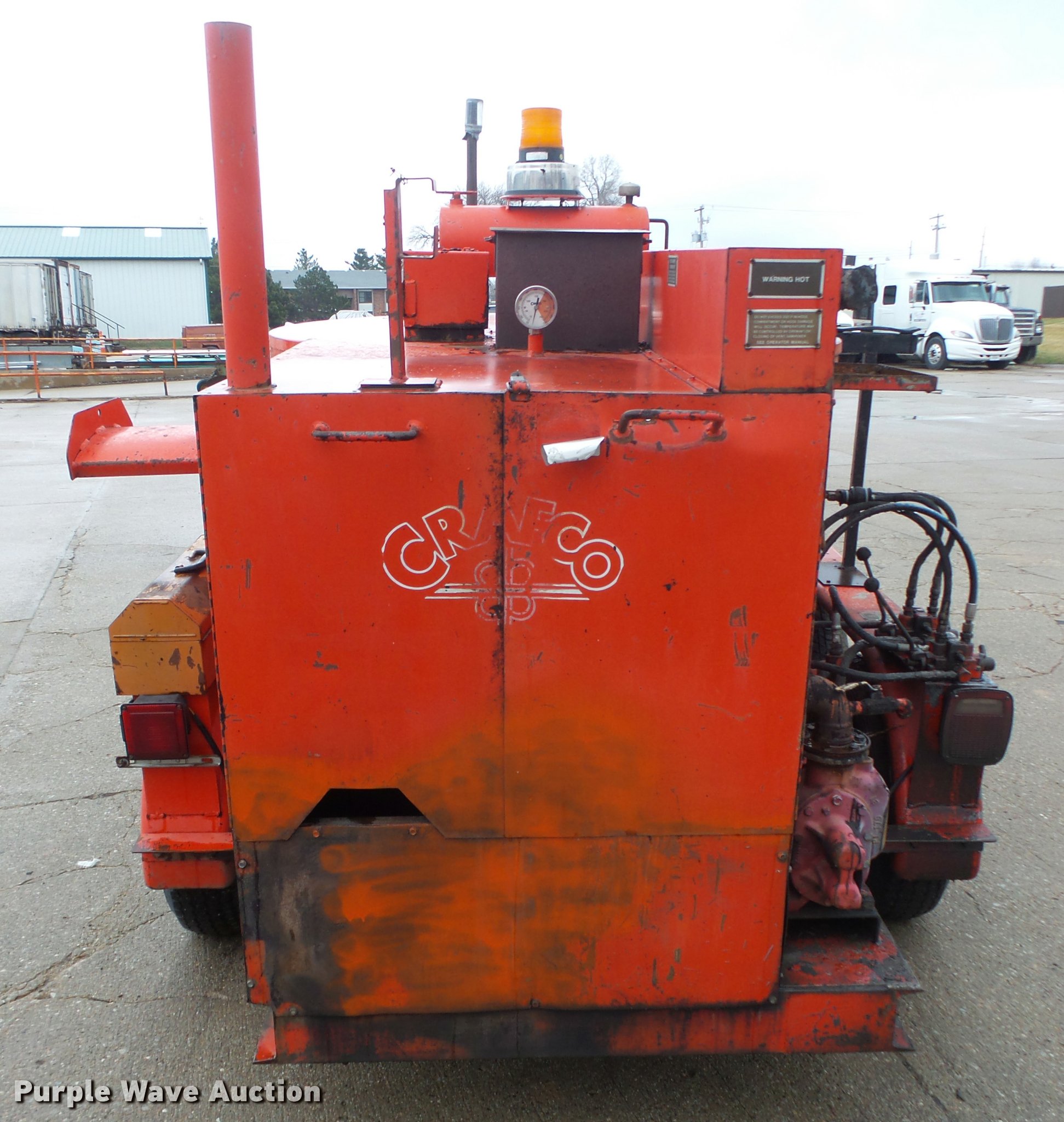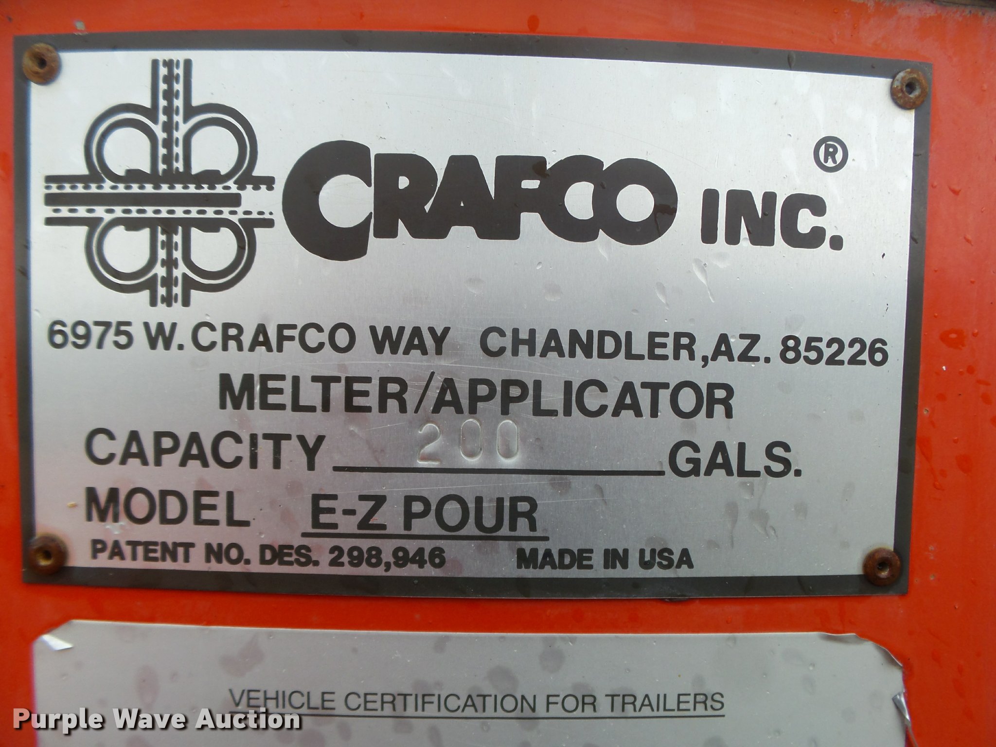 Purple Wave is selling a used Pot Hole Patcher in Nebraska. This item is a 1994 Crafco EZ Pour 200D melter applicator with the following: Isuzu 3KC1VA-U three cylinder diesel engine, 3,397 hours on meter, 14'L x 73"W, 17" floor height, 200 gallon capacity, Toolbox, Beacon light, Single leg landing gear, Safety chains, Brake-away cable, 2 5/16" ball hitch, Tandem axle, Spring suspension, Electric brakes, Steel wheels, ST205/75D14 tires, GVWR 7,000 lbs, GAWR 3,500 lbs, 4,340 lbs tare weight, 2,000 lbs maximum product weight, Operator manual, No battery or hose, Some material in kettle