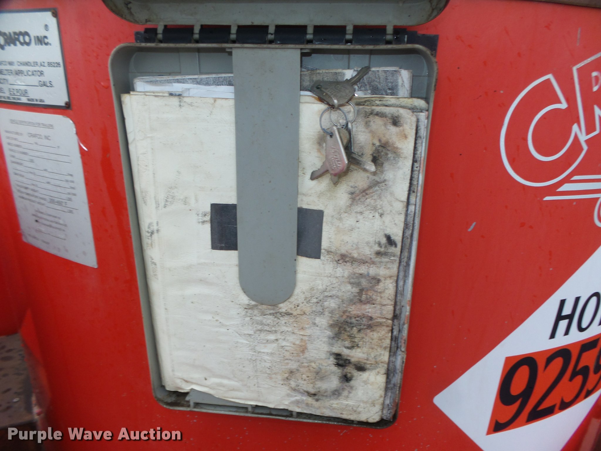 1994 Crafco EZ Pour 200D melter applicator. Isuzu 3KC1VA-U three cylinder diesel engine 3,397 hours on meter, 14'L x 73"W, 17" floor height, 200 gallon capacity, Toolbox, Beacon light, Single leg landing gear, Safety chains, Brake-away cable, 2 5/16" ball hitch, Tandem axle, Spring suspension, Electric brakes, Steel wheels, ST205/75D14 tires, GVWR 7,000 lbs, GAWR 3,500 lbs, 4,340 lbs tare weight, 2,000 lbs maximum product weight, Operator manual, No battery or hose, Some material in kettle. Transfer of ownership documentation will be a bill of sale. 109ED1228R1418175. Baders Highway. 1400 Square Turn Blvd. Norfolk, NE 68701