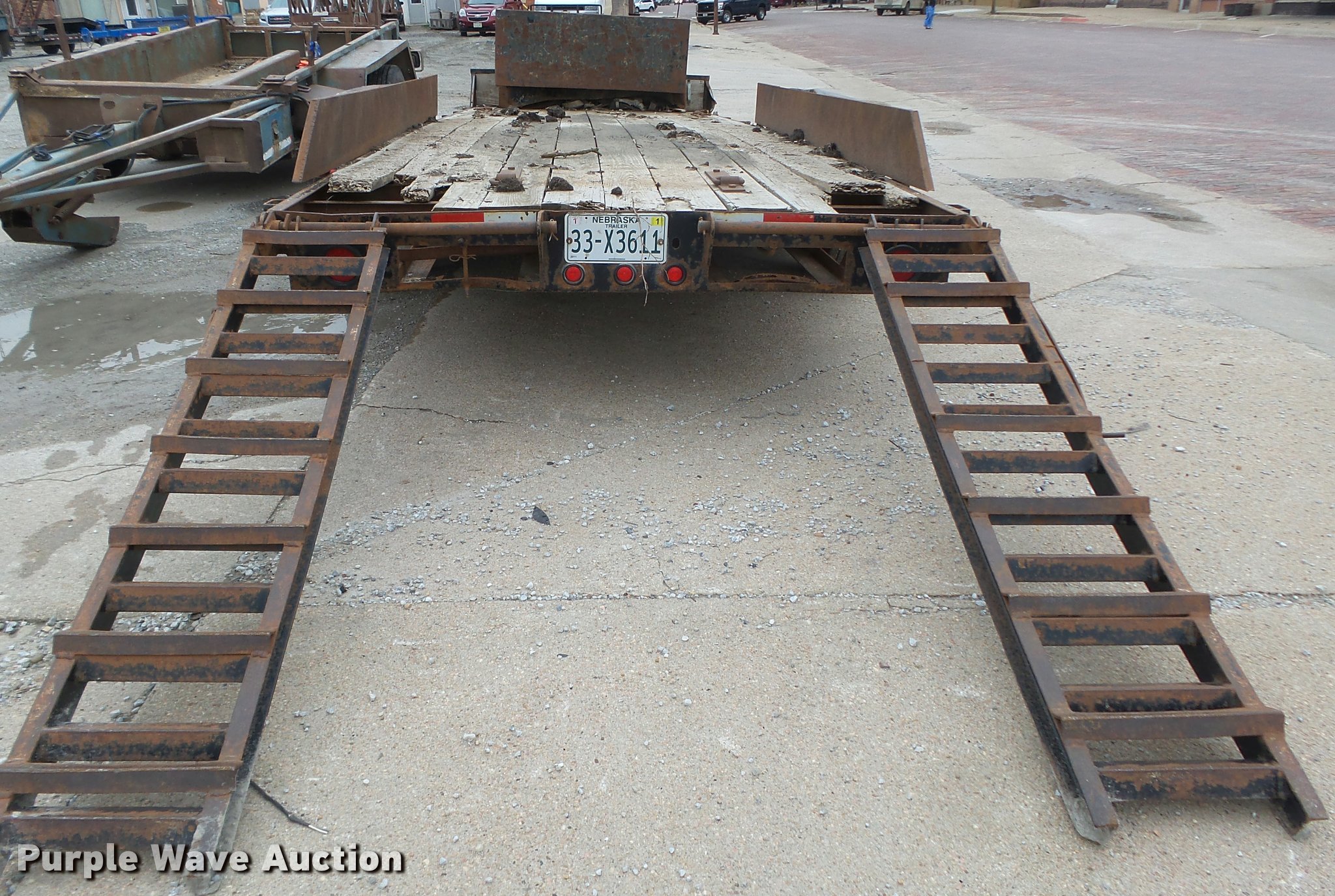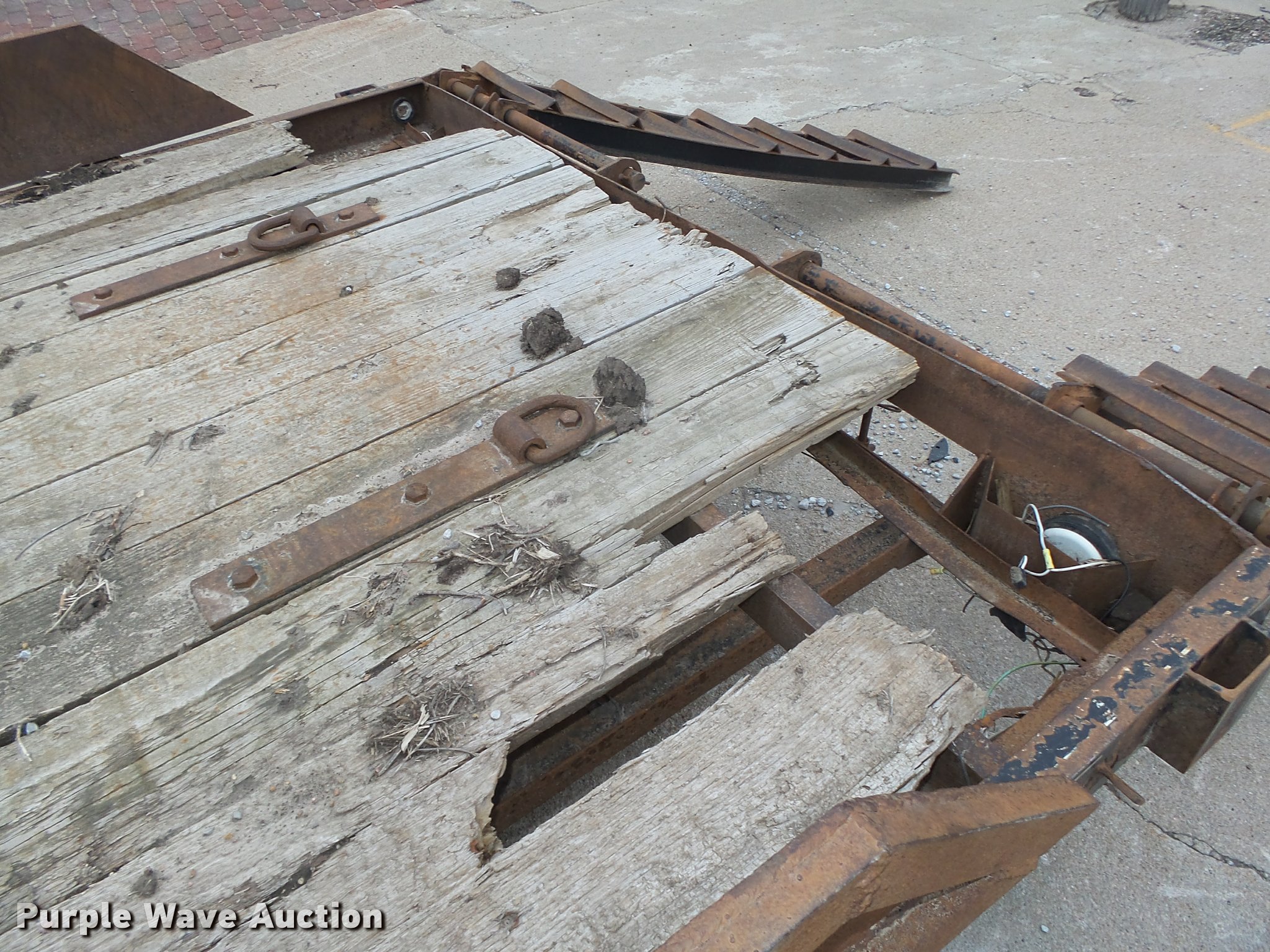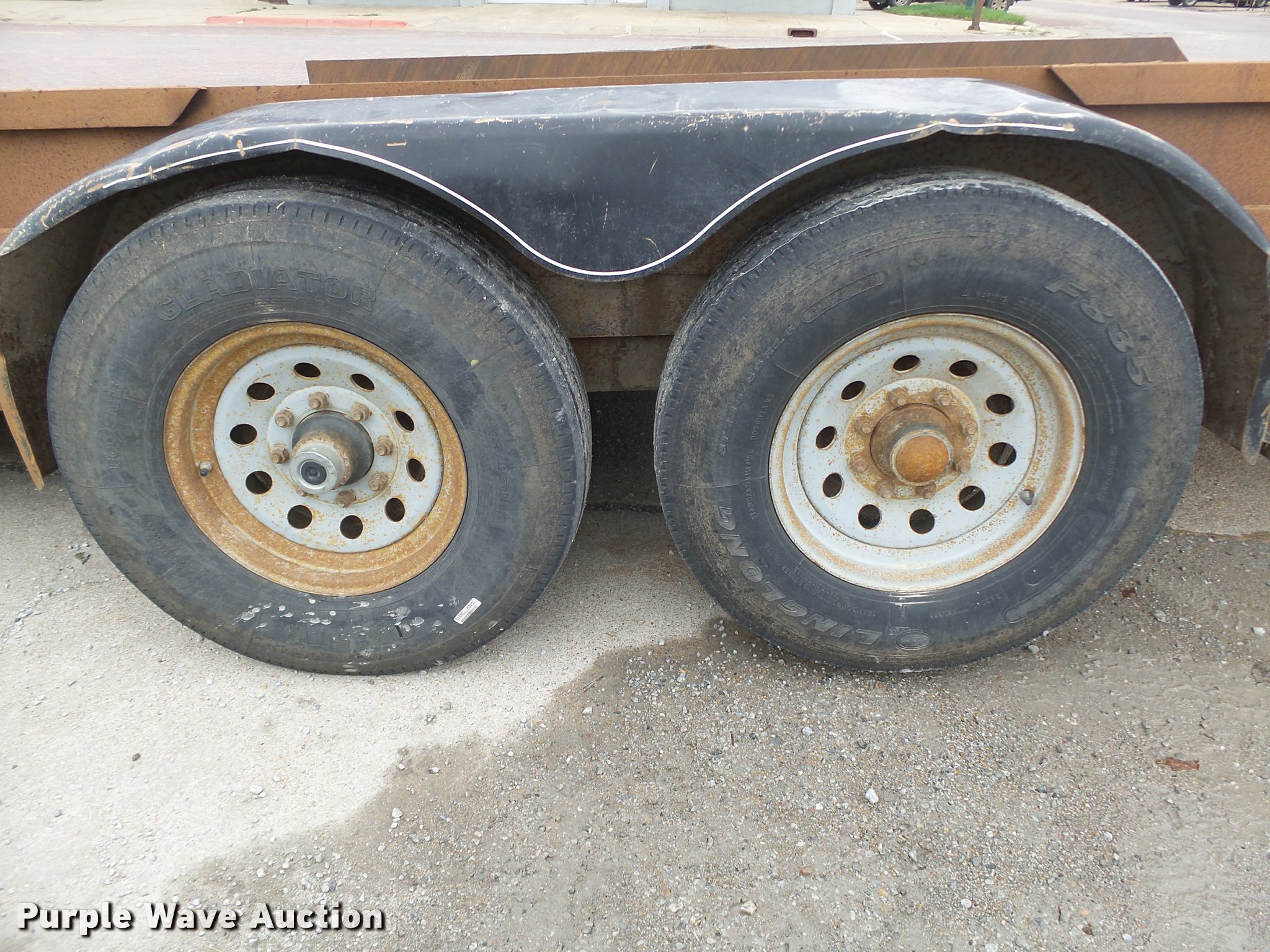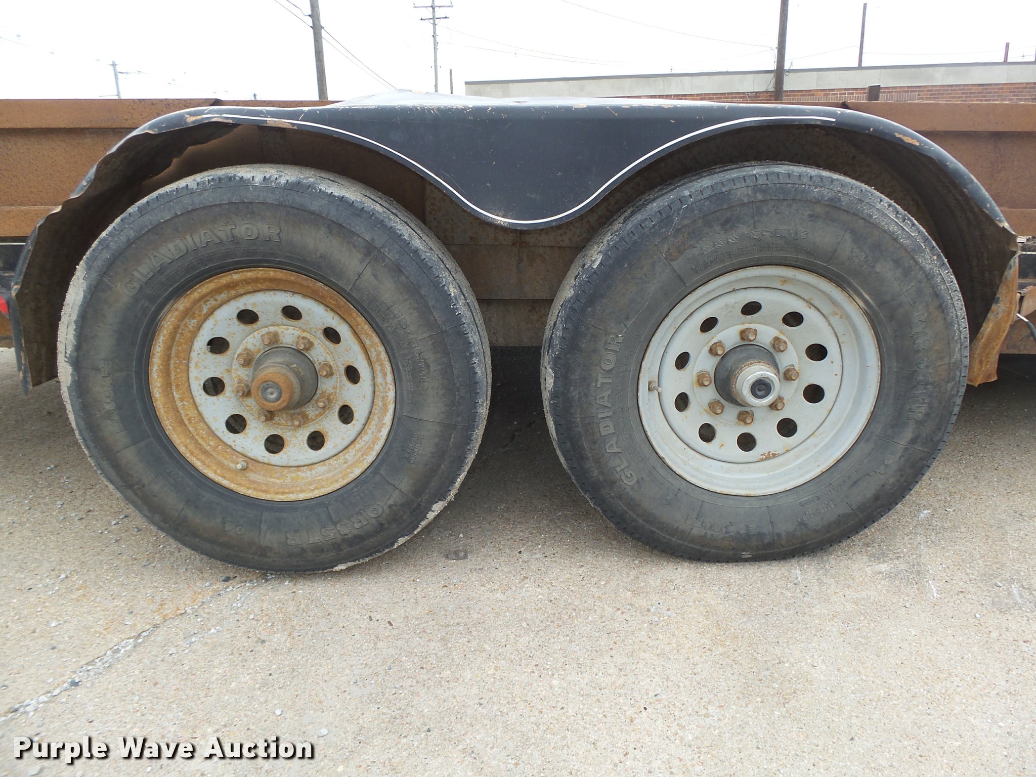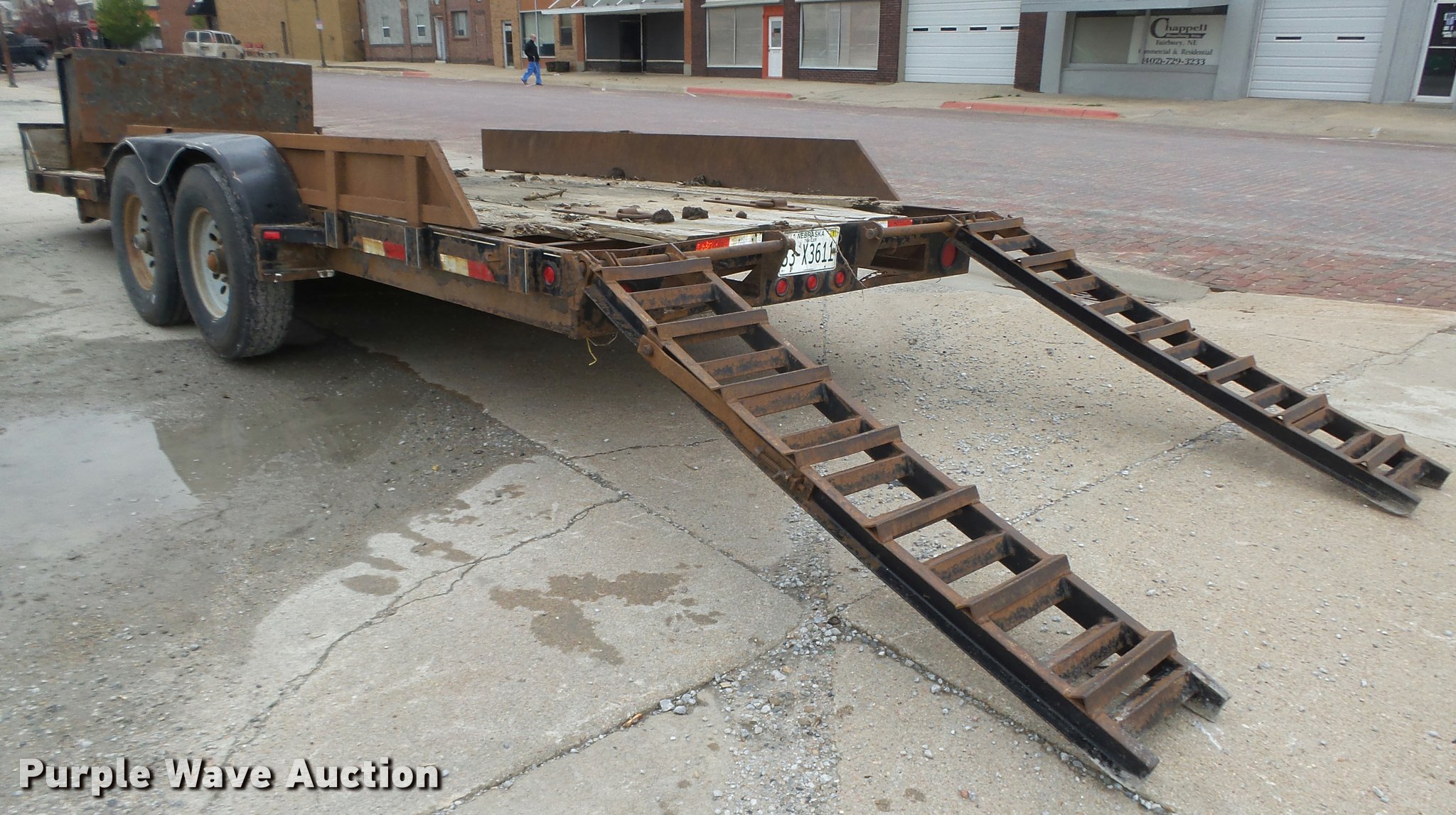 Purple Wave is selling a used Equip. Trailer in Nebraska. This item is a 2007 Titan equipment trailer with the following: 20'L x 102"W wood deck, 10" side height, 24" floor height, 80"W between fenders, 70"L x 15"W ramps, D-ring tie downs, Stake side pockets, Front mounted storage, Toolbox, Single leg landing gear, Pintle hitch, Tandem axle, Torsion axles, Electric brakes, Steel wheels, 235/85R16 tires, Brakes and lights are inoperable, Bent frame