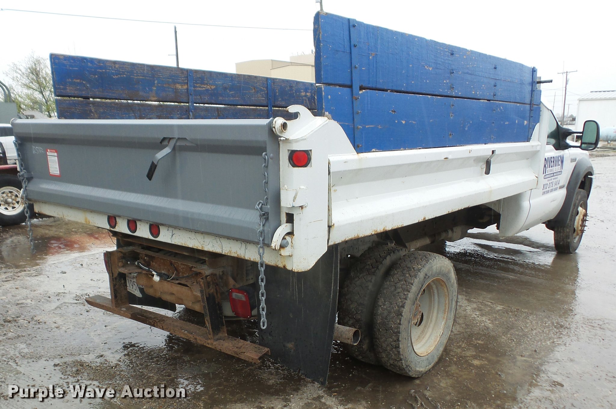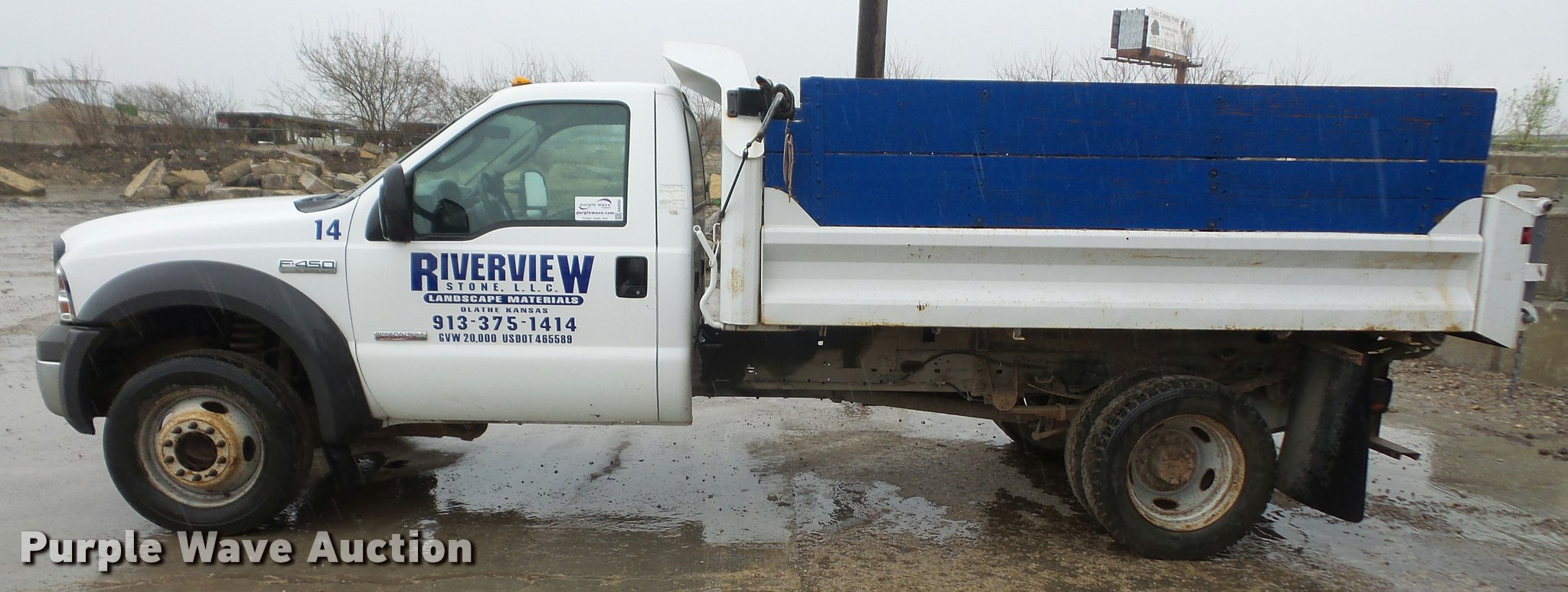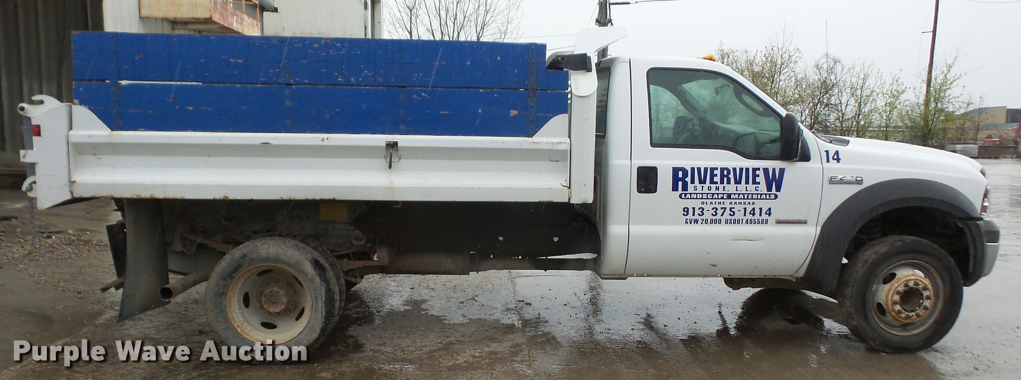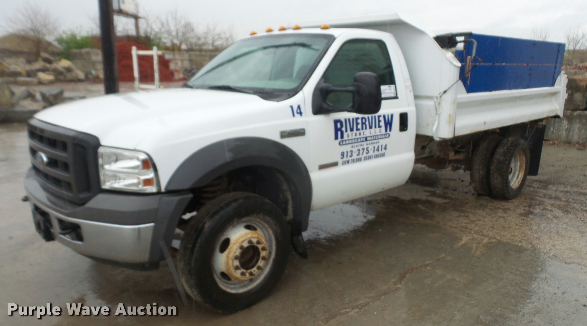 2005 Ford F450 dump truck. 174,347 miles on odometer, Navstar 6.0L V8 turbo diesel engine, Automatic transmission, Single axle, AC and heat, AM/FM, Steel dump bed 11'L x 96"W, 13" side height, 23" side board height, Single ram hoist Electric over hydraulic dump, Manual operated end gate, Roll tarp, Spring suspension, Hydraulic brakes, 225/70R19.5 tires, GVWR 16,000 lbs, Engine issues, Windshield cracked, Seat torn, Decals will be removed prior to auction. Kansas title. 1FDXF46P95EA31519. Riverview Stone. 901 E Old 56 Hwy. Olathe, KS 66061