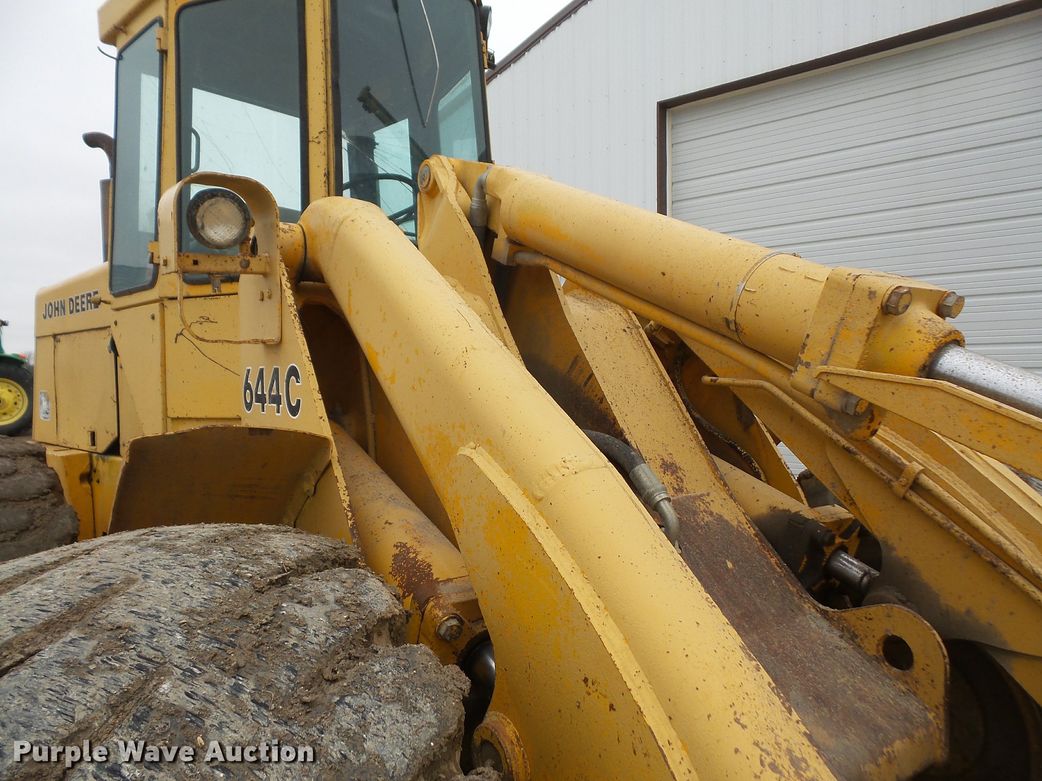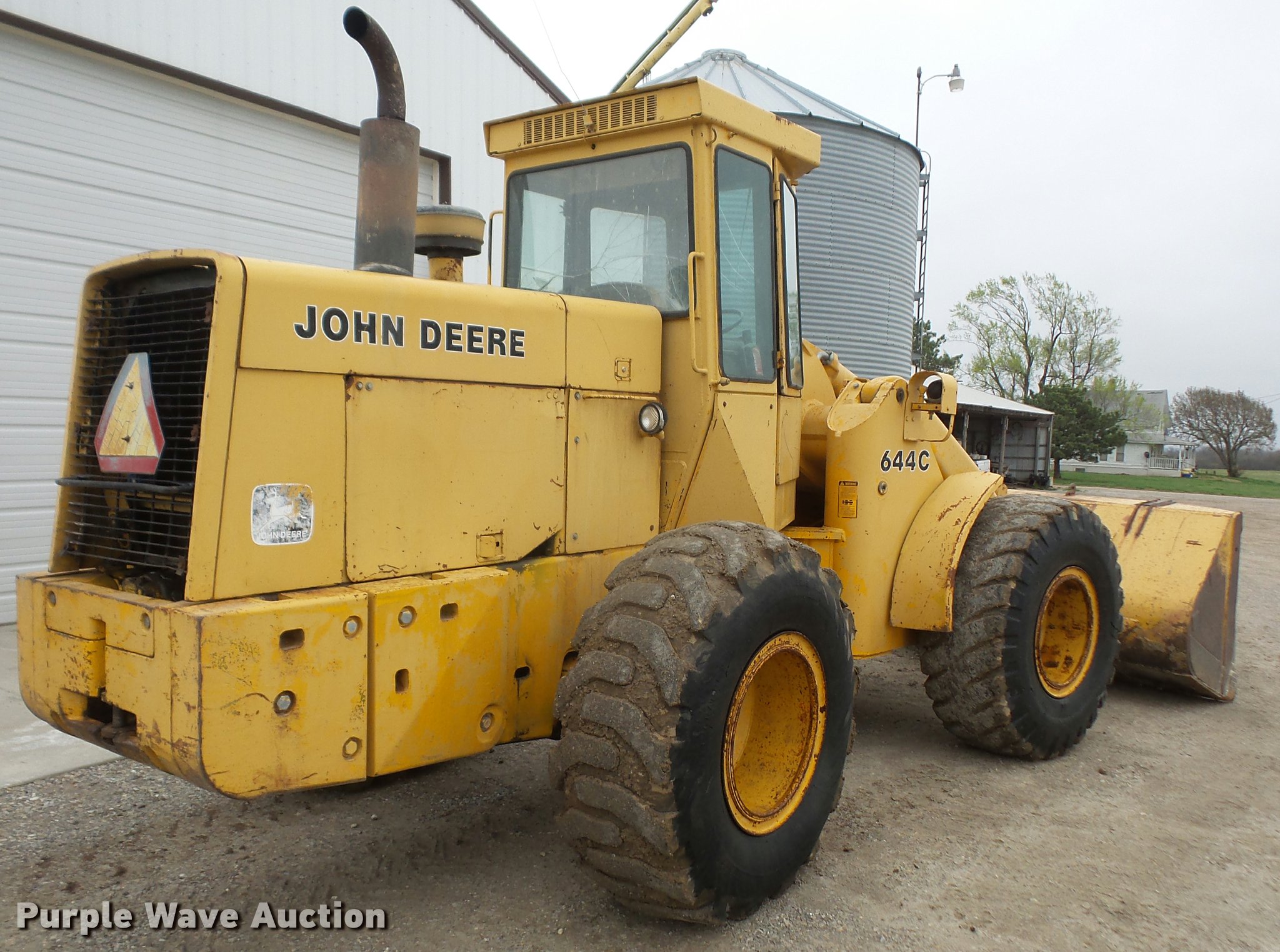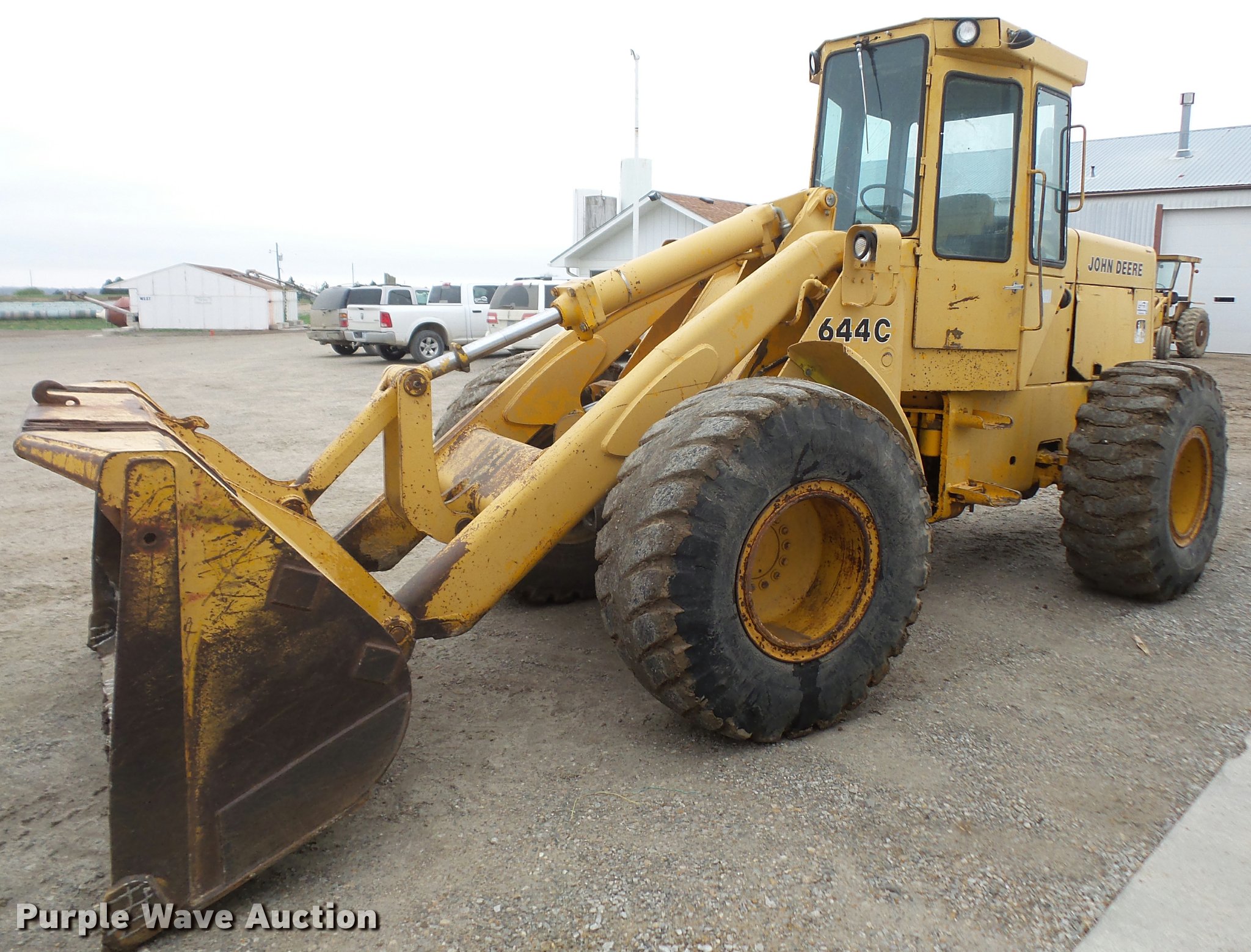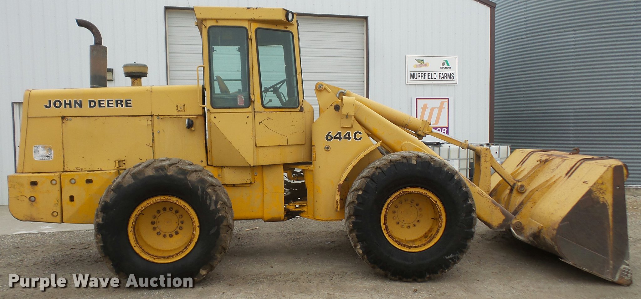 Purple Wave is selling a used Wheel Loader in Kansas. This item is a 1984 John Deere 644C wheel loader with the following: 2,439 hours on meter, John Deere 6466T six cylinder turbo diesel engine, 152 HP, Serial 352593, Powershift transmission, 2F-1R gears, Enclosed cab, EROPS, Heat, AM/FM, Suspension seat, Joystick bucket controls, Front work lights, John Deere 104"W general purpose bucket, 3 cu. yd. capacity, Counterweights, 20.5-25 tires, Engine over haul completed October 2012, Transmission and torque converter repaired at 2,388 hours on meter, Windshield cracked, One lift cylinder leaks, Serial DW644CB503575