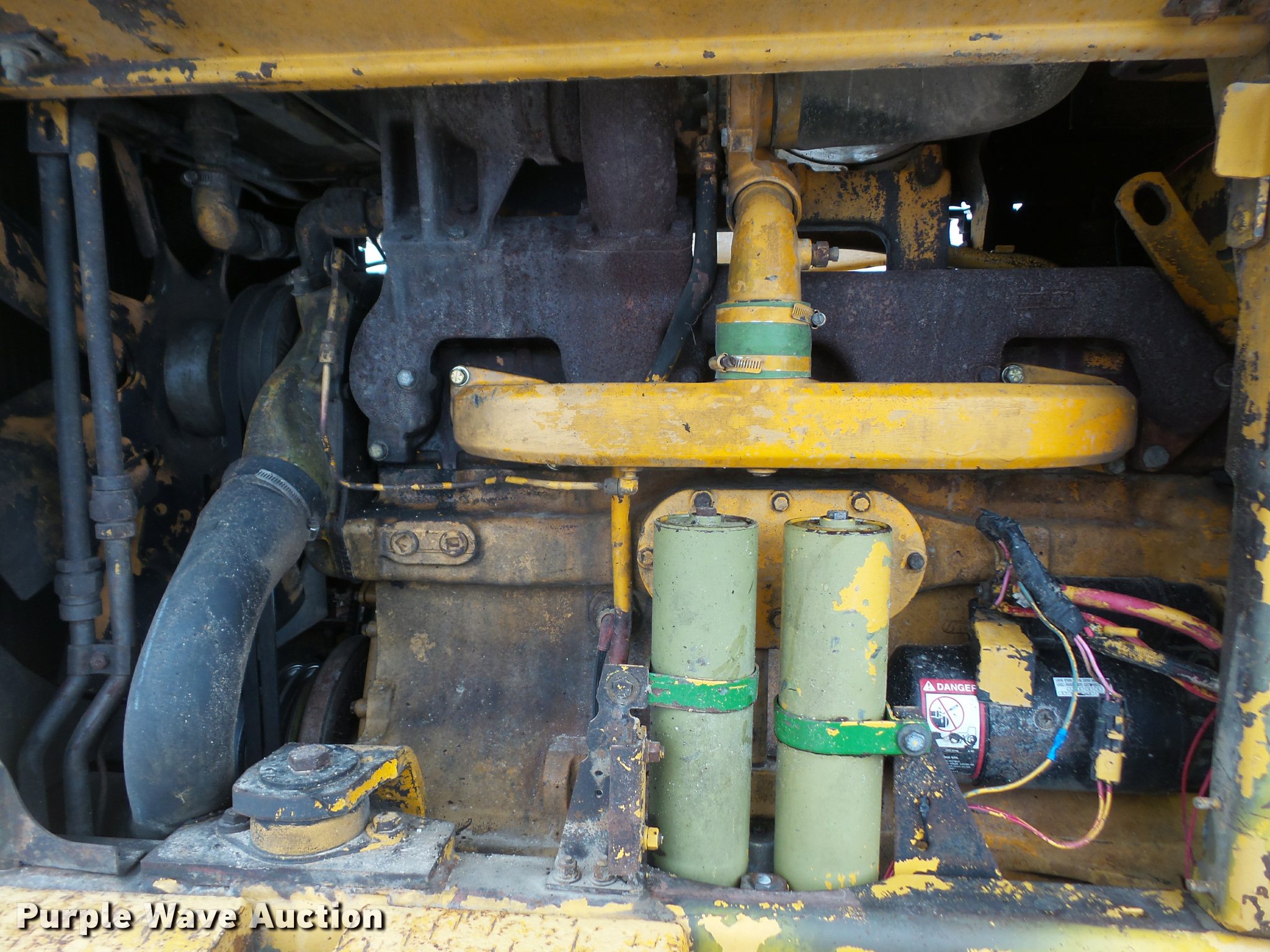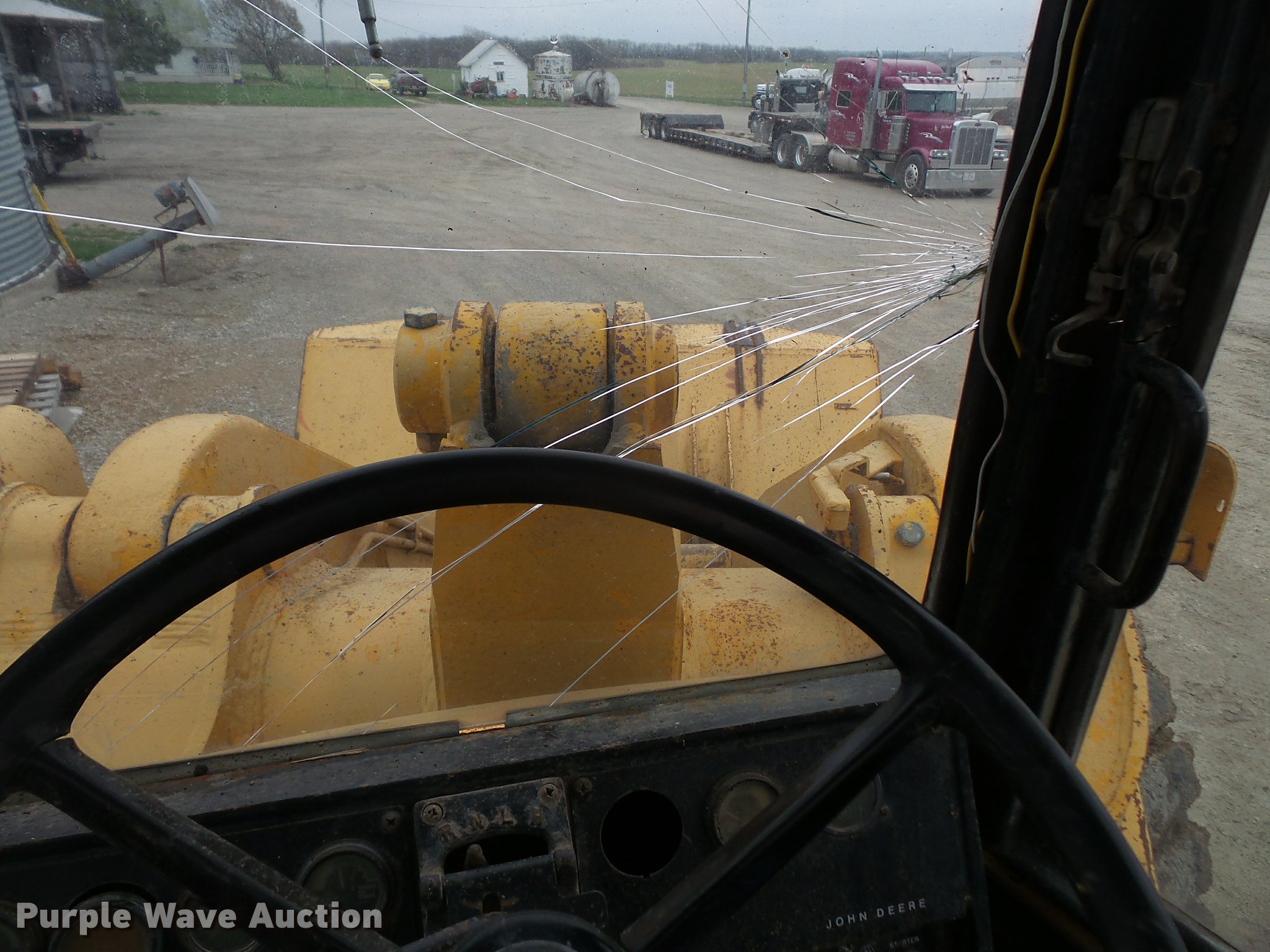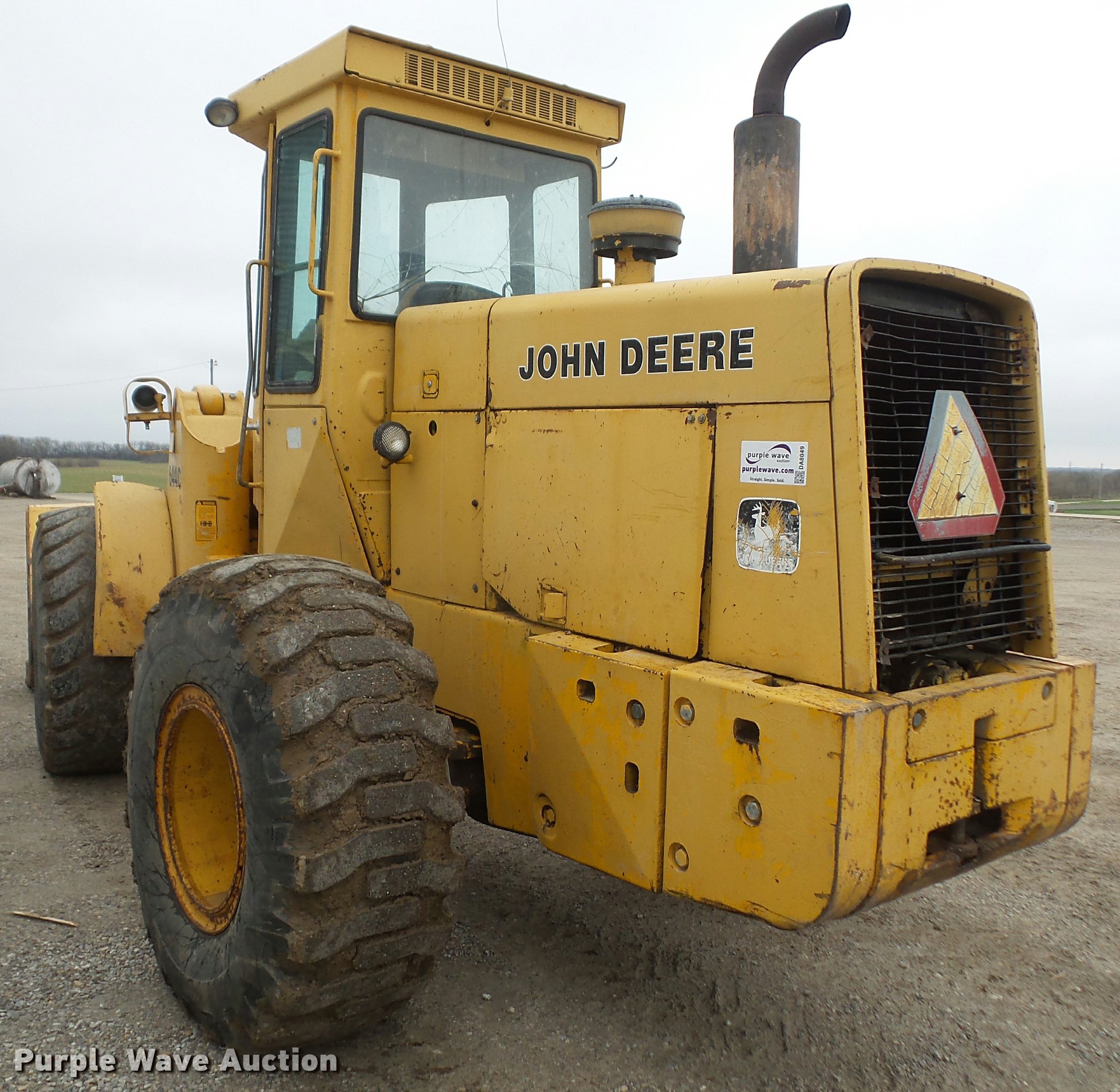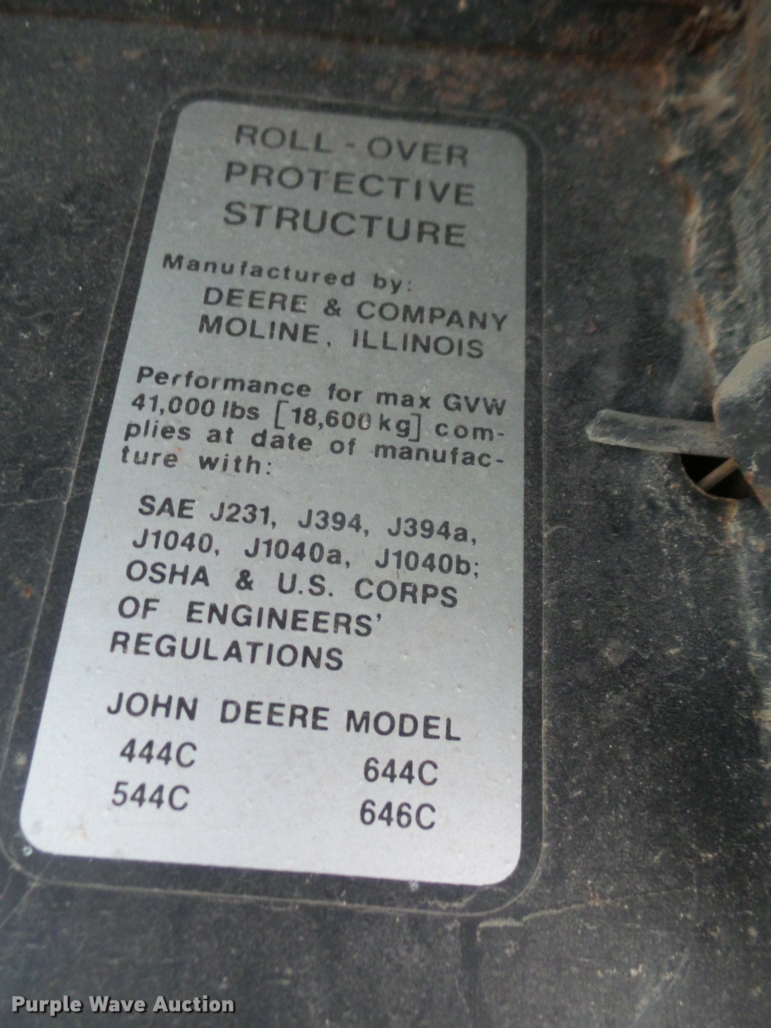 Purple Wave is selling a used Wheel Loader in Kansas. This item is a 1984 John Deere 644C wheel loader with the following: 2,439 hours on meter, John Deere 6466T six cylinder turbo diesel engine, 152 HP, Serial 352593, Powershift transmission, 2F-1R gears, Enclosed cab, EROPS, Heat, AM/FM, Suspension seat, Joystick bucket controls, Front work lights, John Deere 104"W general purpose bucket, 3 cu. yd. capacity, Counterweights, 20.5-25 tires, Engine over haul completed October 2012, Transmission and torque converter repaired at 2,388 hours on meter, Windshield cracked, One lift cylinder leaks, Serial DW644CB503575
