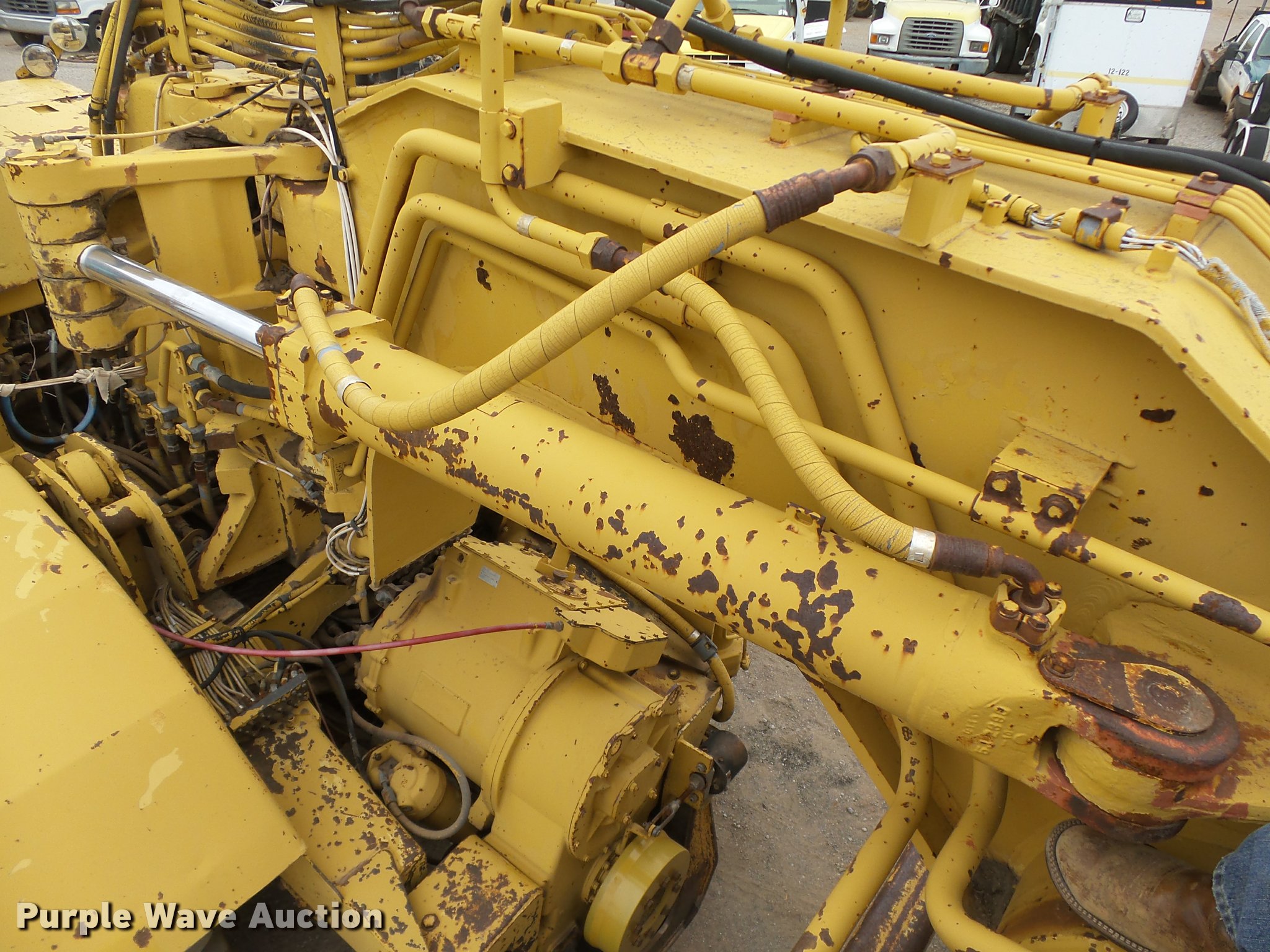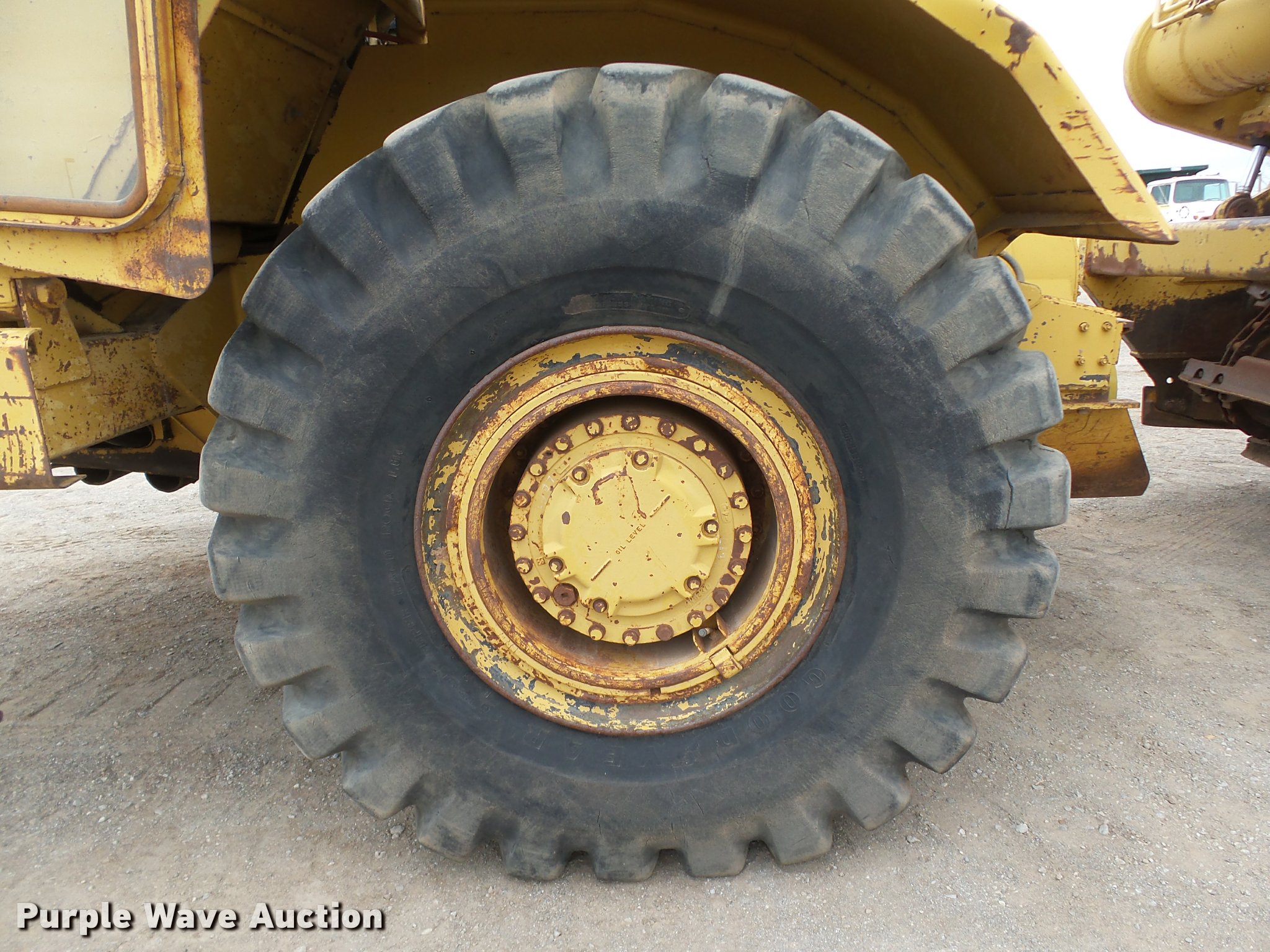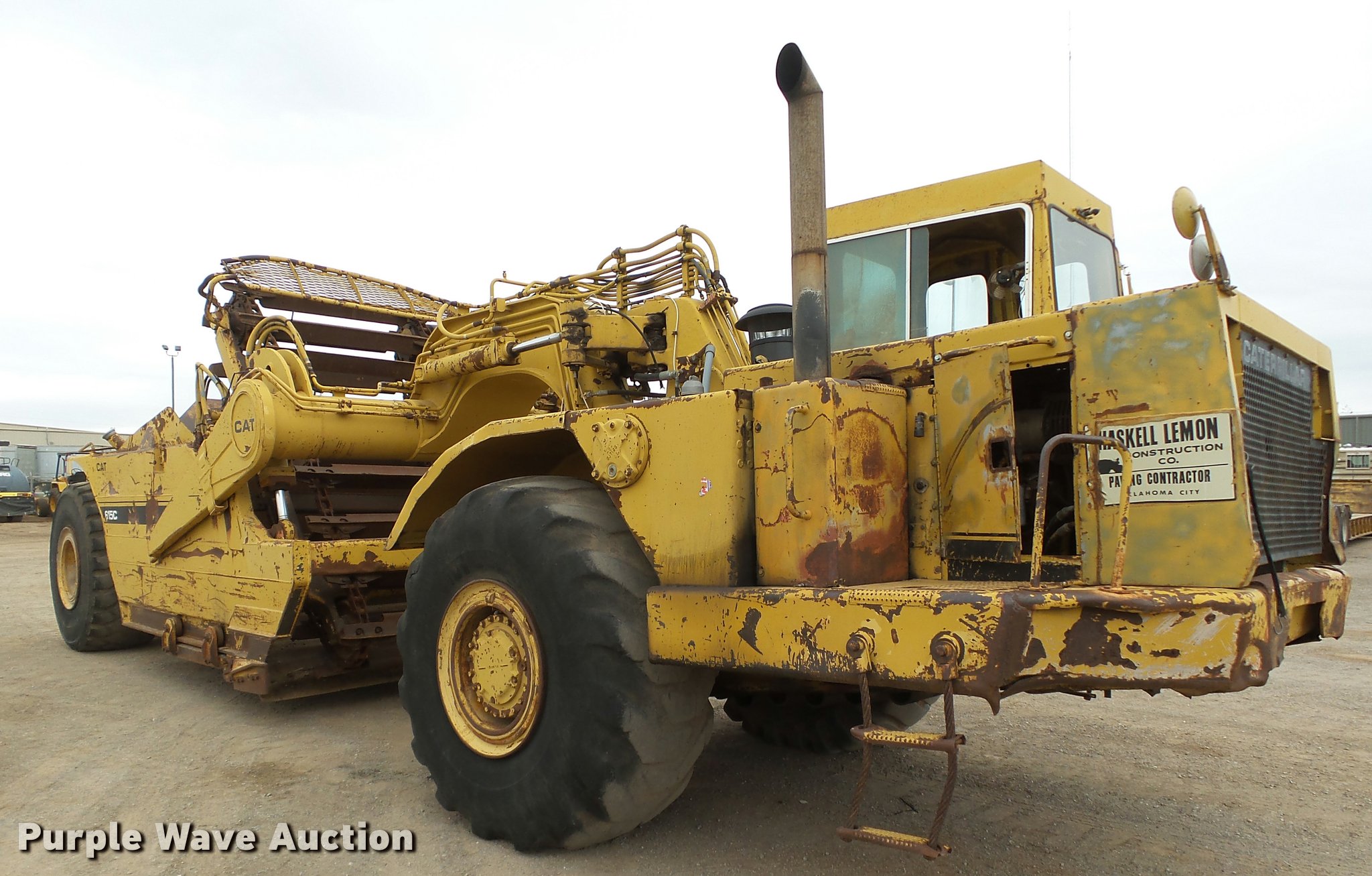 1989 Caterpillar 615C elevating scraper. 295 hours on meter, Caterpillar 3306 10.5L six cylinder turbo diesel engine 265 HP, Serial 08Z49263, Powershift transmission 6F-1R gears, Differential lock, Enclosed cab, 16 cu.yd. bowl capacity, Hydraulic lift, (3) lever controls, Rear push block, Rear pin hitch, Air brakes, 26.5R25 tires, Serial 5TF00185, Unit# 6-112. Haskell Lemon Construction Co.. 3800 SW 10th St. Oklahoma City, OK 73108