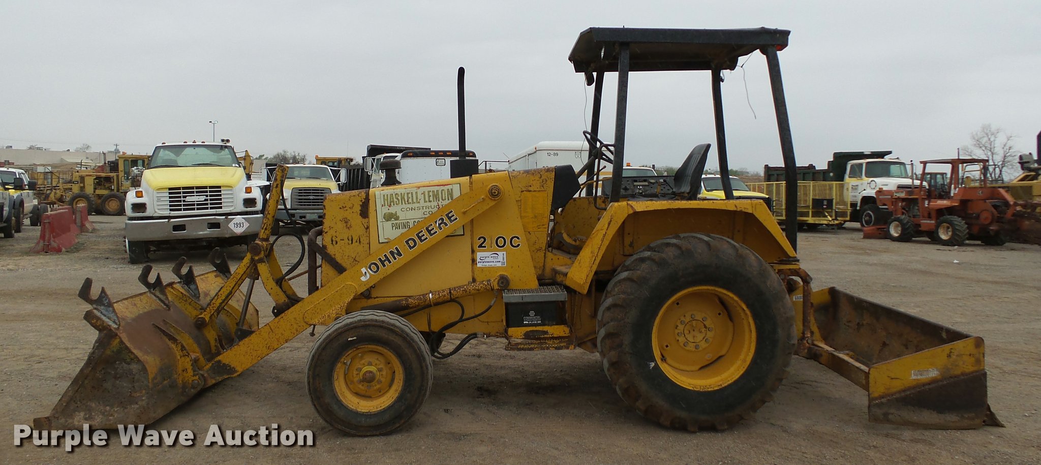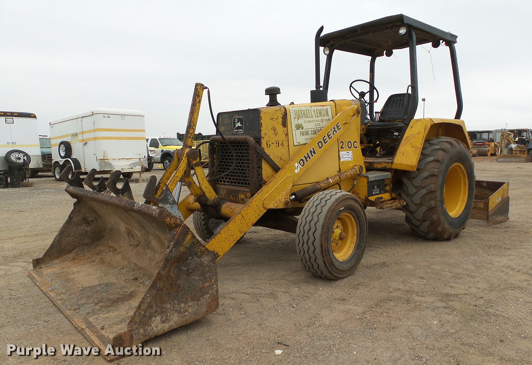 1986 John Deere 210C landscape tractor. 3,762 hours on meter, John Deere 4239DT002 3.9L four cylinder diesel engine Serial T04239D138692, Shuttle shift transmission 4F-4R gears, EROPS, Four stick blade controls, Front and rear work lights, 79"W loader bucket Bolt-on cutting edge, Auxiliary hydraulics, Gannon box blade 77"W, Front and rear cutting edges, 11L-15 front tires, 16.9-24 rear tires, Serial T0210C0726545, Unit# 6-94. Haskell Lemon Construction Co.. 3800 SW 10th St. Oklahoma City, OK 73108