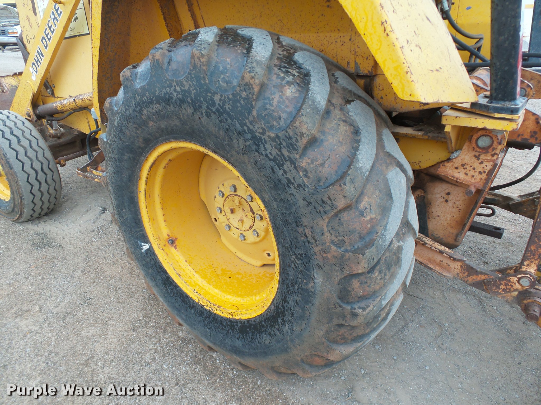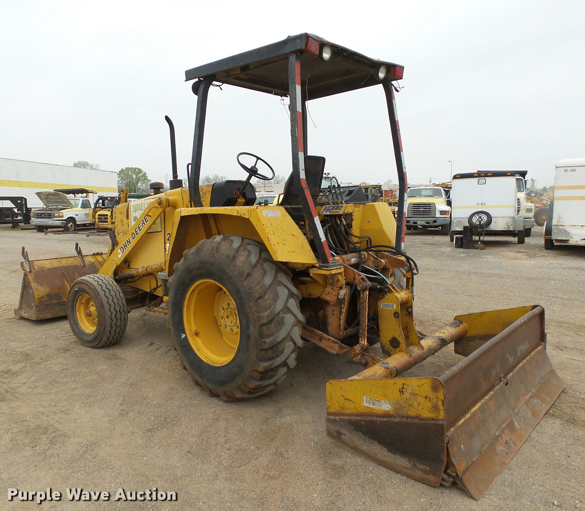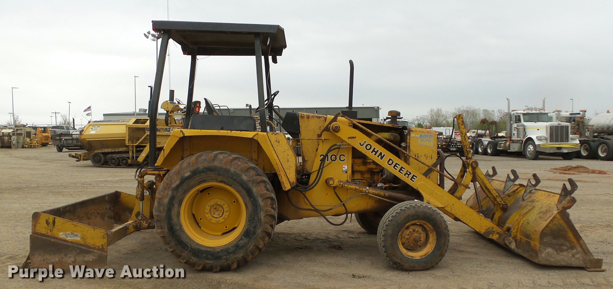 Purple Wave is selling a used Industrial Loader Tractor in Oklahoma. This item is a 1986 John Deere 210C landscape tractor with the following: 3,762 hours on meter, John Deere 4239DT002 3.9L four cylinder diesel engine, Serial T04239D138692, Shuttle shift transmission, 4F-4R gears, EROPS, Four stick blade controls, Front and rear work lights, 79"W loader bucket, Bolt-on cutting edge, Auxiliary hydraulics, Gannon box blade, 77"W, Front and rear cutting edges, 11L-15 front tires, 16.9-24 rear tires, Serial T0210C0726545, Unit# 6-94
