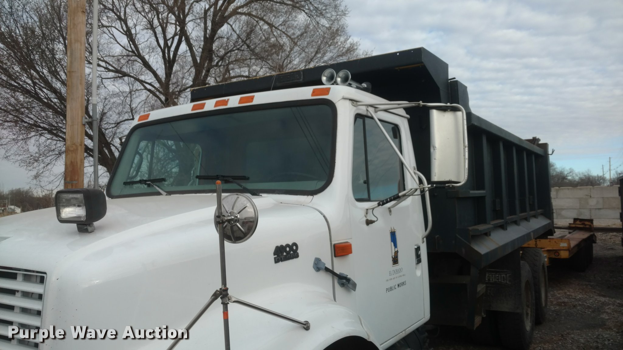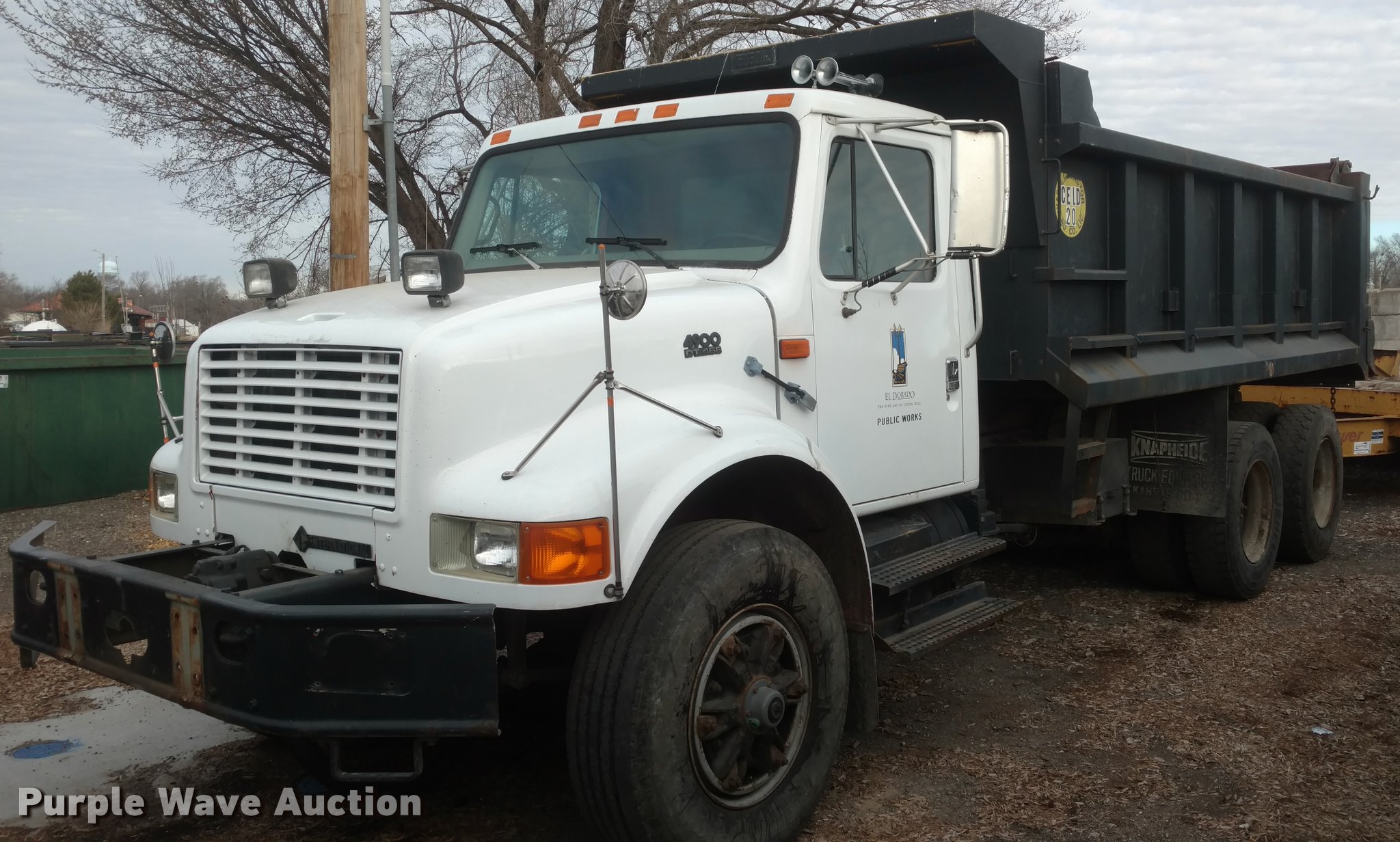 1997 International 4900 dump truck. 65,185 miles on odometer Actual mileage unknown, 13,681 hours on meter, Interntaional DT466 7.6L L6 diesel engine, Automatic transmission, Tandem axle, Heat, AM/FM, Spring suspension seat, Front mounted PTO, 15'L steel dump bed Single ram hoist, Air operated end gate, Spring suspension, Air brakes, 385/80R22.5 front tires, 11R22.5 rear tires, Frame rusted through between the tandem axles. Kansas title. 1HTSHAAT9VH391483. City of El Dorado. El Dorado, KS 67042
