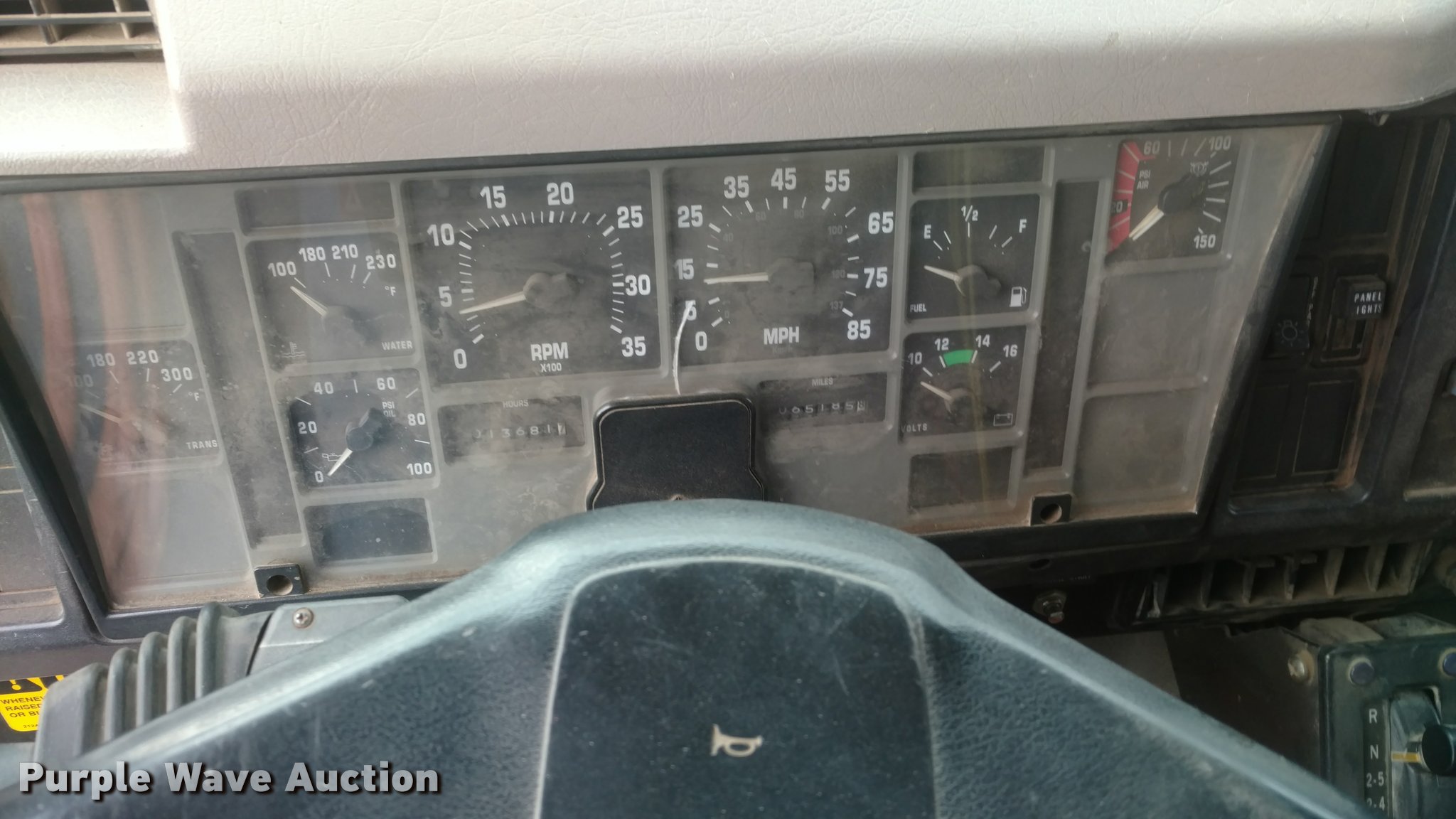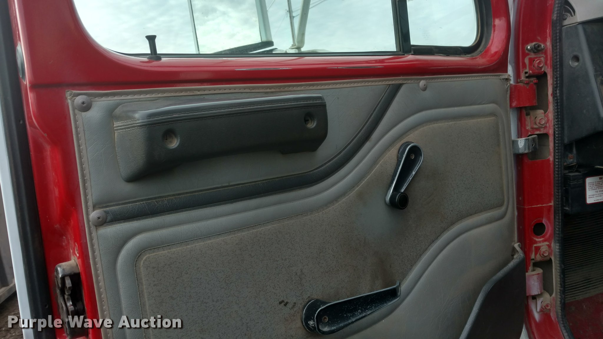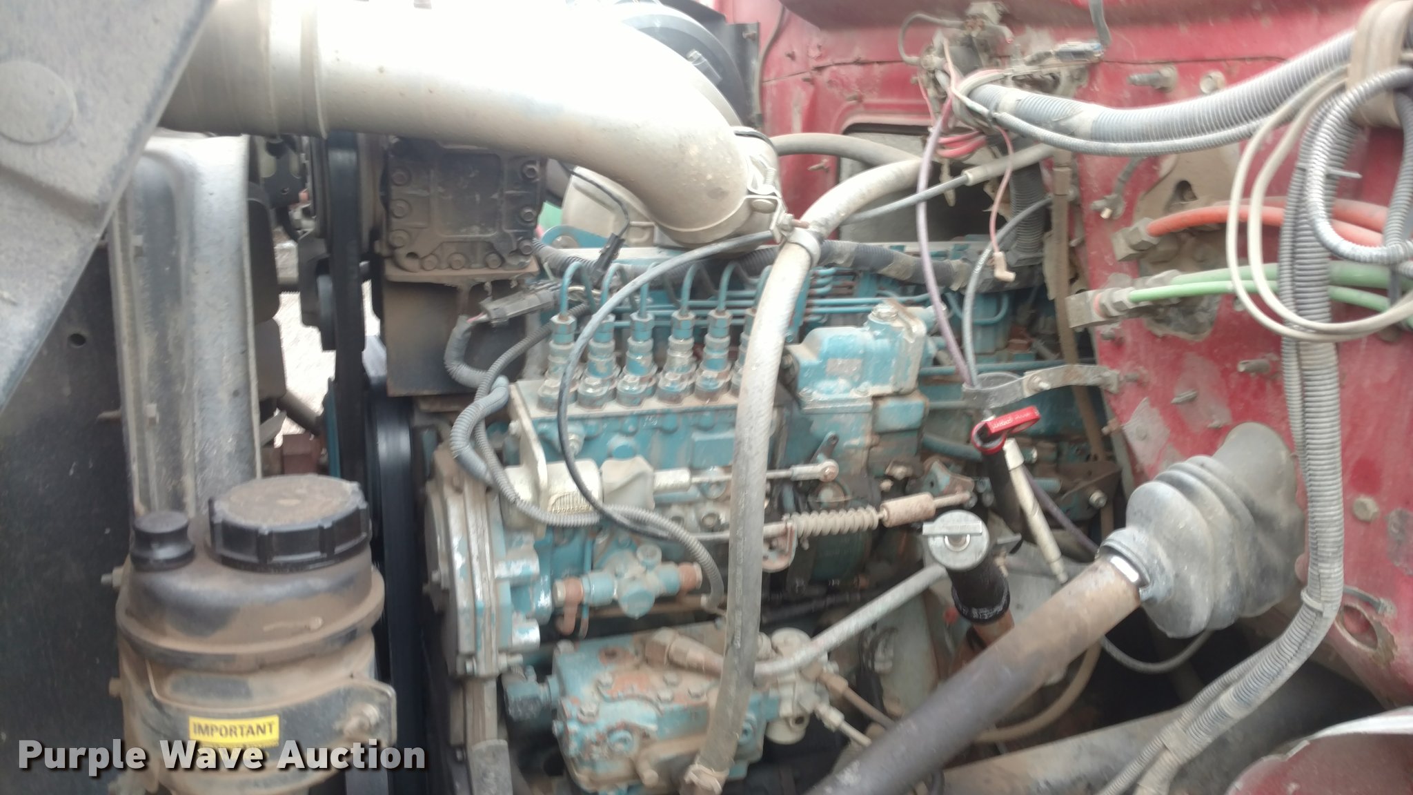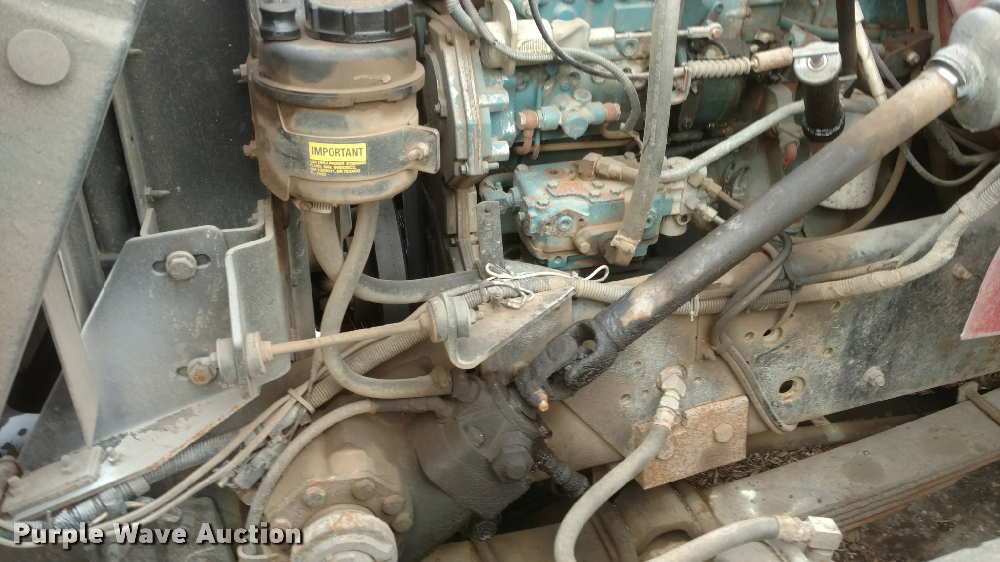 Purple Wave is selling a used Construction Dump Truck in Kansas. This item is a 1997 International 4900 dump truck with the following: 65,185 miles on odometer, Actual mileage unknown, 13,681 hours on meter, Interntaional DT466 7.6L L6 diesel engine, Automatic transmission, Tandem axle, Heat, AM/FM, Spring suspension seat, Front mounted PTO, 15'L steel dump bed, Single ram hoist, Air operated end gate, Spring suspension, Air brakes, 385/80R22.5 front tires, 11R22.5 rear tires, Frame rusted through between the tandem axles