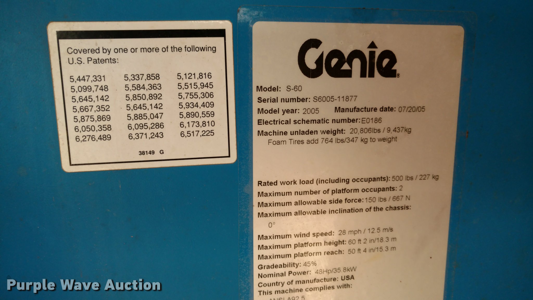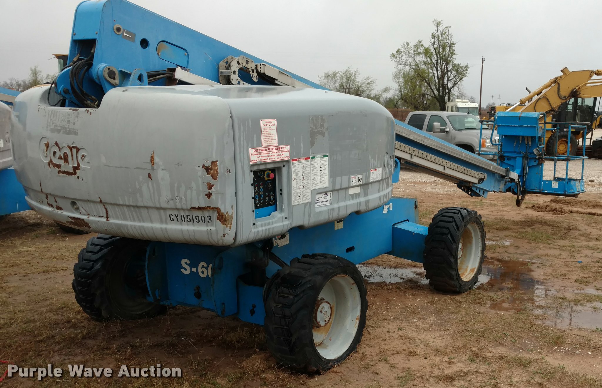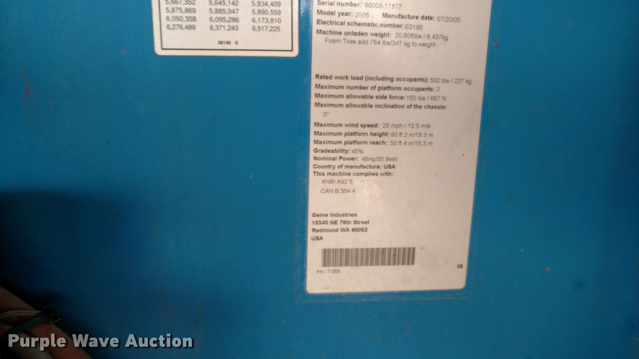 Purple Wave is selling a used Boom Lift in Oklahoma. This item is a 2005 Genie S60 boom lift with the following: 2,760 hours on meter, Deutz three cylinder diesel engine, Hydrostatic transmission, Four wheel drive, 500 lbs maximum lift capacity, Approximately 60' maximum lift height, 360 degree turn table, Articulating basket, Platform and ground controls, 355/55D625 tires, Serial S6005-11877