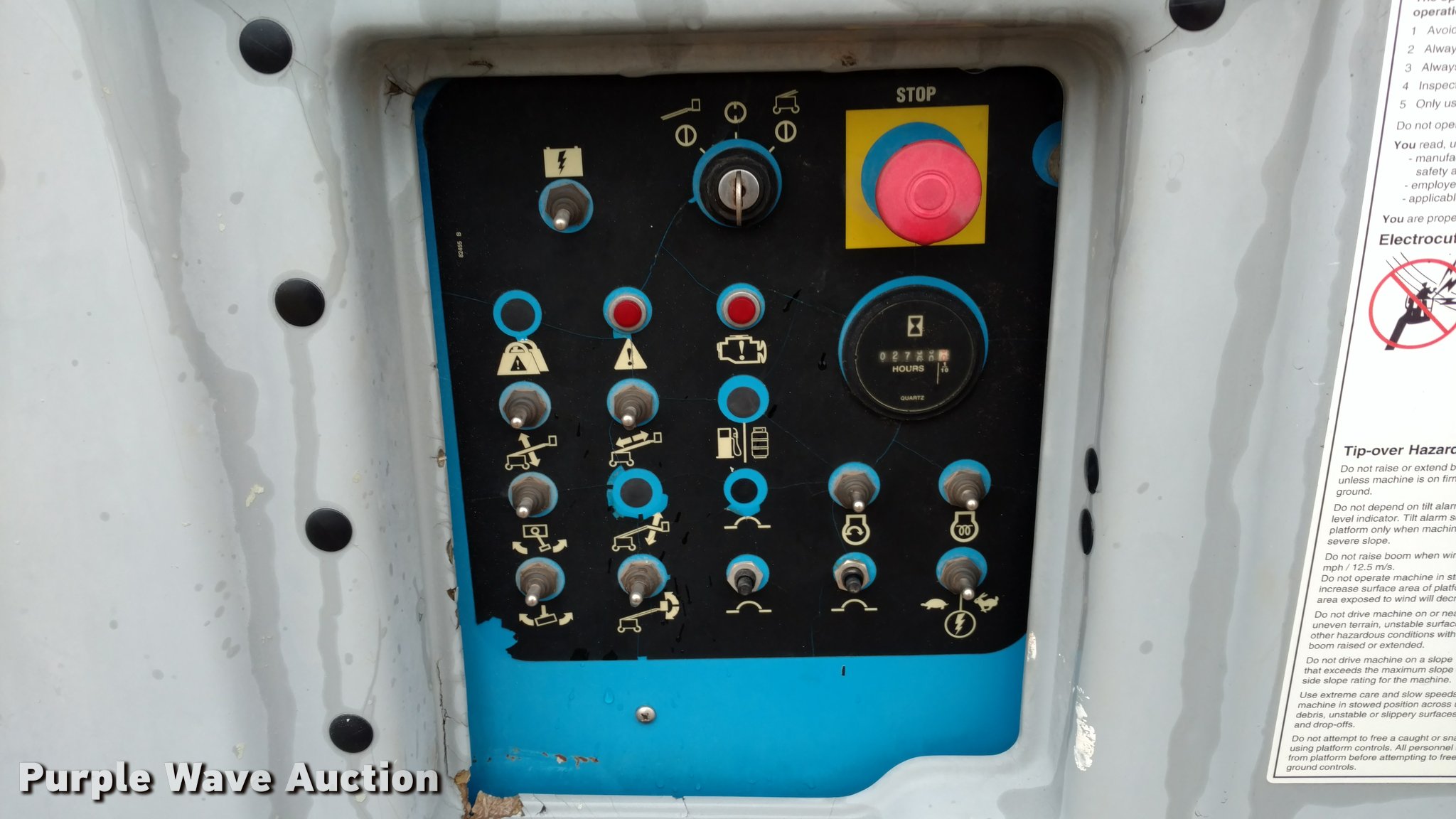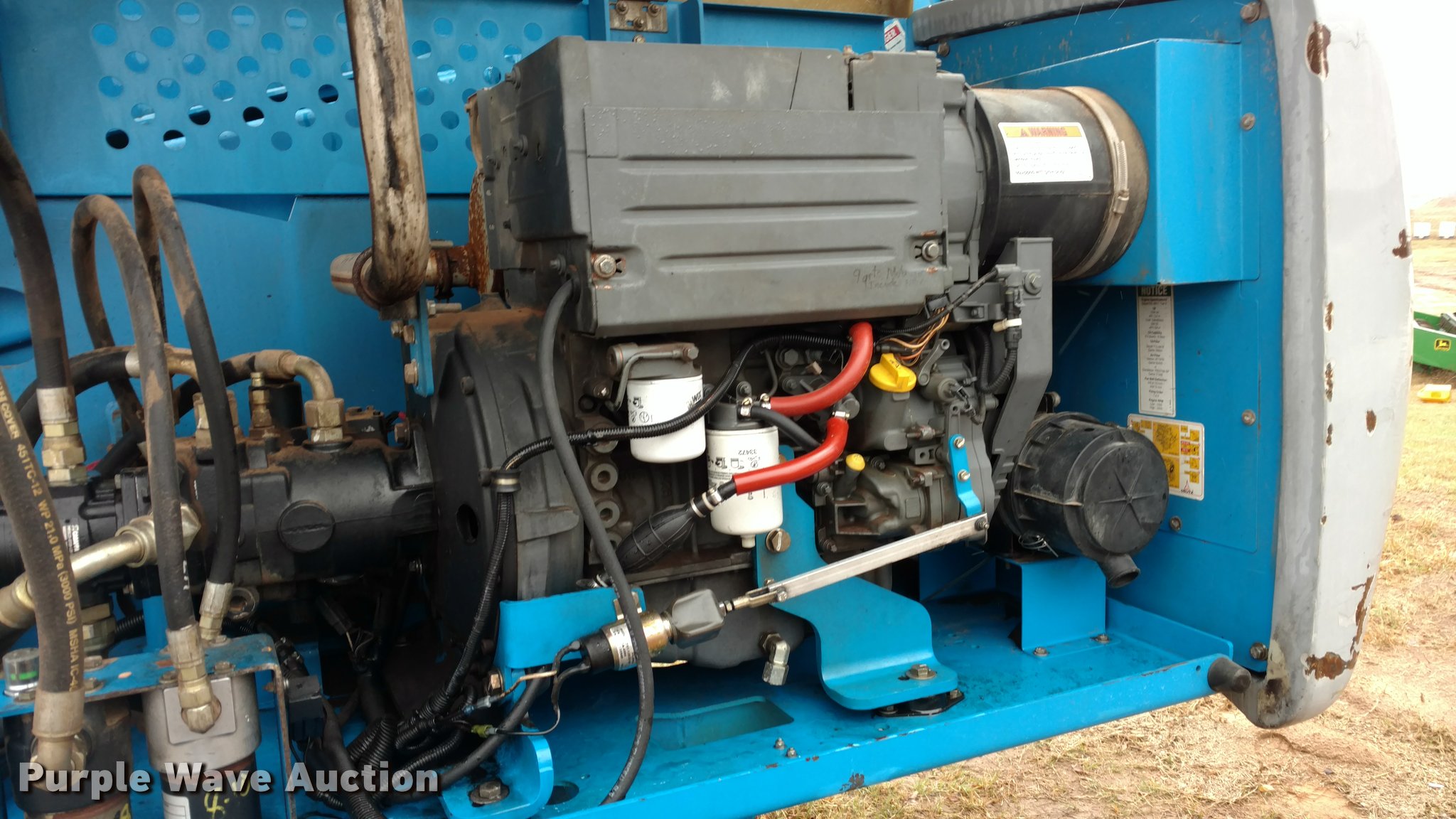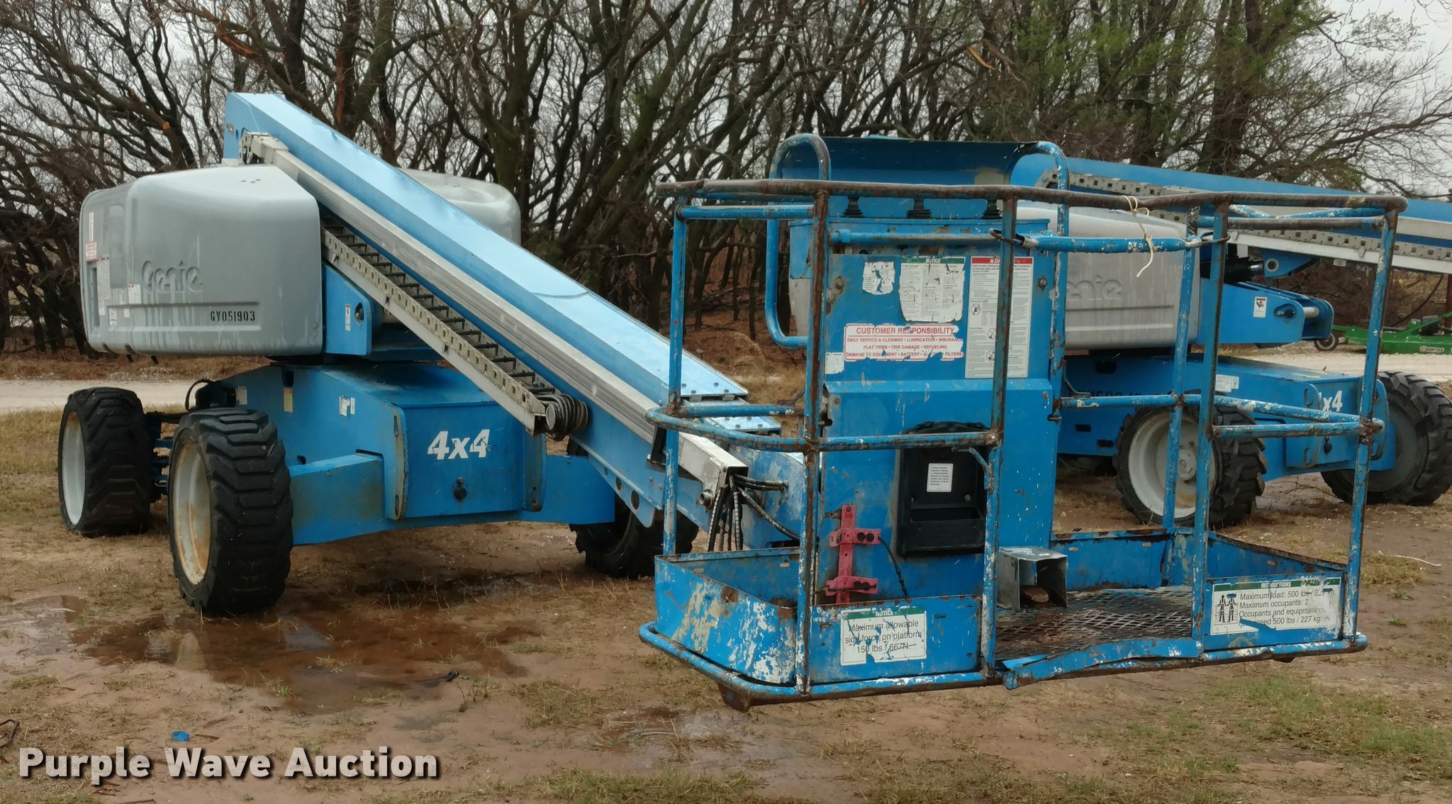 Purple Wave is selling a used Boom Lift in Oklahoma. This item is a 2005 Genie S60 boom lift with the following: 2,760 hours on meter, Deutz three cylinder diesel engine, Hydrostatic transmission, Four wheel drive, 500 lbs maximum lift capacity, Approximately 60' maximum lift height, 360 degree turn table, Articulating basket, Platform and ground controls, 355/55D625 tires, Serial S6005-11877