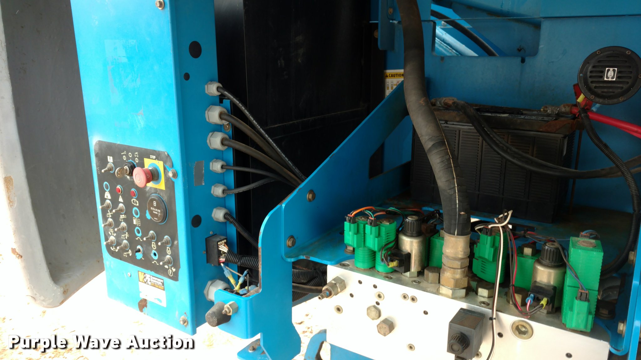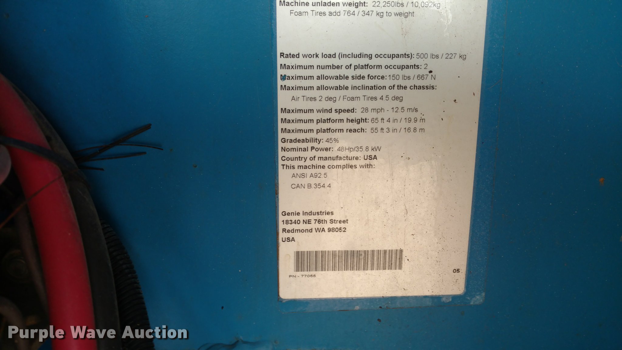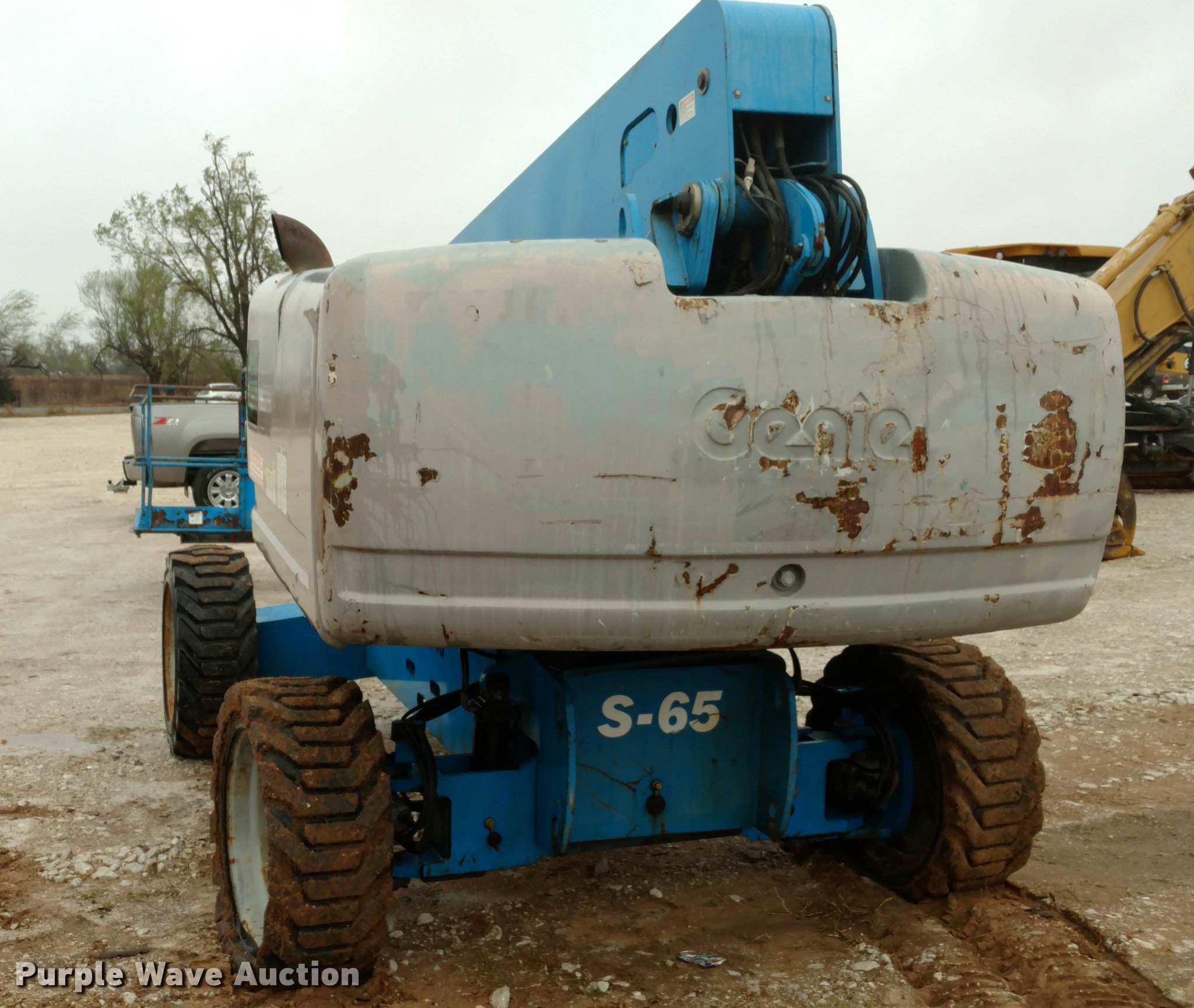 Purple Wave is selling a used Boom Lift in Oklahoma. This item is a 2005 Genie S65 boom lift with the following: 5,400 hours on meter, Deutz three cylinder diesel engine, Hydrostatic transmission, Four wheel drive, 500 lbs maximum lift capacity, Approximately 65' maximum lift height, 360 degree turn table, Platform and ground controls, 355/55D625 tires, Serial S6005-11281