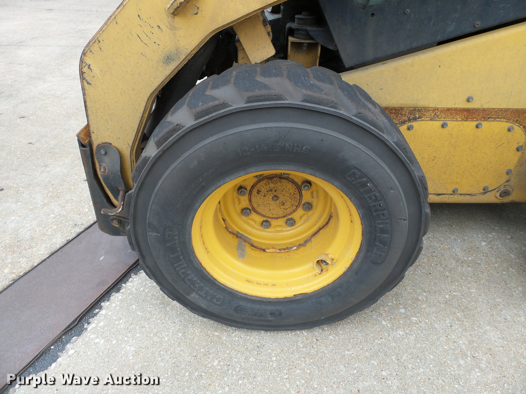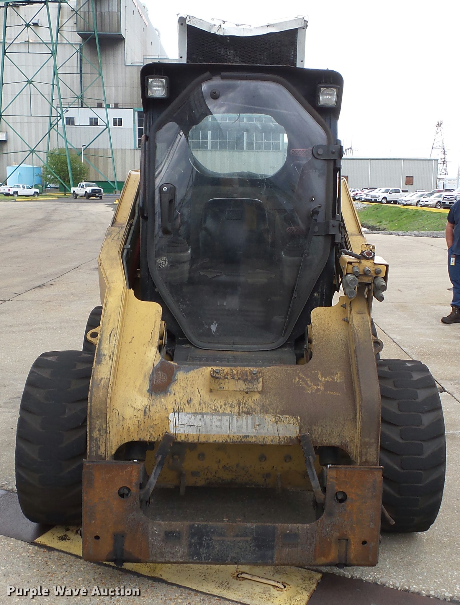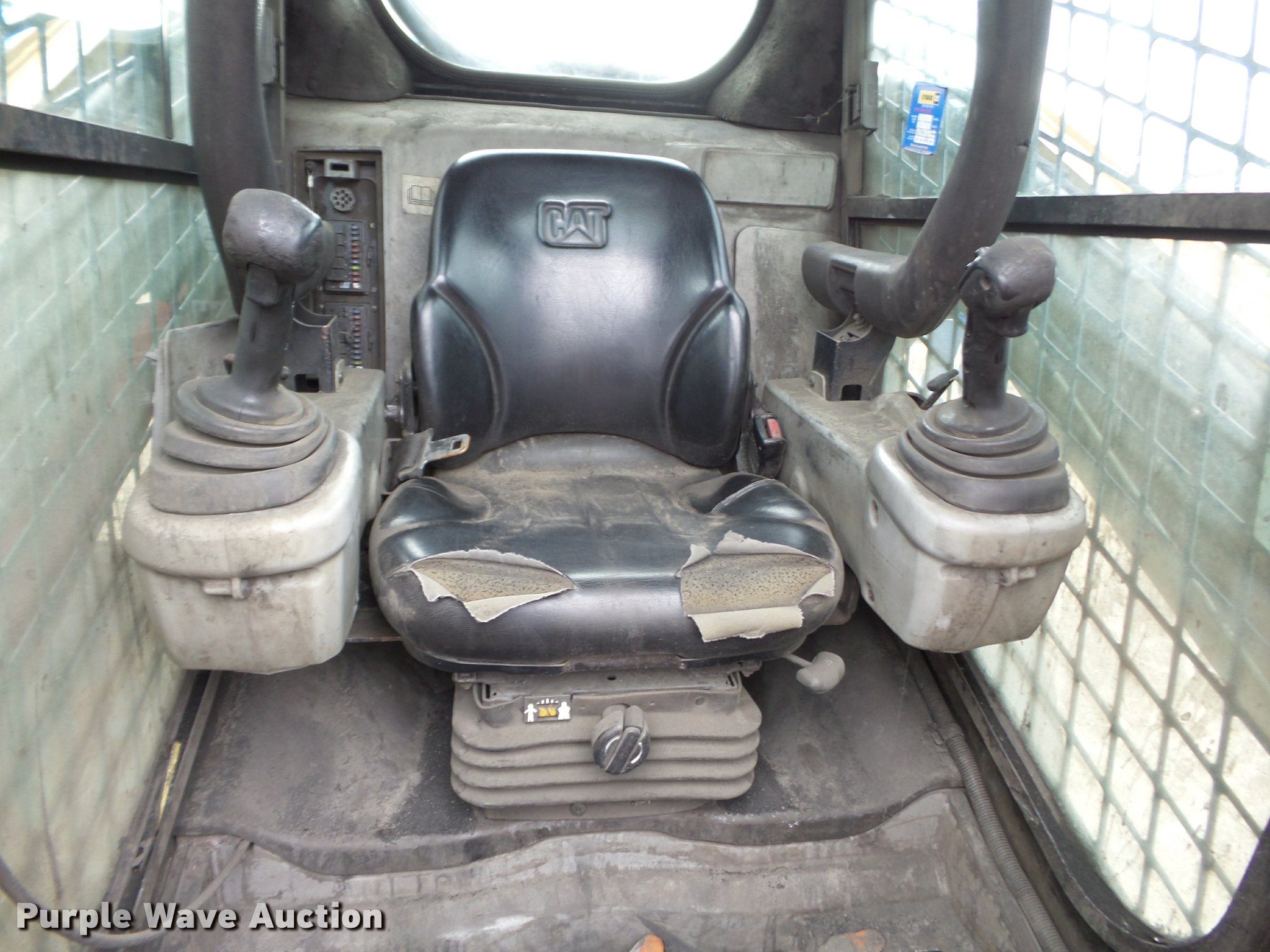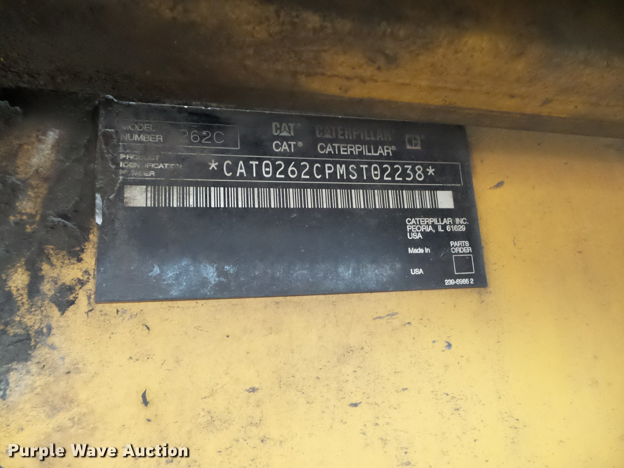 Purple Wave is selling a used Skid Steer Loader in Missouri. This item is a 2008 Caterpillar 262C skid steer with the following: 6,229 hours on meter, Four cylinder turbo diesel engine, Two speed hydrostatic transmission, Enclosed cab, AC and heat, Unknown operating condition of AC, Joystick controls, Suspension seat, Front and rear work lights, Wipers, Backup alarm, High flow auxiliary hydraulics, Auxiliary electrical outlet, 72"W bucket, Bolt-on cutting edge, Caterpillar 12-16.5 tires, Bucket cracked, Attachment latches inoperable, Serial 0262CPMST02238