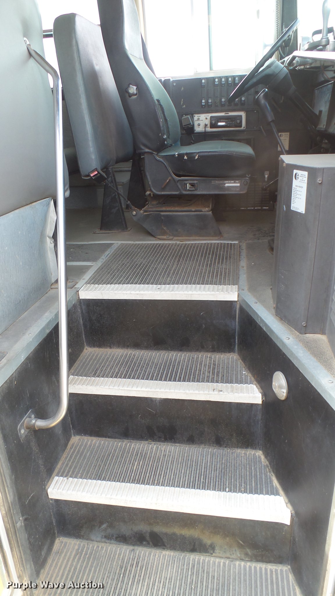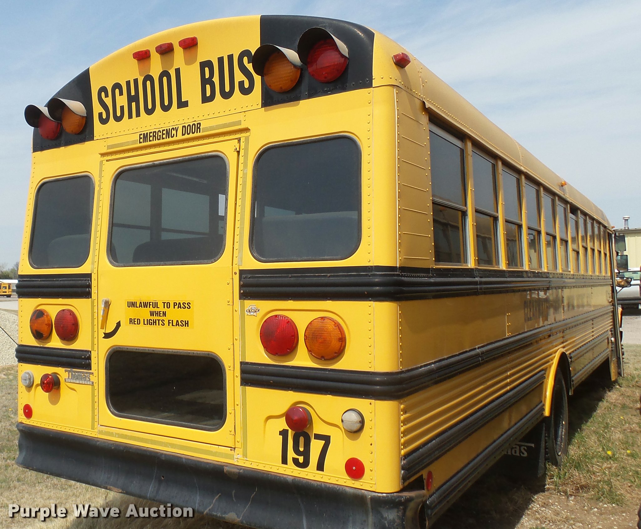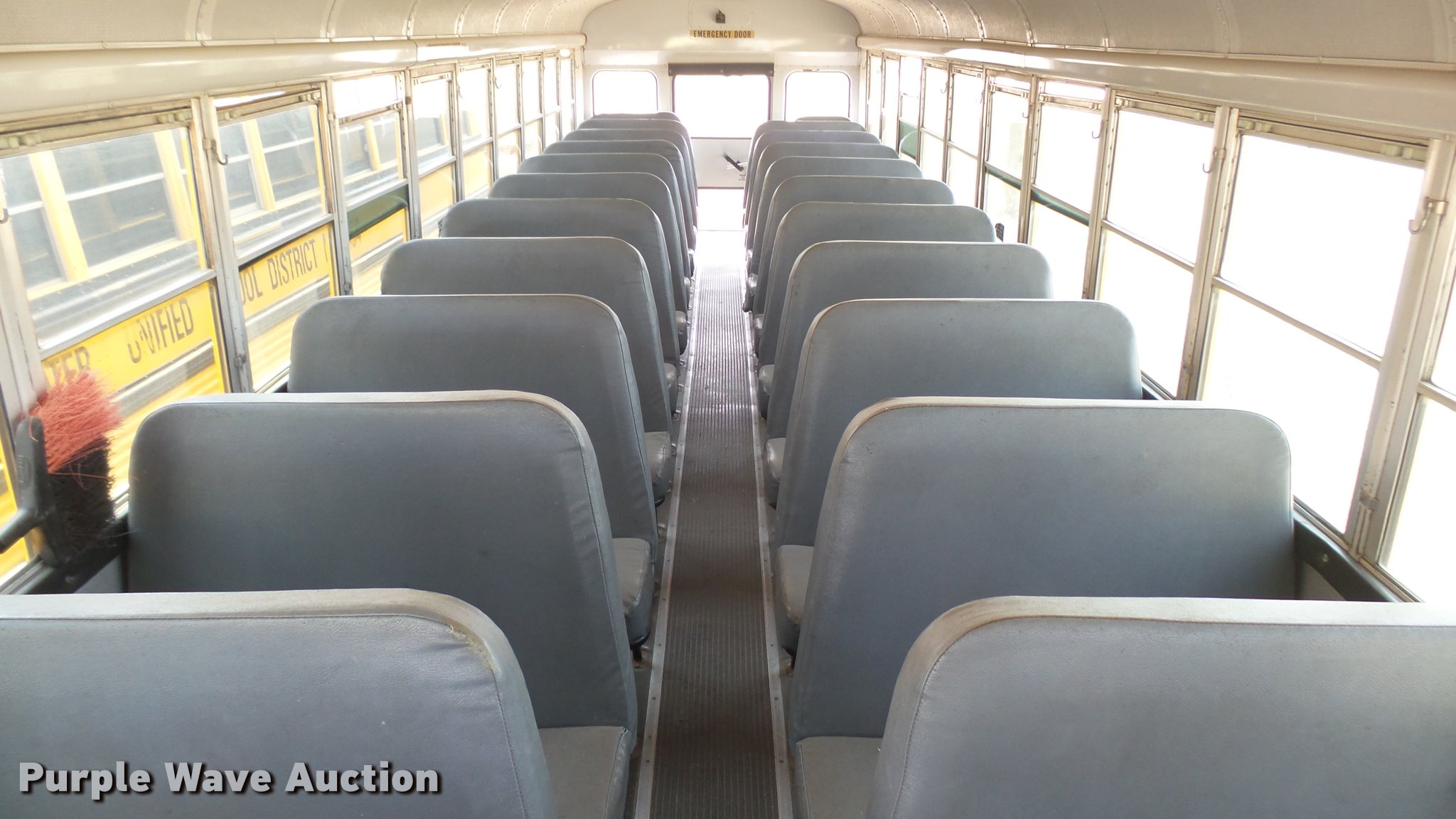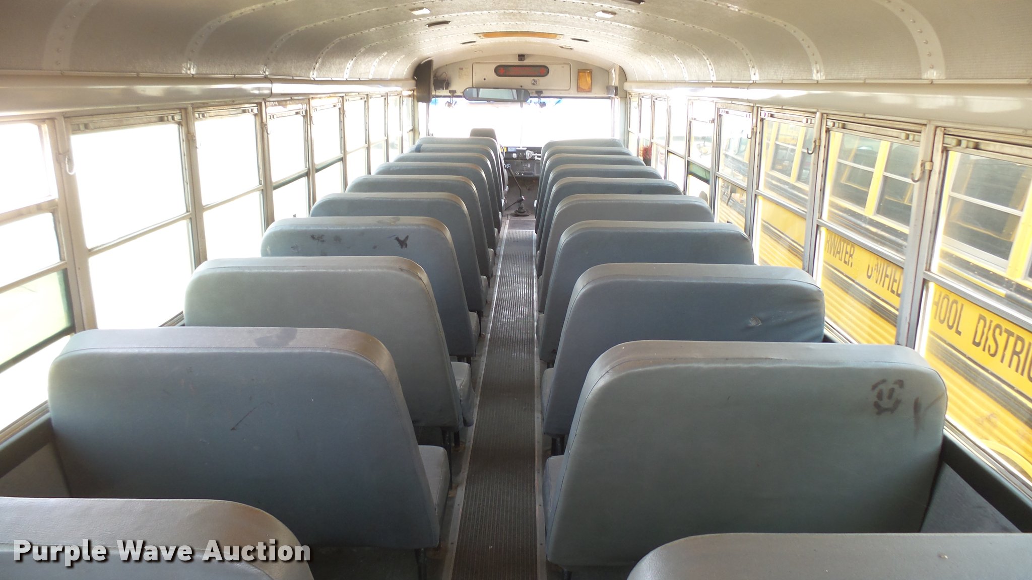 Purple Wave is selling a used Bus in Kansas. This item is a 1997 International 3800 school bus with the following: 142,806 miles on odometer, International T444 7.3L V8 diesel engine, Spicer five speed manual transmission, Heat, AM/FM/cassette, Manual windows and locks, Vinyl interior, 65 passenger capacity, Full light package, Front tow hooks, Hydraulic brakes, 10R22.5 tires, Paint faded/peeling, Weak battery, Unit# 197