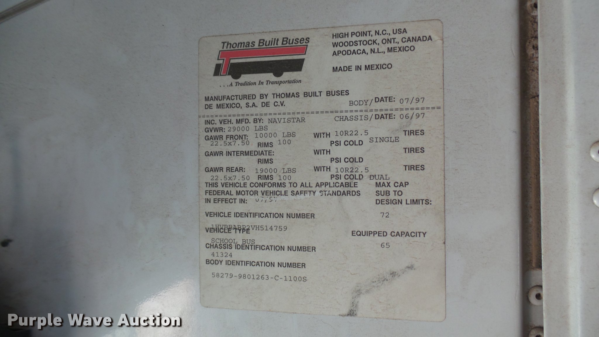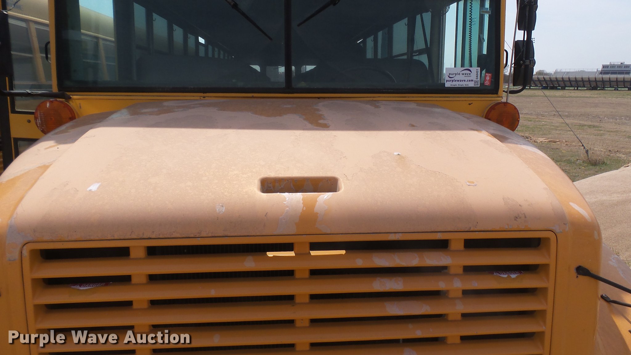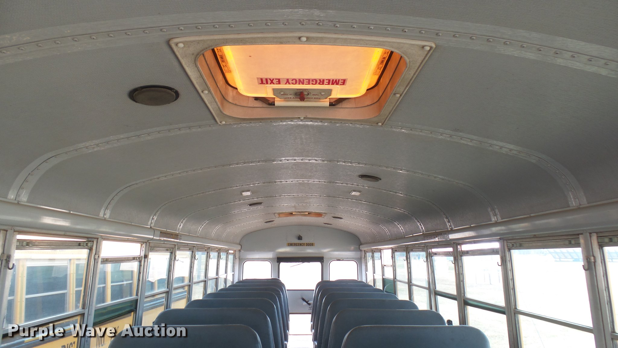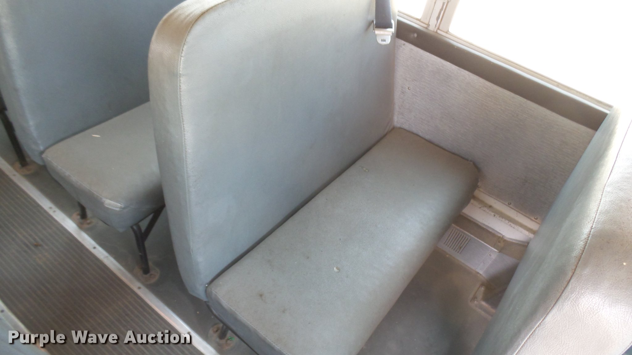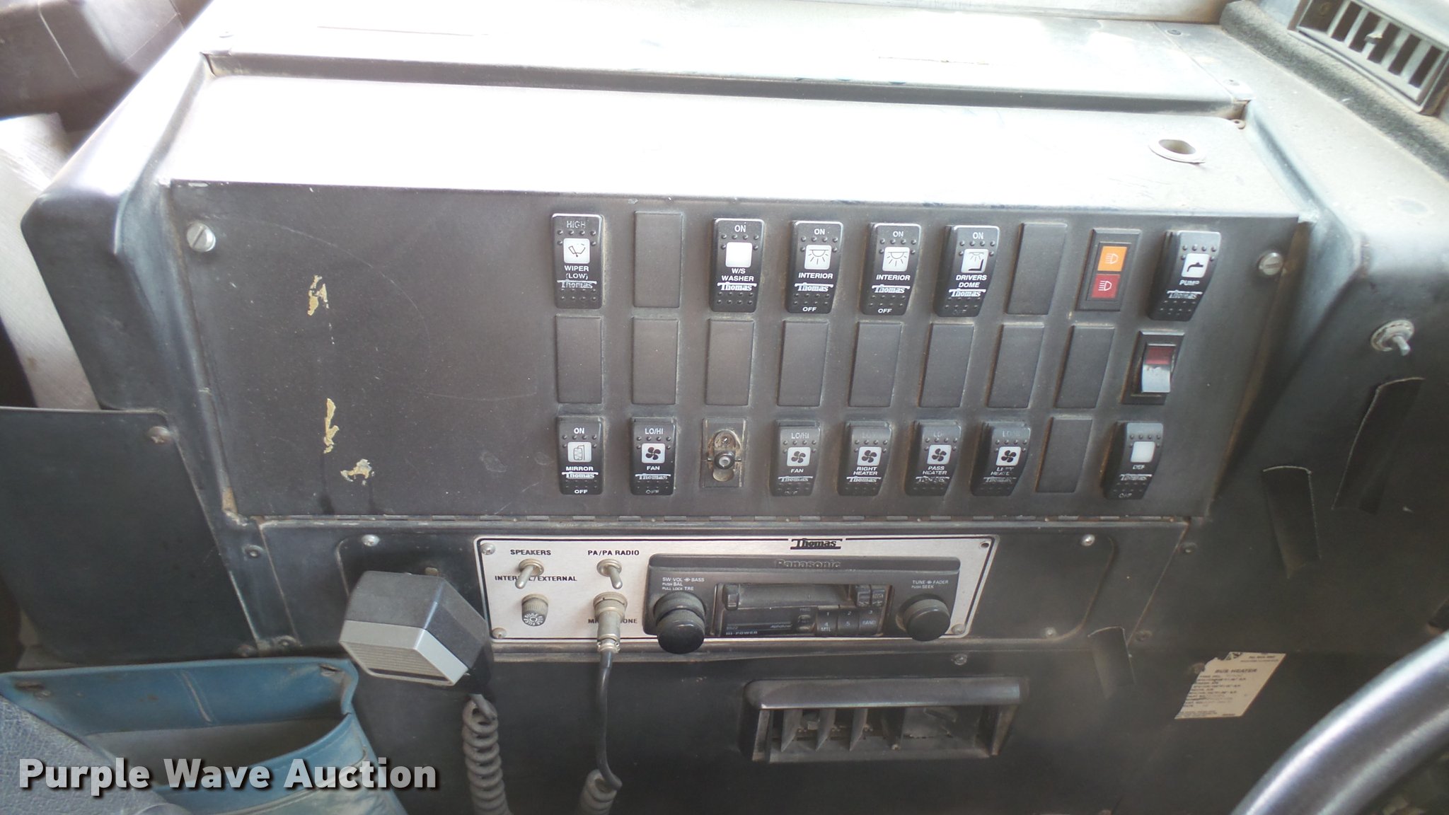Purple Wave is selling a used Bus in Kansas. This item is a 1997 International 3800 school bus with the following: 142,806 miles on odometer, International T444 7.3L V8 diesel engine, Spicer five speed manual transmission, Heat, AM/FM/cassette, Manual windows and locks, Vinyl interior, 65 passenger capacity, Full light package, Front tow hooks, Hydraulic brakes, 10R22.5 tires, Paint faded/peeling, Weak battery, Unit# 197