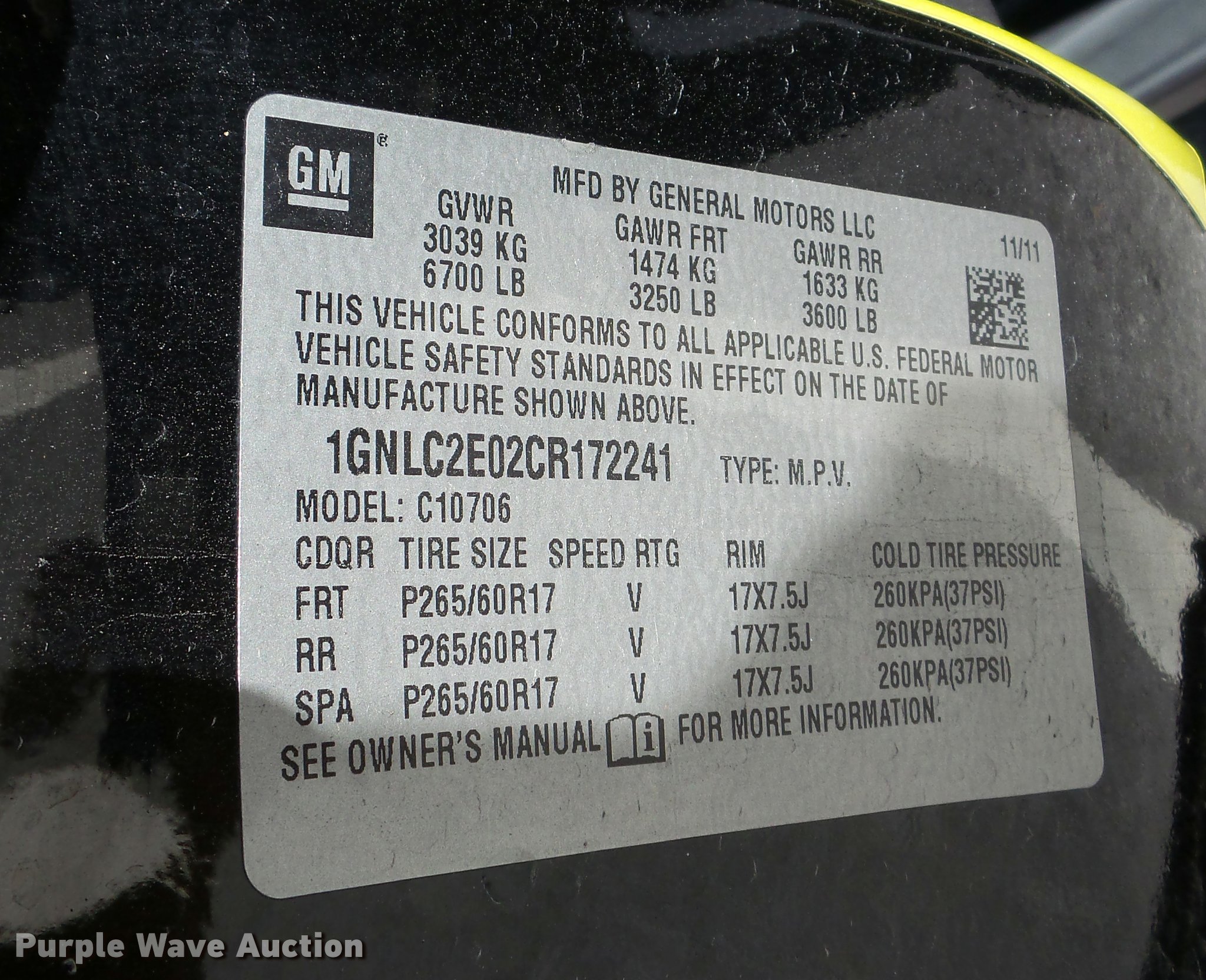 Purple Wave is selling a used Passenger Vehicle in Kansas. This item is a 2012 Chevrolet Tahoe Police SUV with the following: 105,467 miles on odometer, 5.3L V8 OHV 16V FFV gas engine, Automatic transmission, AC and heat, Tilt, Cruise, AM/FM, Power windows, locks, mirrors, and seat, Cloth interior, P265/60R17 tires, Non-operational vehicle, Camshaft bearings are bad, Law enforcement equipment will be removed prior to auction, Unit# 52