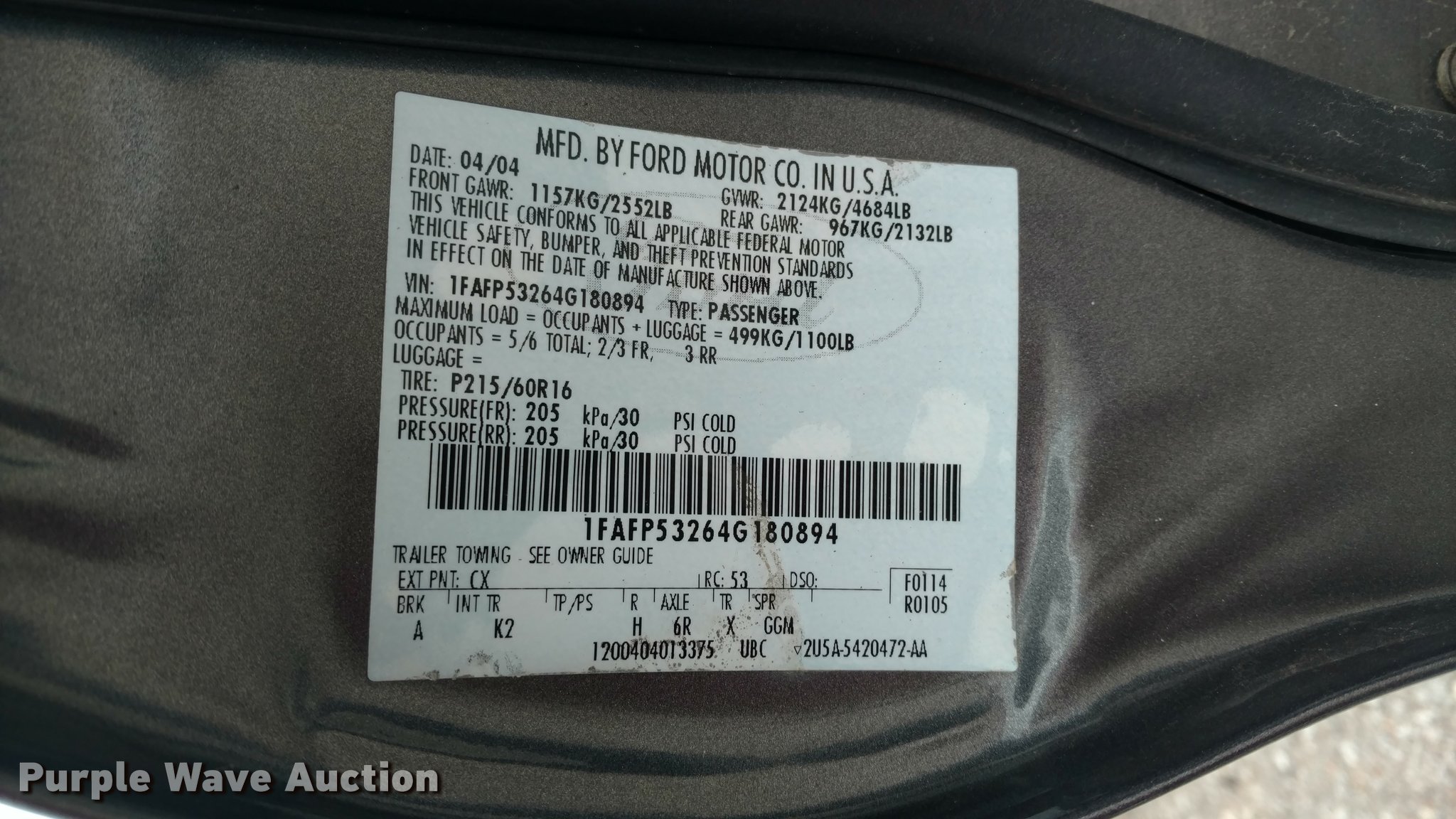 Purple Wave is selling a used Passenger Vehicle in Kansas. This item is a 2004 Ford Taurus SE with the following: 49,035 miles on odometer, 3.0L V6 OHV 12V FFV gas engine, Automatic transmission, AC and heat, Tilt, Cruise, AM/FM, Power windows, locks, and mirrors, Cloth interior, 215/60R16 tires