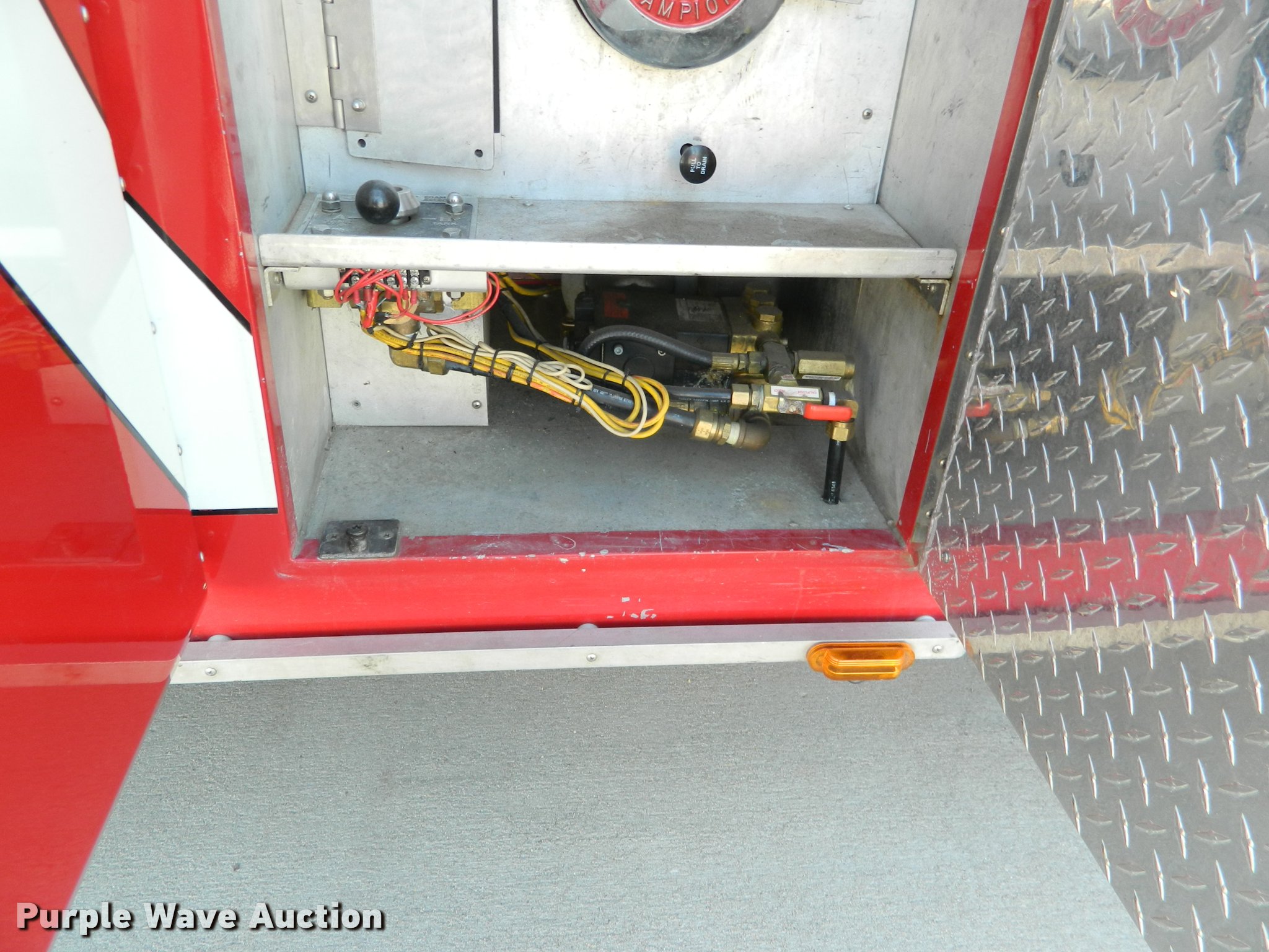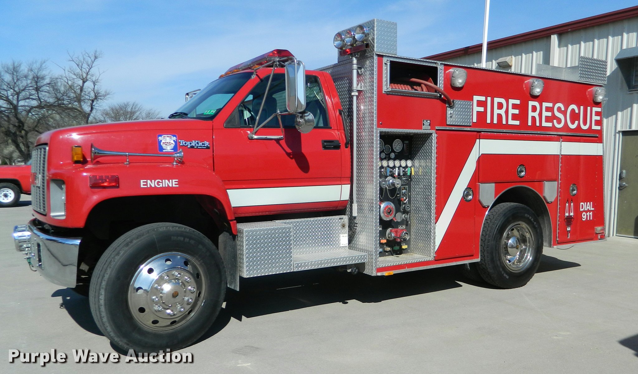 Purple Wave is selling a used Fire Truck or Emergency Vehicle in Kansas. This item is a 1995 GMC TopKick rescue fire truck with the following: 14,965 miles on odometer, Caterpillar 3116 6.6L six cylinder turbo diesel engine, 250 HP, Eaton Fuller FS7206 six speed manual transmission, Single axle, Heat, Air suspension seat, Emergency lights and sirens, Code 3 PA/siren controls, Arrow stick, Federal Q siren, Front winch, Aluminum body, Booster line/hose reel and nozzle, Darley LDM1250 single stage mid ship pump, 1,250 gpm, (7) discharges, (5) intakes, Foam Pro foamer, 30 gallon foam tank, 500 gallon poly water tank, 275-80R22.5 tires, GVWR 33,000 lbs, Pump issues, needs repair