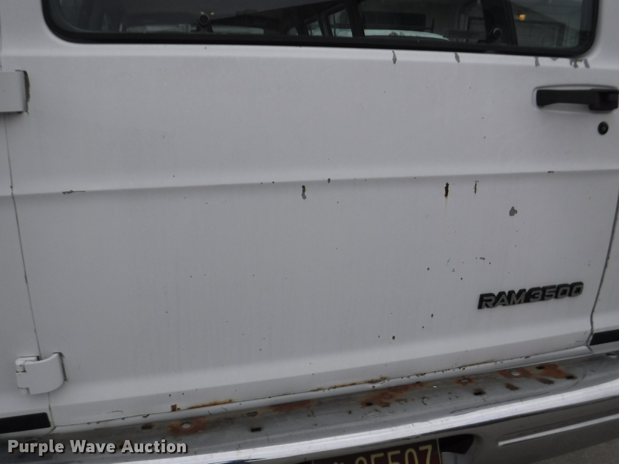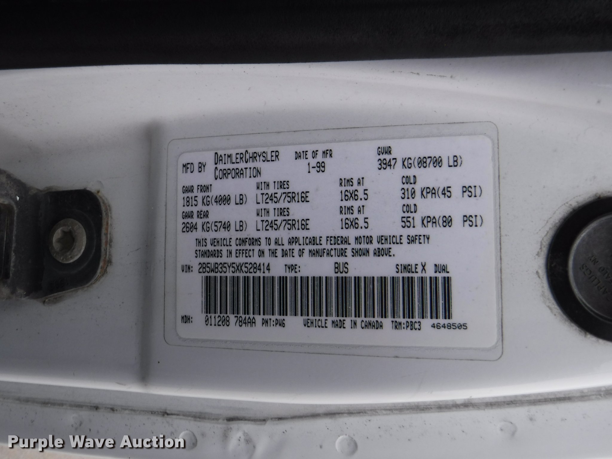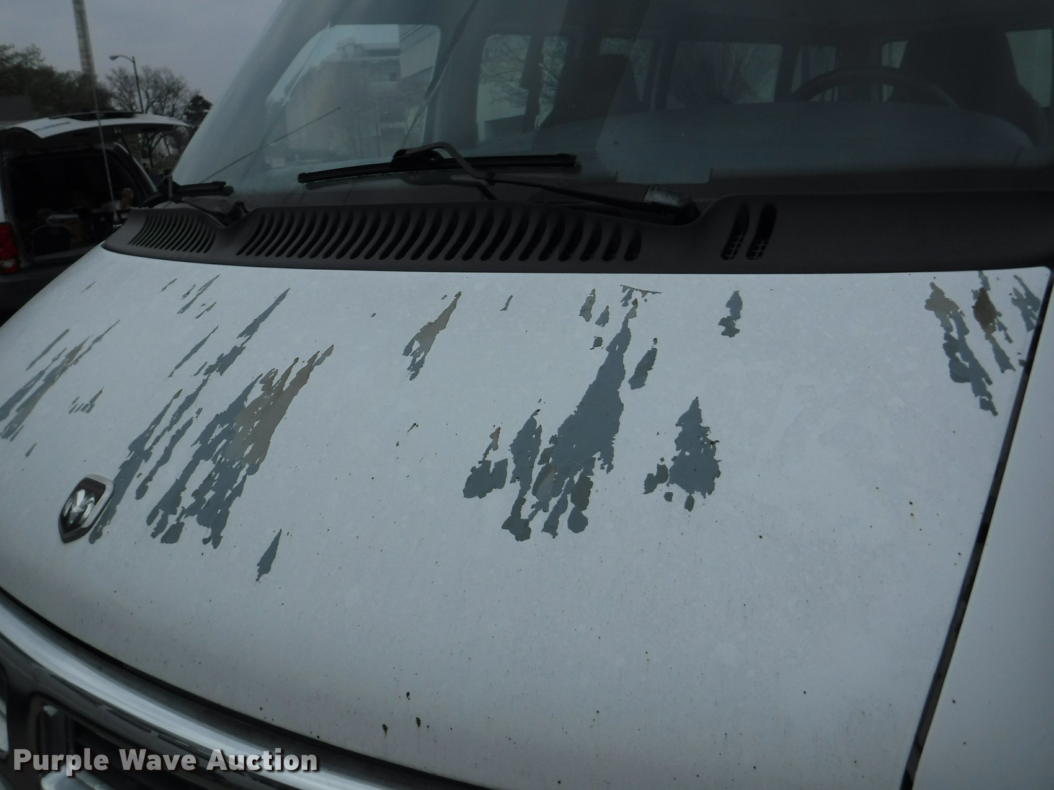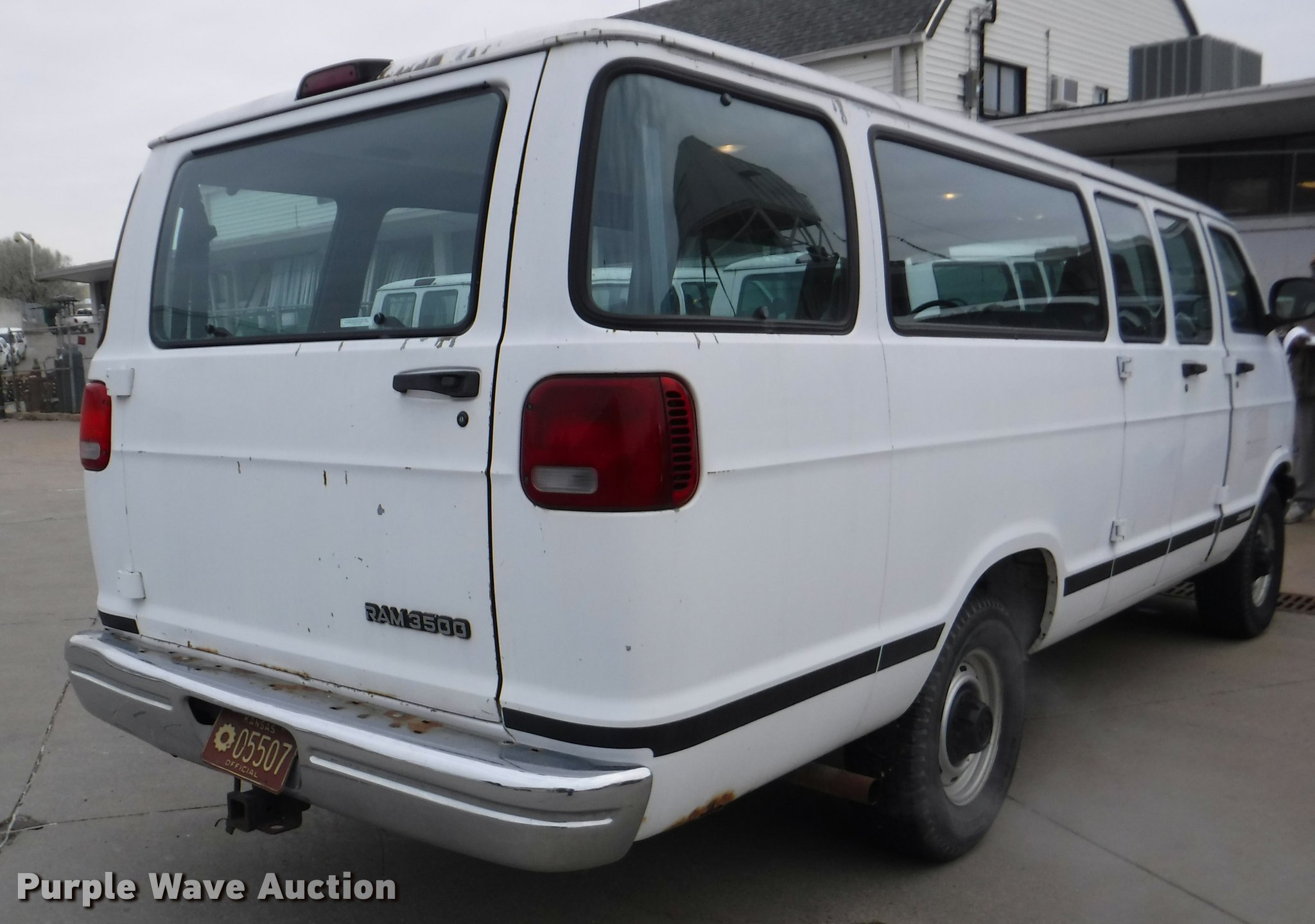 Purple Wave is selling a used 3/4 or 1 Ton Pickup or Van in Kansas. This item is a 1999 Dodge Ram Wagon B3500 Maxi van with the following: 143,833 miles on odometer, 5.2L V8 OHV 16V gas engine, Automatic transmission, AC and heat, Tilt, Cruise, AM/FM/CD, Power windows and locks, Cloth interior, One row of seats, Receiver hitch, Trailer wiring, 245/75R16 tires, Check engine light on, Paint peeling, Rust, Unit# 5507