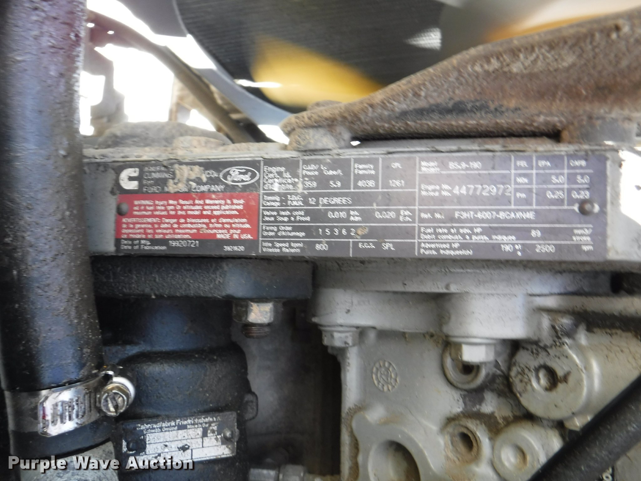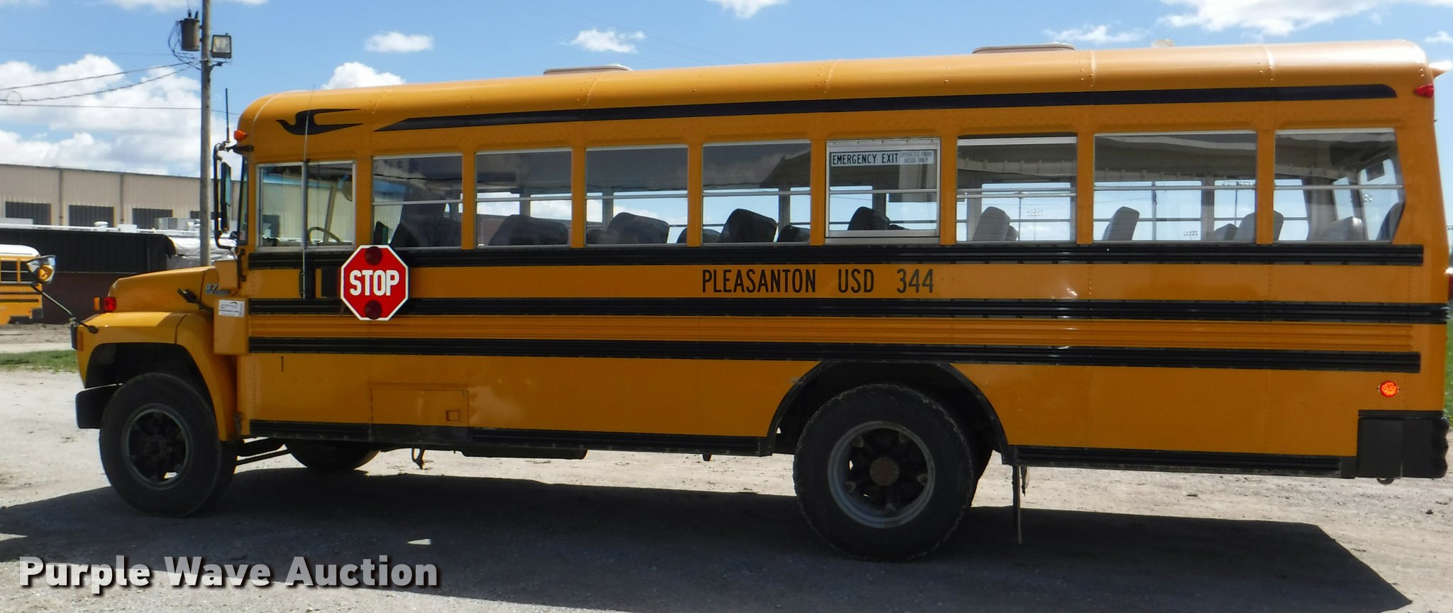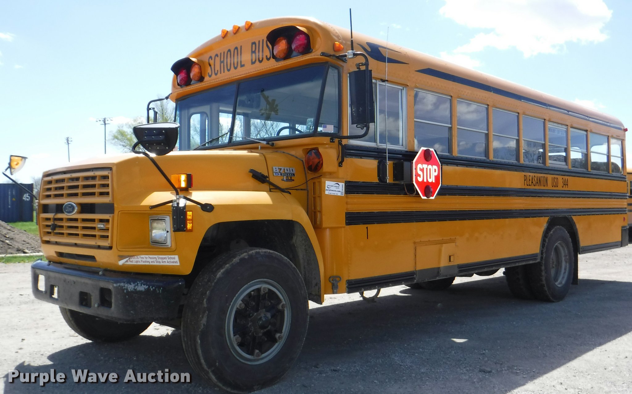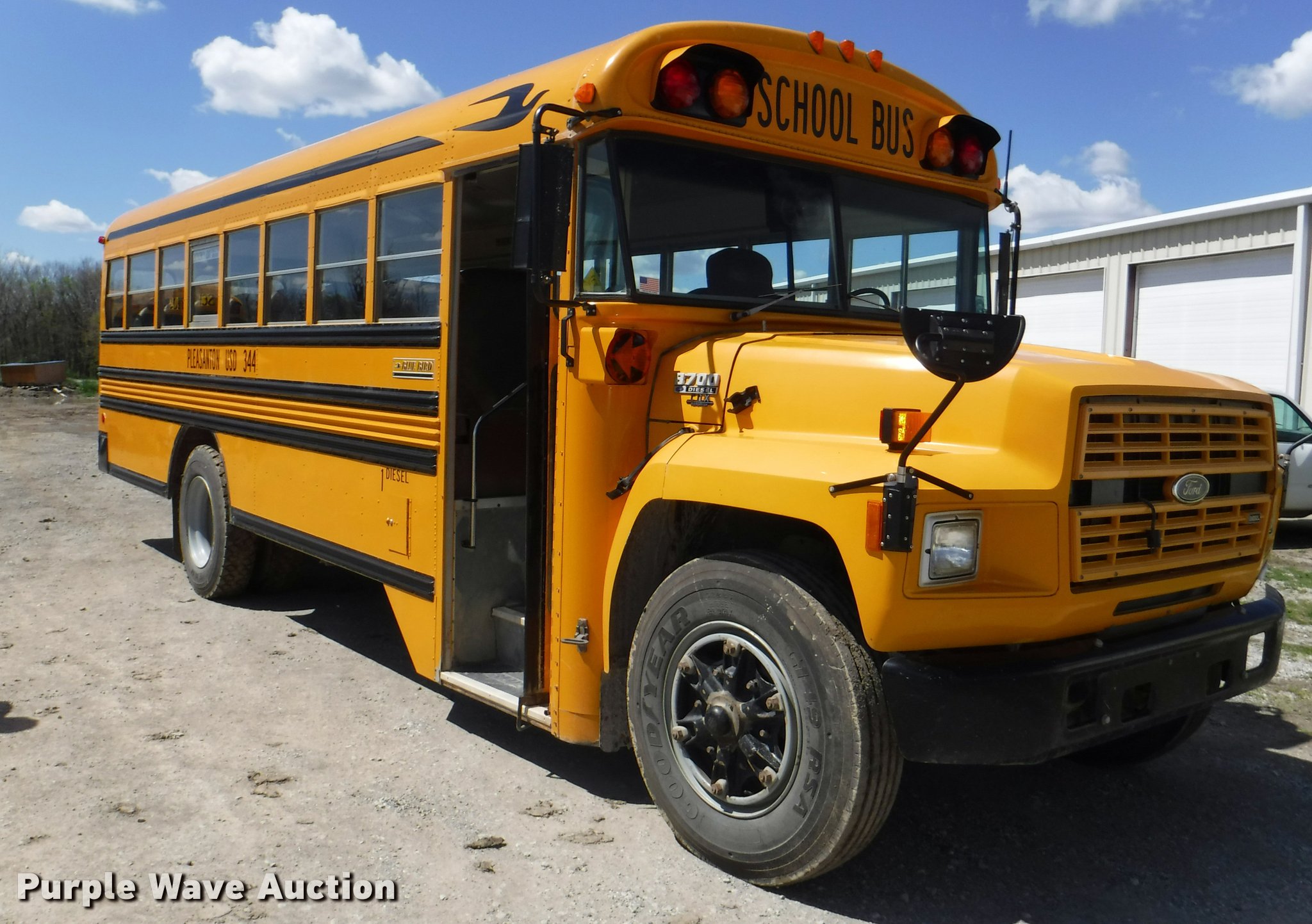 Purple Wave is selling a used Bus in Kansas. This item is a 1993 Ford B700 schoolbus with the following: 126,109 miles on odometer, Cummins ISB 5.9L L6 turbo diesel engine, Serial 44772972, Automatic transmission, Single axle, Heat, AM/FM, Heated mirrors, Suspension seat, Vinyl interior, 47 passenger capacity, Ceiling, rear, and side emergency egress, Lighted stop sign, Block heater, Front and rear tow hooks, 172" wheelbase, Spring suspension, Hydraulic brakes, 10R22.5 tires, Decals will be painted over prior to auction