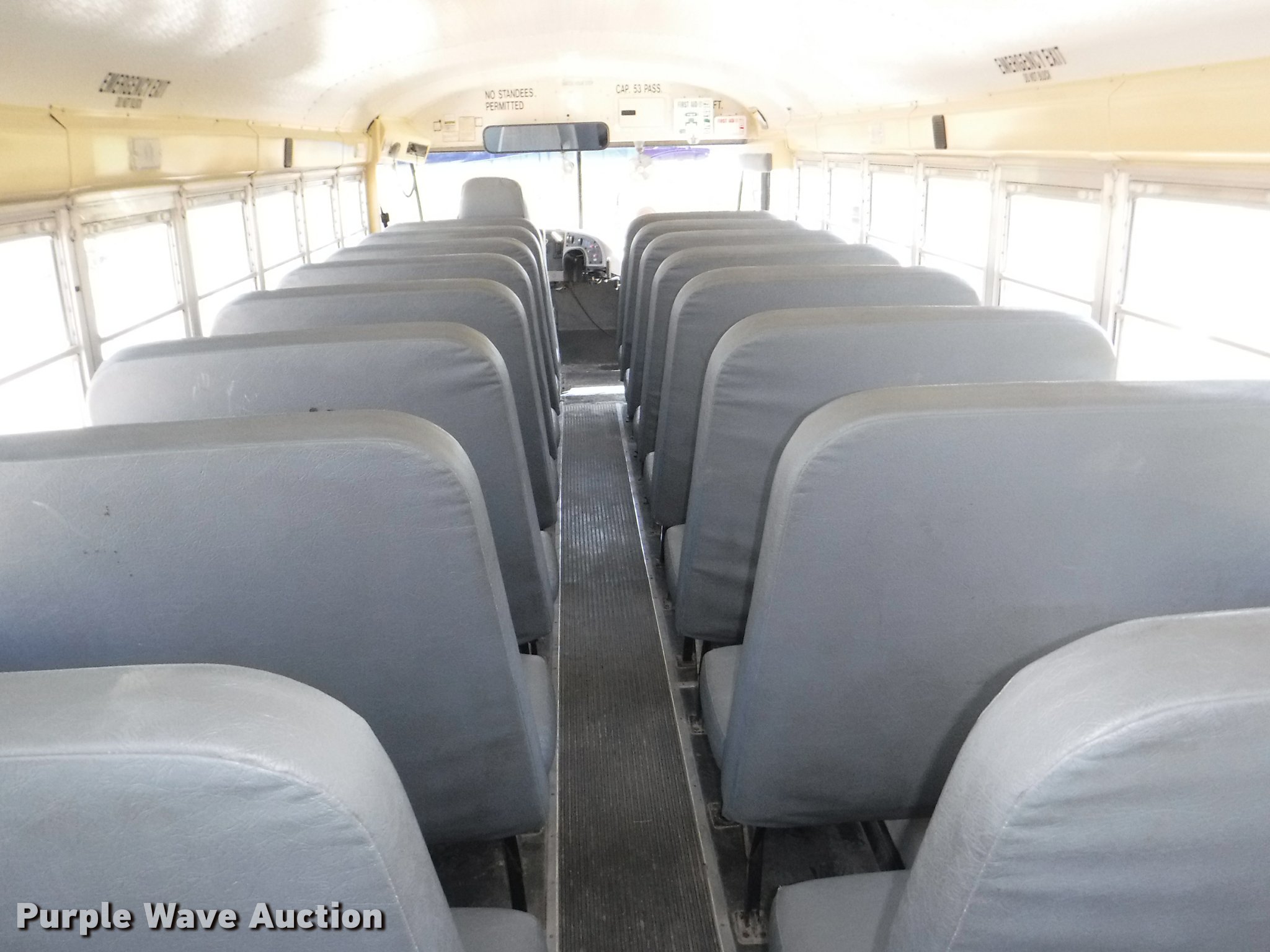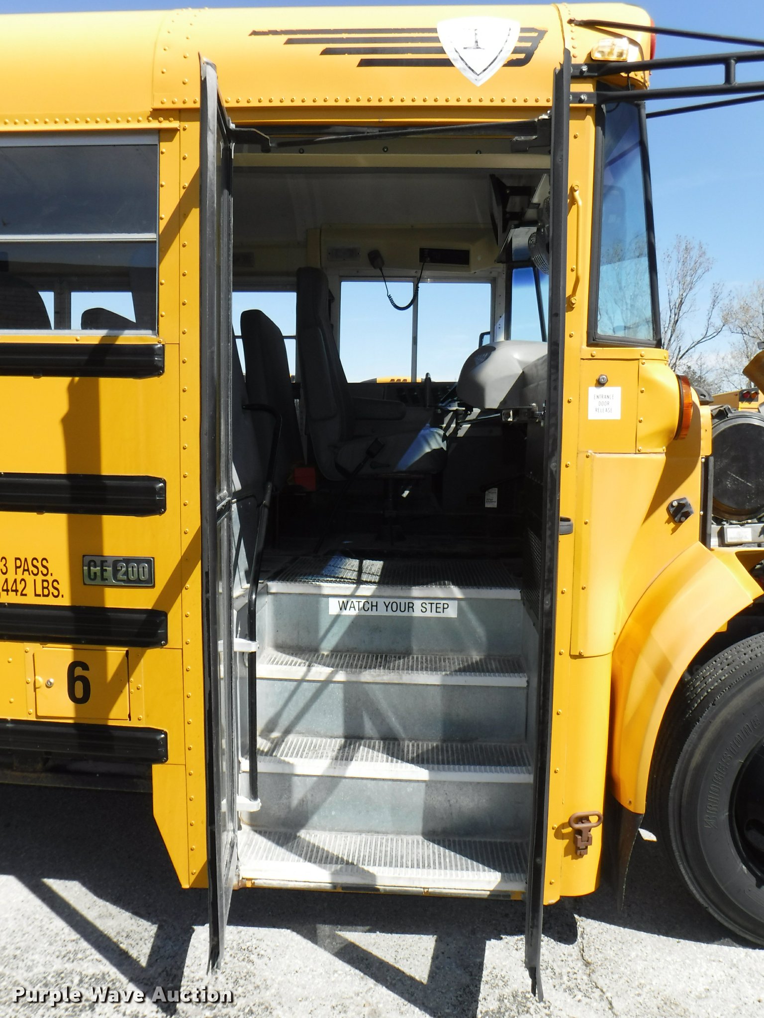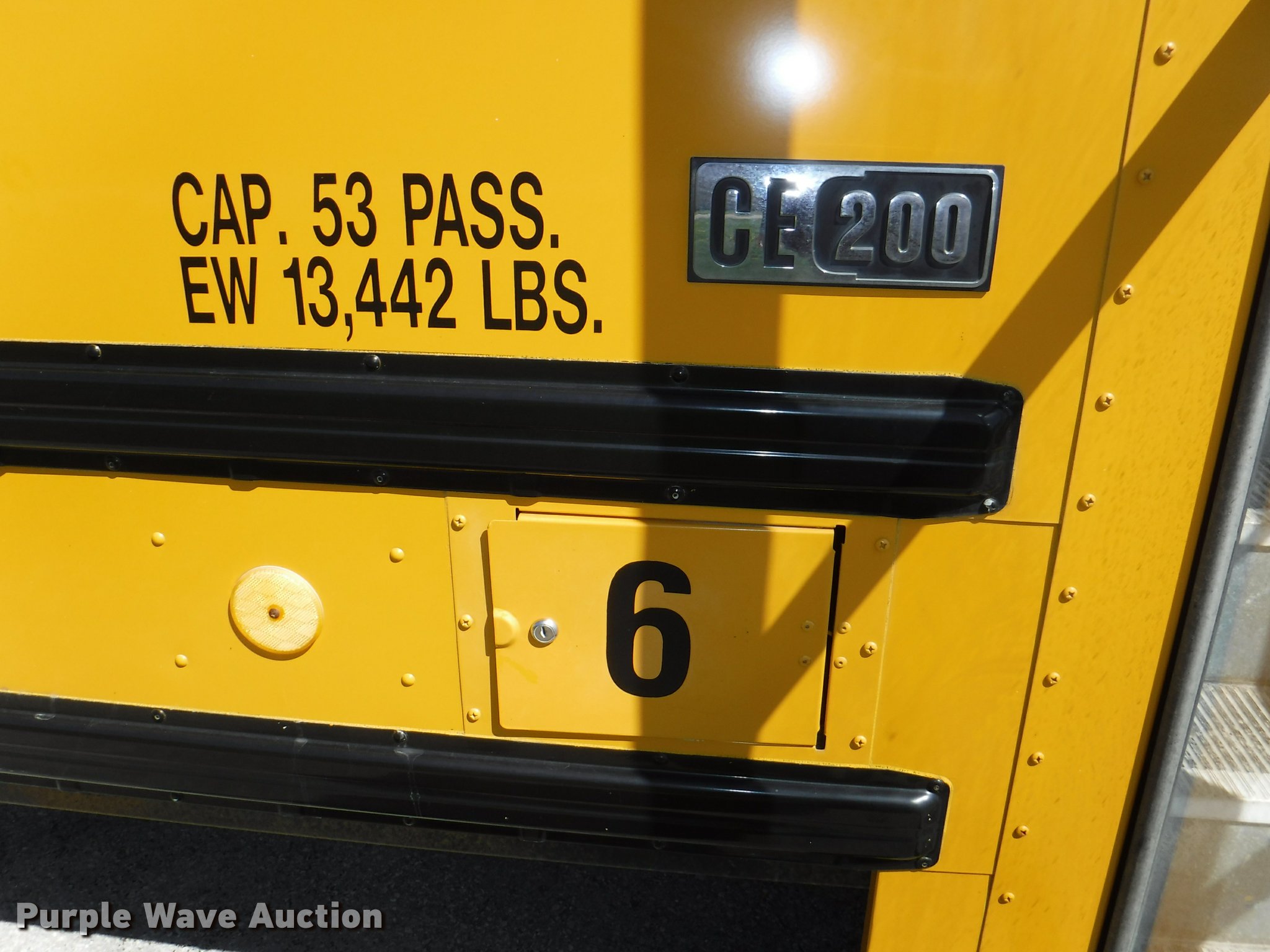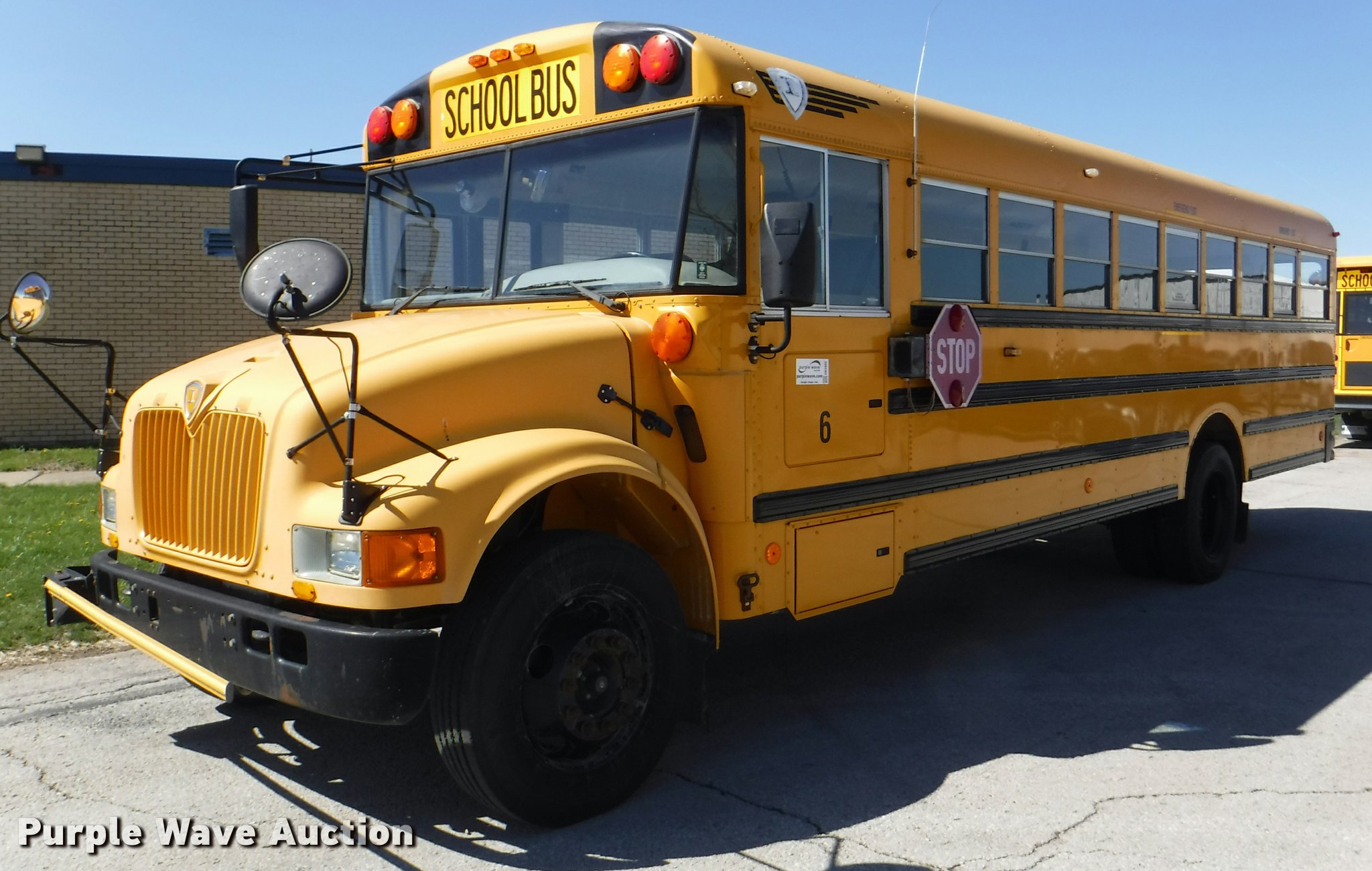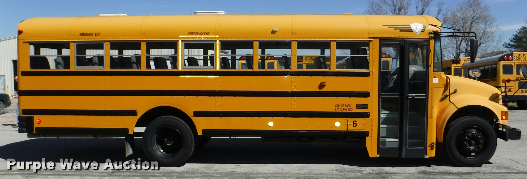 Purple Wave is selling a used Bus in Kansas. This item is a 2004 International CE200 school bus with the following: 85,617 miles on odometer, 3,834 hours on meter, Odometer and hour meter inoperable, International T444E 7.3L V8 turbo diesel engine, 175 HP, Automatic transmission, Single axle, Heat, AM/FM, Heated mirrors, Suspension seat, Cloth drivers interior, Vinyl passenger interior, 53 passenger capacity, Ceiling, rear, and side emergency exits, Lighted stop sign, Crossing bar, Backup alarm, Block heater, Front and rear tow hooks, Spring suspension, Hydraulic brakes, 219" wheelbase, Bridgestone 265/75R22.5 tires, GVWR 25,500 lbs, Emergency exit alarm buzzes intermittently, Gauges inoperable, Unit# 6