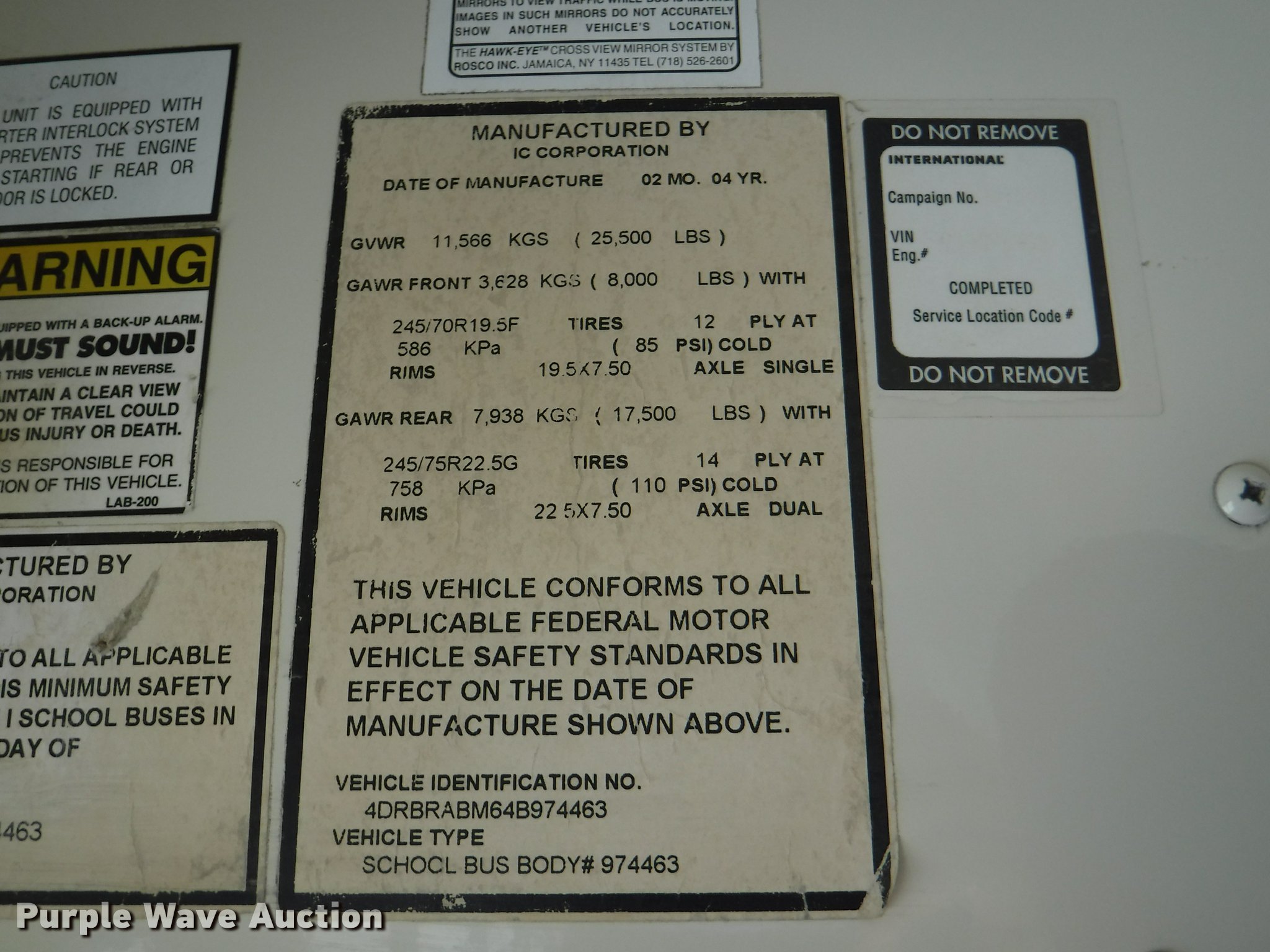 2004 International CE200 school bus. 85,617 miles on odometer, 3,834 hours on meter Odometer and hour meter inoperable, International T444E 7.3L V8 turbo diesel engine 175 HP, Automatic transmission, Single axle, Heat, AM/FM, Heated mirrors, Suspension seat, Cloth drivers interior, Vinyl passenger interior, 53 passenger capacity, Ceiling, rear, and side emergency exits, Lighted stop sign, Crossing bar, Backup alarm, Block heater, Front and rear tow hooks, Spring suspension, Hydraulic brakes, 219" wheelbase, Bridgestone 265/75R22.5 tires, GVWR 25,500 lbs, Emergency exit alarm buzzes intermittently, Gauges inoperable, Unit# 6. Kansas title. 4DRBRABM64B974463. Richmond, KS 66080