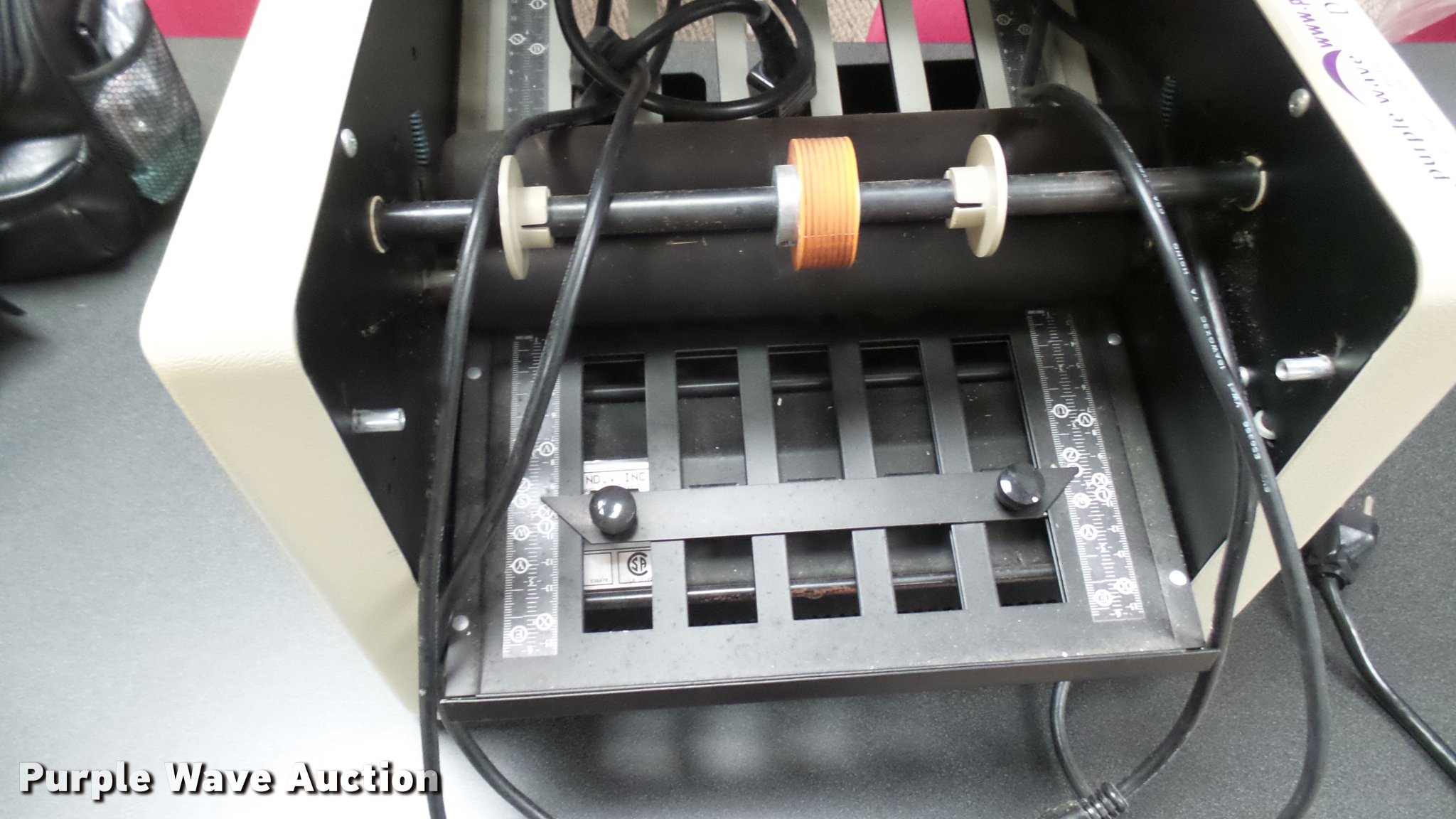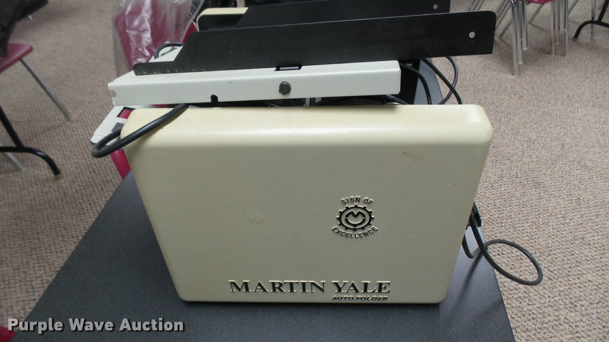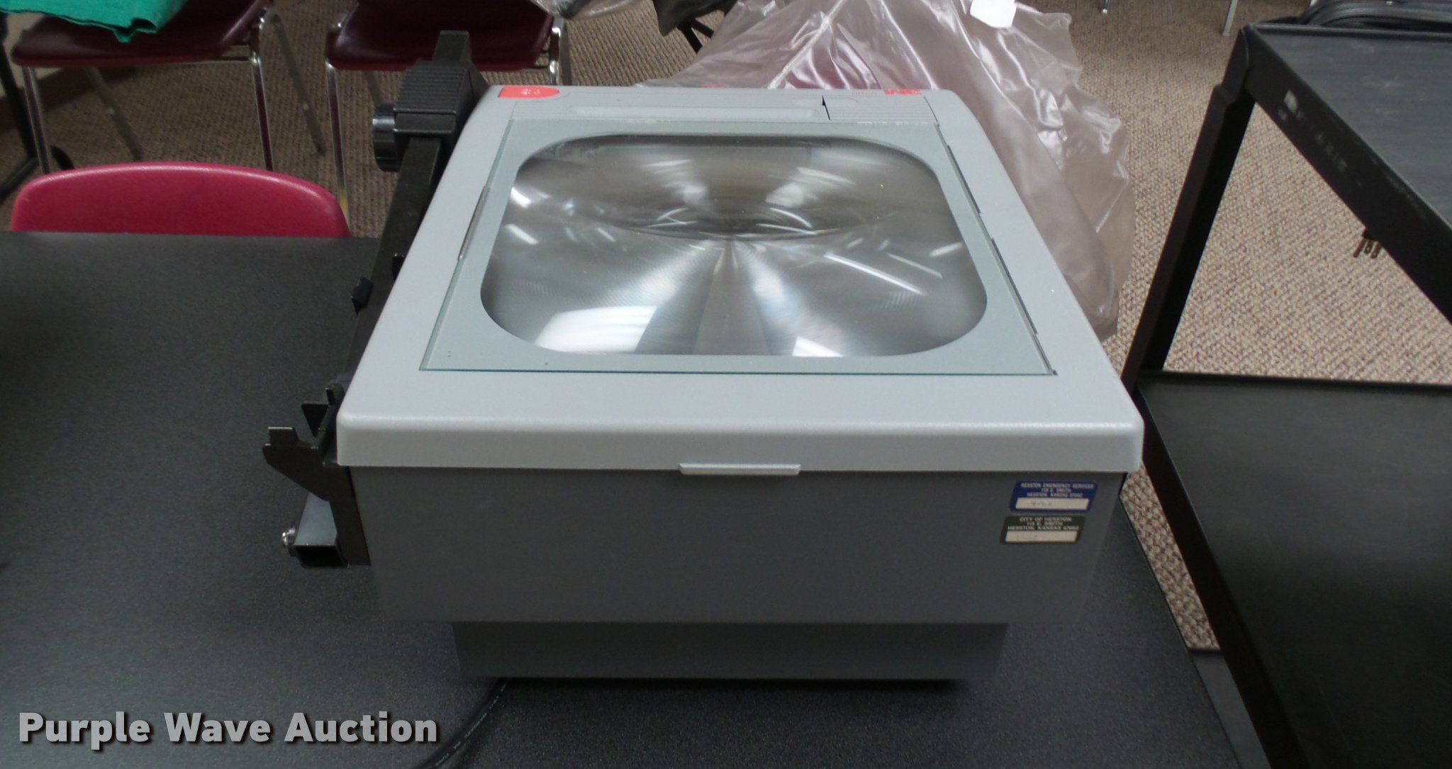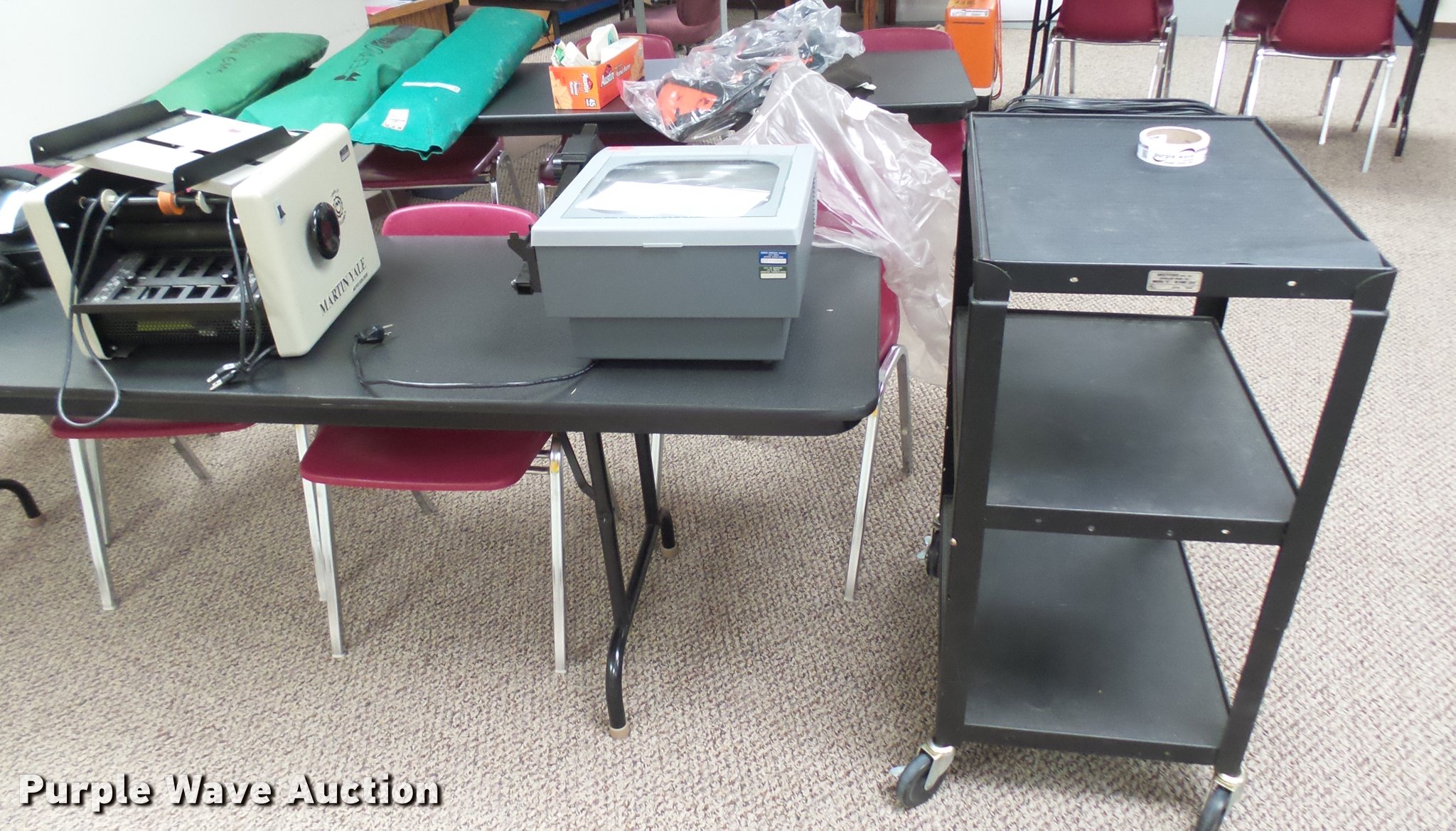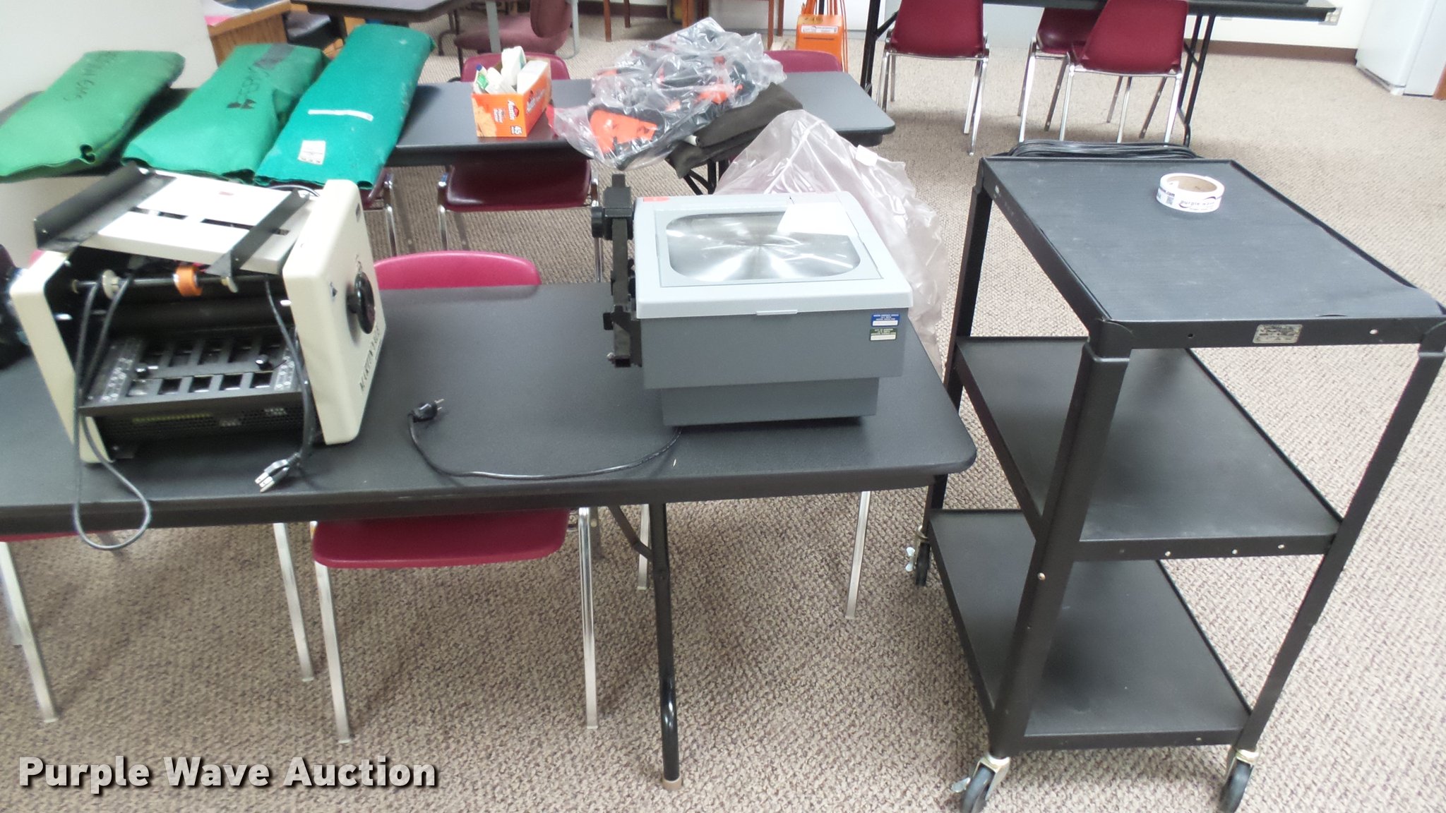 Purple Wave is selling a used Office Supplies and Equip. in Kansas. This item is a Office supplies with the following: Bradford E media cart, 3M 9200 overhead projector, Martin Yale auto folder