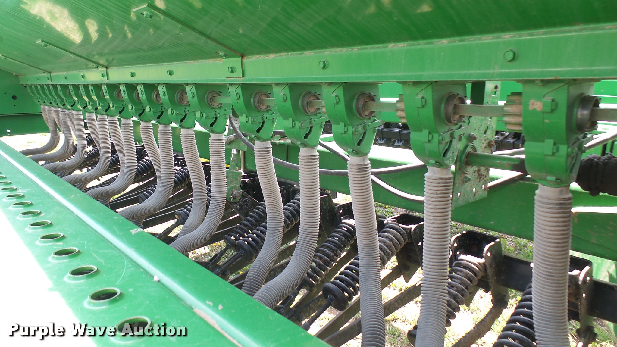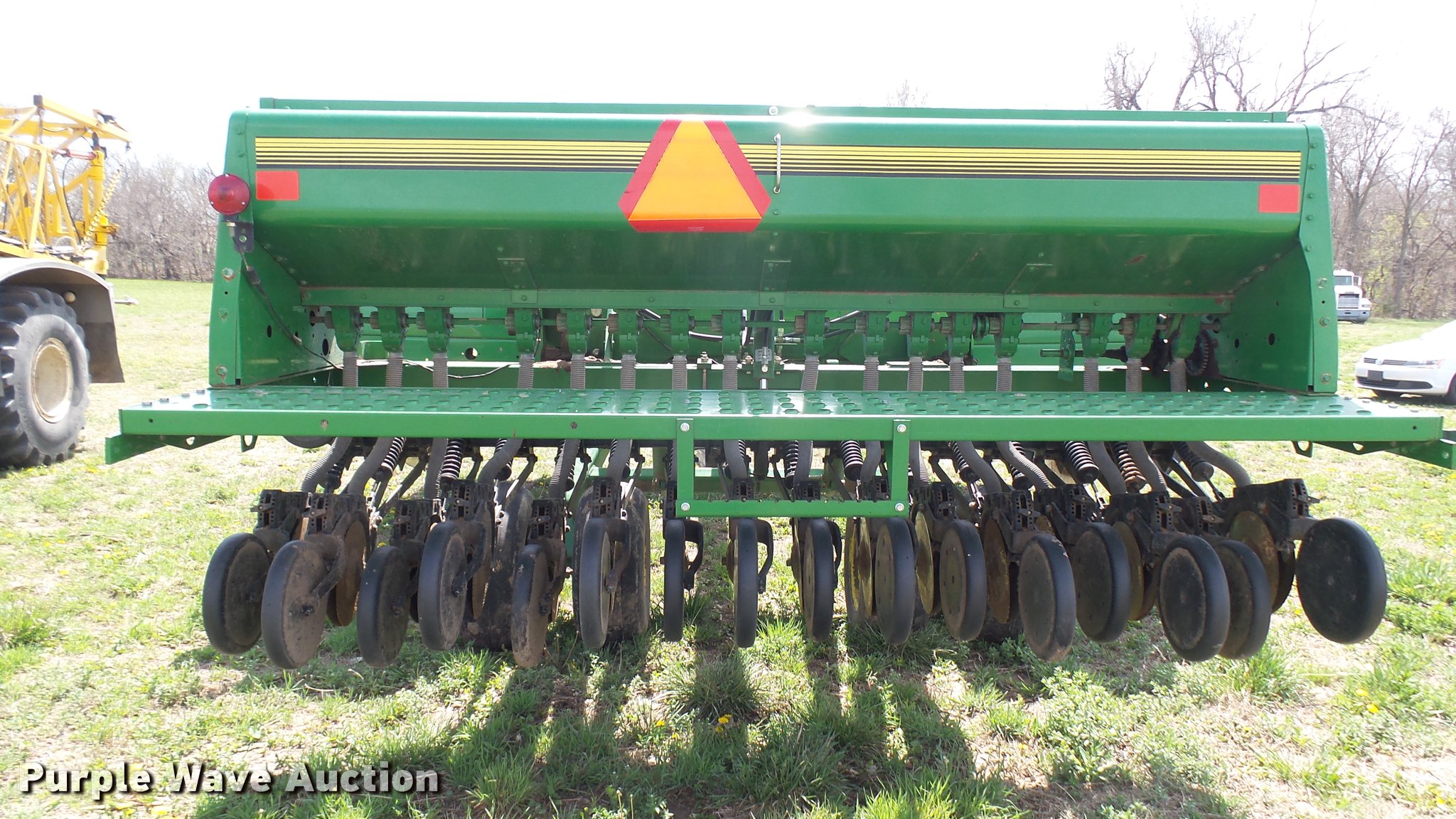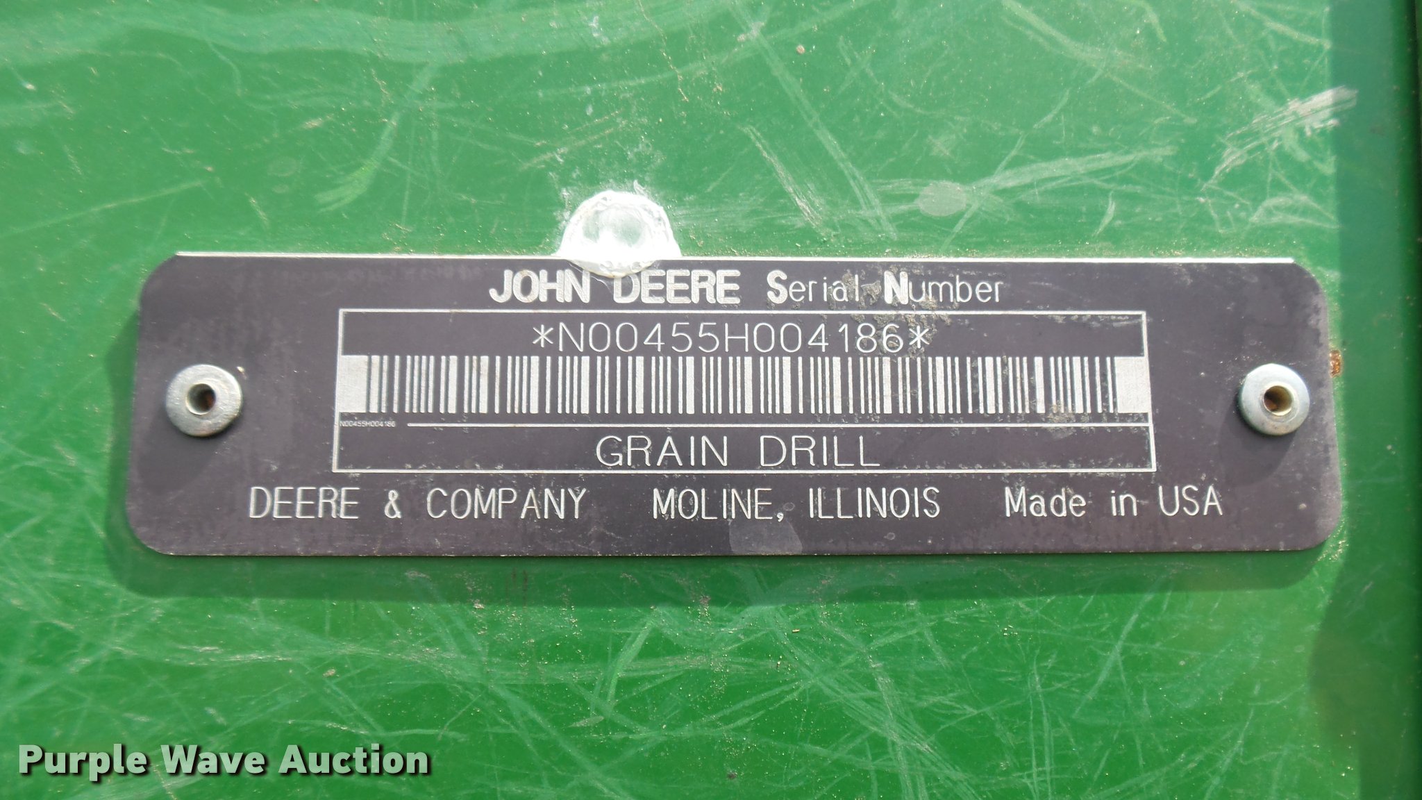 Purple Wave is selling a used Grain Drill or Seeder in Kansas. This item is a John Deere 455 grain drill with the following: 35'W, 56 row units, 7.5" row spacing, Hydraulic lift and fold, Double disk openers, Rubber press wheels, Pin hitch, 7.60-15 tires, Serial N00455H004186