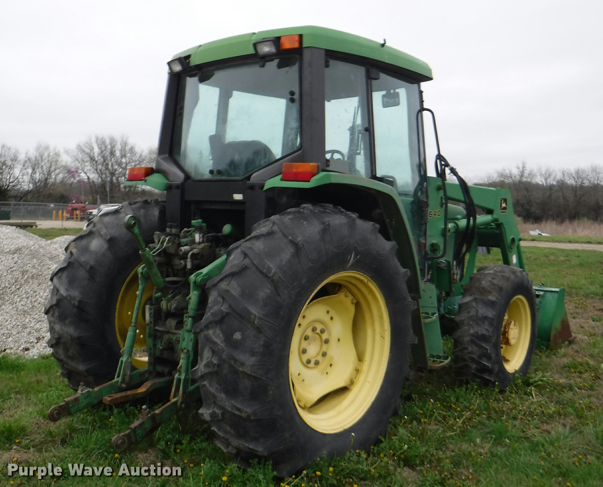 1995 John Deere 6400 MFWD tractor. 6,525 hours on meter, John Deere 4.5L four cylinder diesel engine SErial CD4D457222915, Synchro transmission 12F-4R gears, AC and heat, Tilt steering wheel, AM/FM, Suspension seat, Front and rear work lights, Wipers, John Deere 640 loader 61"W bucket, Joystick controls, Serial W00640D009468, Three point Top link, Seven pin outlet, 540 PTO PTO operation is intermittent, Draw bar, (2) front hydraulic remote sets, (3) rear hydraulic remote sets, Firestone 13.6-24 front tires, Firestone 18.4-34 rear tires, Headliner needs repaired, Seat damage, Hydraulics inoperable, hose needs to be replaced, Serial L06400M153511. Paola, KS 66071