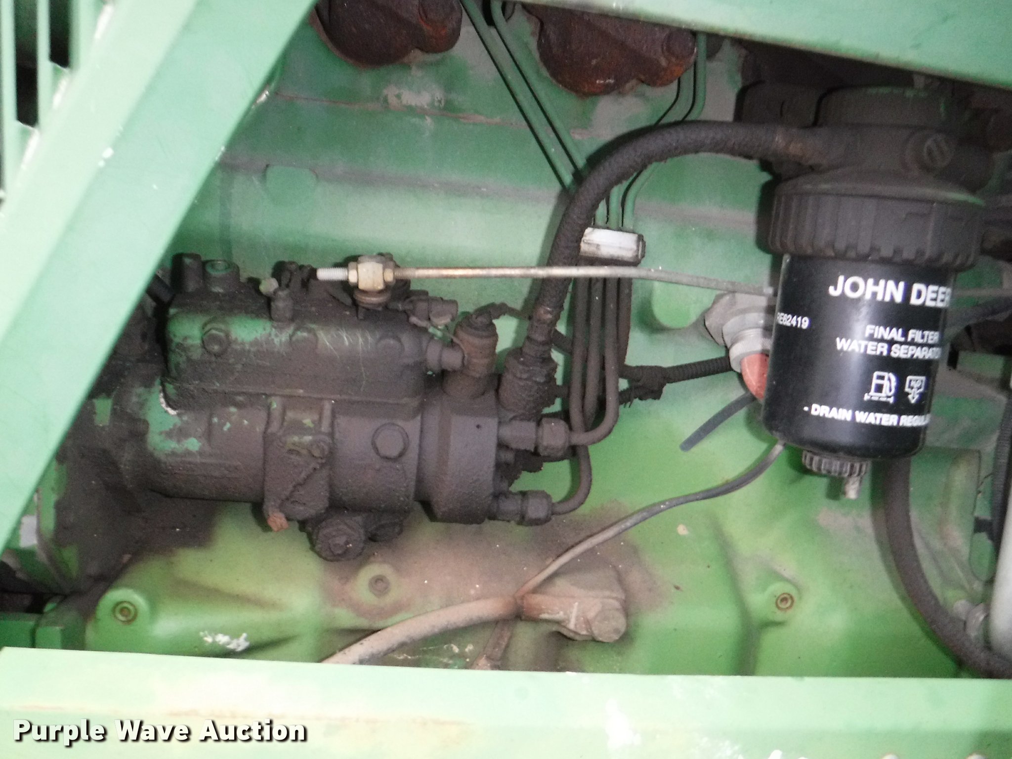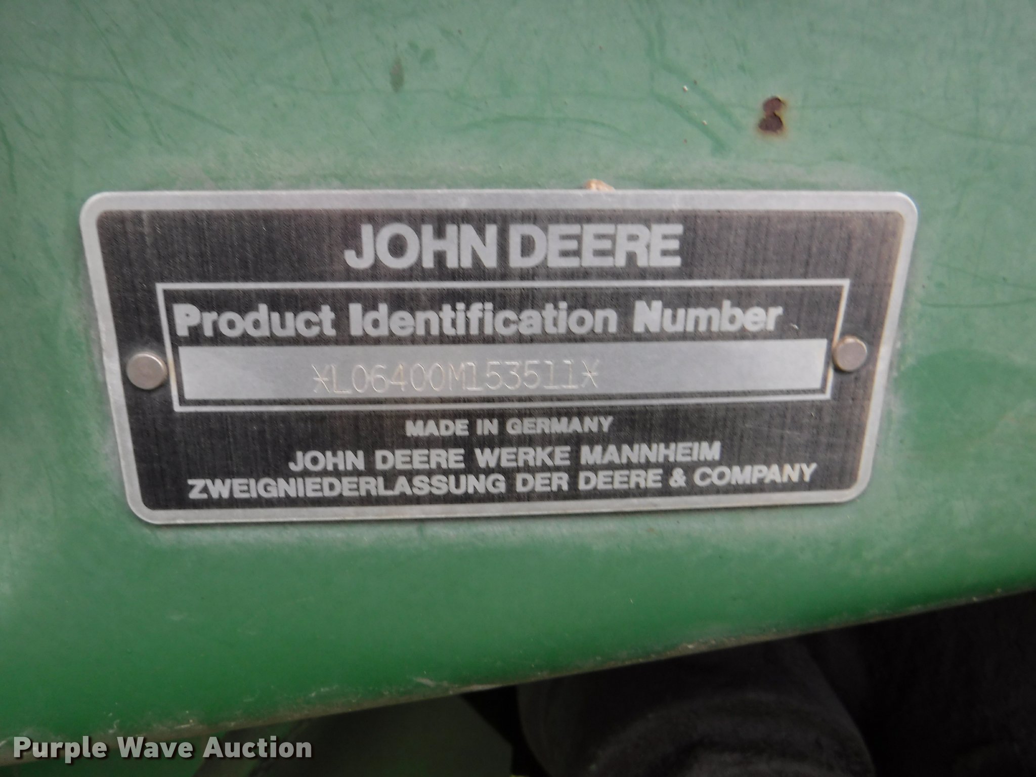 Purple Wave is selling a used Tractor in Kansas. This item is a 1995 John Deere 6400 MFWD tractor with the following: 6,525 hours on meter, John Deere 4.5L four cylinder diesel engine, SErial CD4D457222915, Synchro transmission, 12F-4R gears, AC and heat, Tilt steering wheel, AM/FM, Suspension seat, Front and rear work lights, Wipers, John Deere 640 loader, 61"W bucket, Joystick controls, Serial W00640D009468, Three point, Top link, Seven pin outlet, 540 PTO, PTO operation is intermittent, Draw bar, (2) front hydraulic remote sets, (3) rear hydraulic remote sets, Firestone 13.6-24 front tires, Firestone 18.4-34 rear tires, Headliner needs repaired, Seat damage, Hydraulics inoperable, hose needs to be replaced, Serial L06400M153511