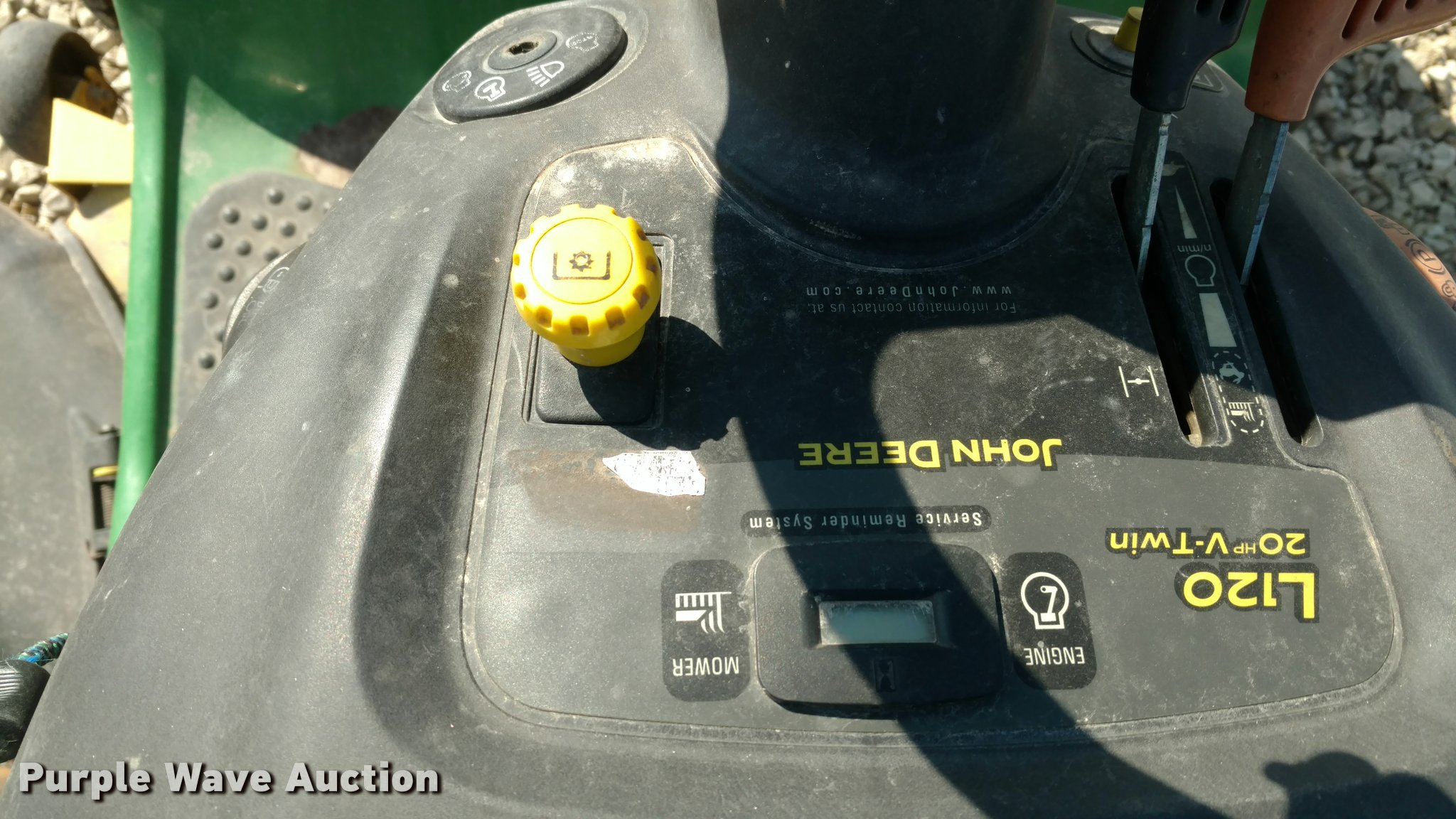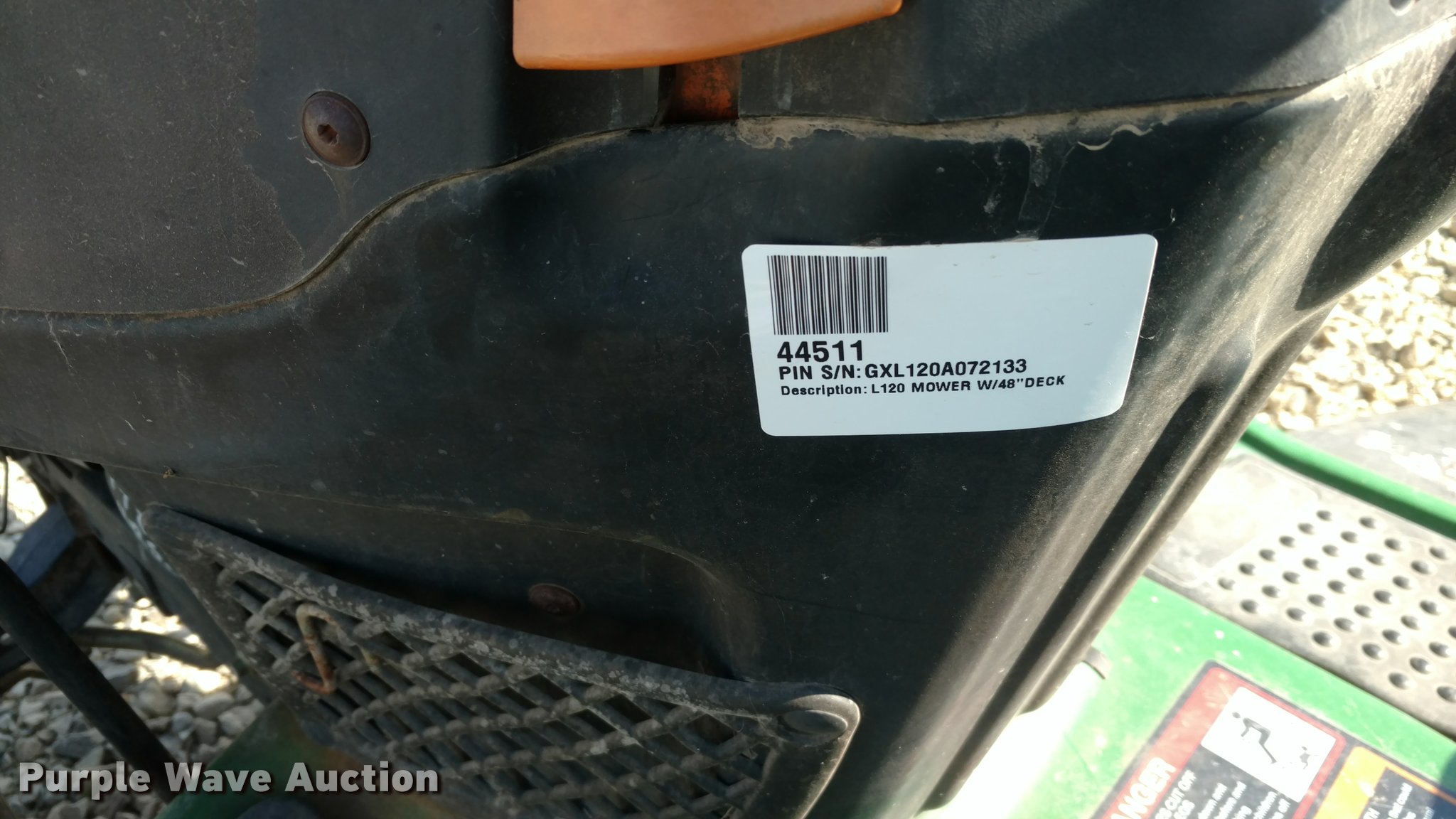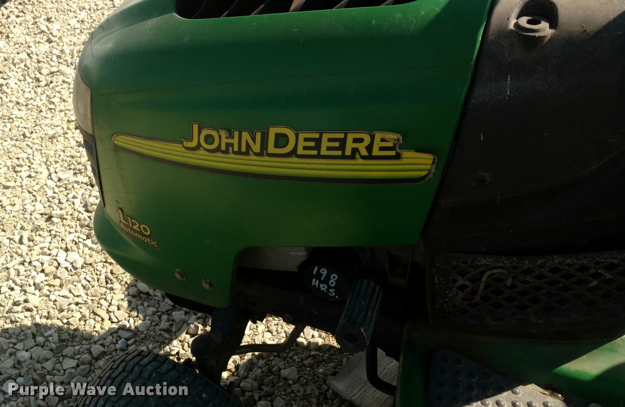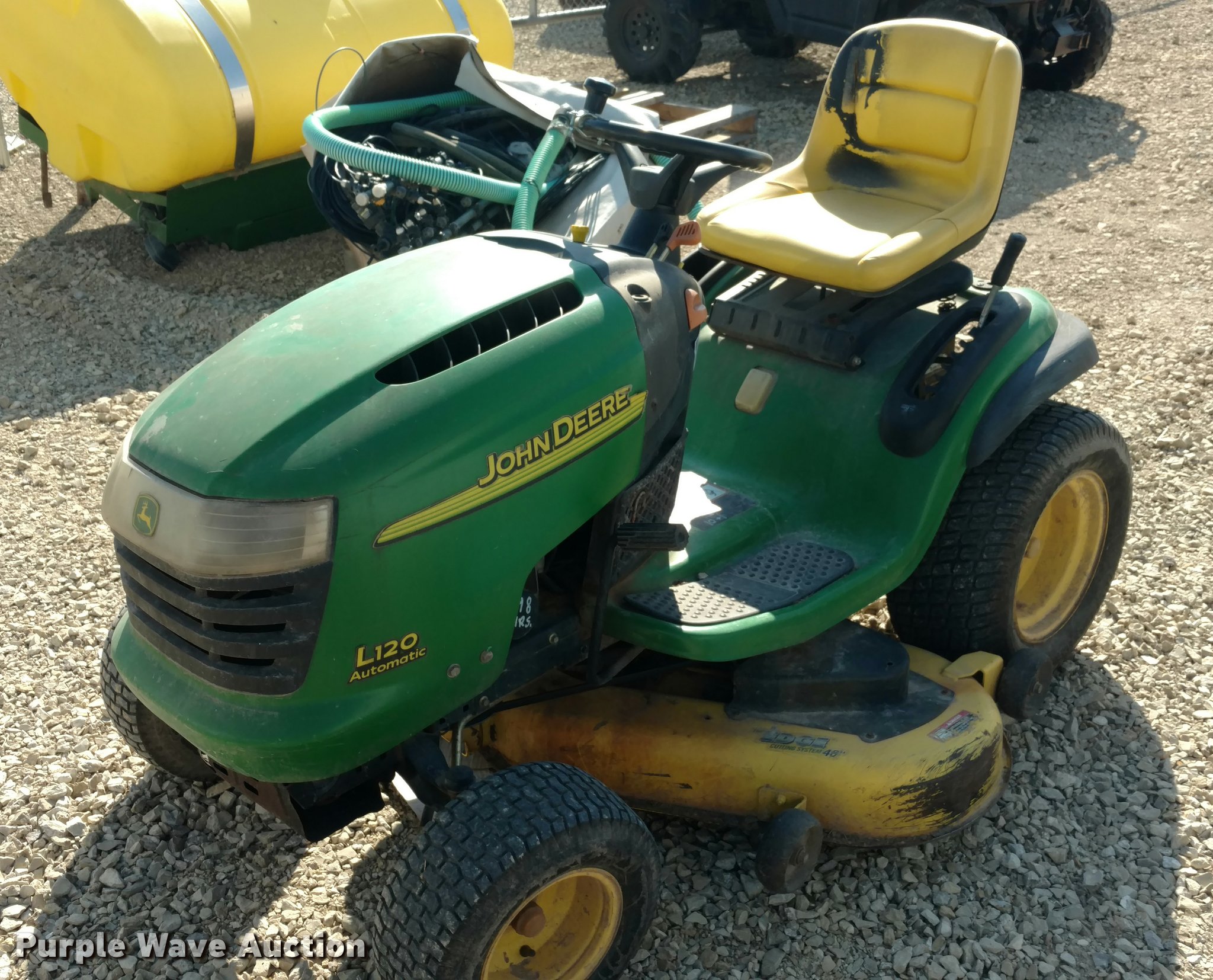 Purple Wave is selling a used Lawn Mower in Kansas. This item is a John Deere L120 lawn mower with the following: 235 hours on meter, 48" cut, 20 HP gas engine, Automatic transmission, Vinyl seat, 16x6.50-18 front tires, 22x9.50-12 rear tires, Serial GXL120A072133, Stock# 44511