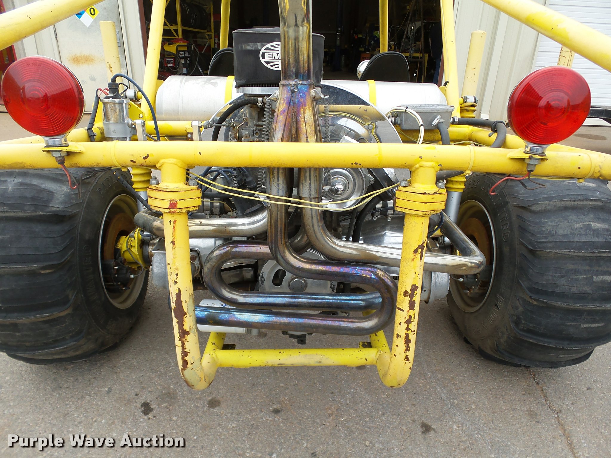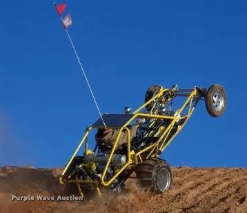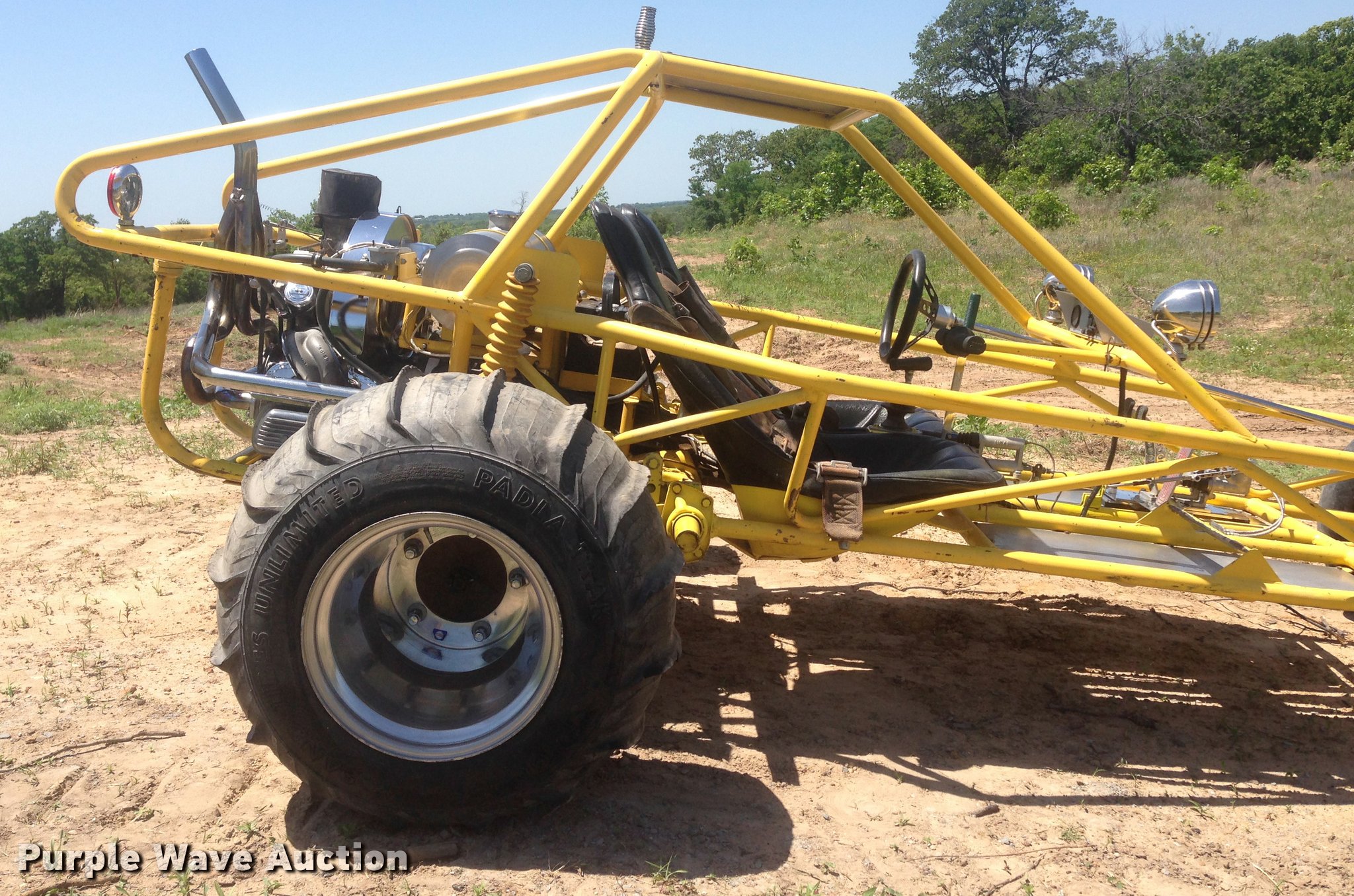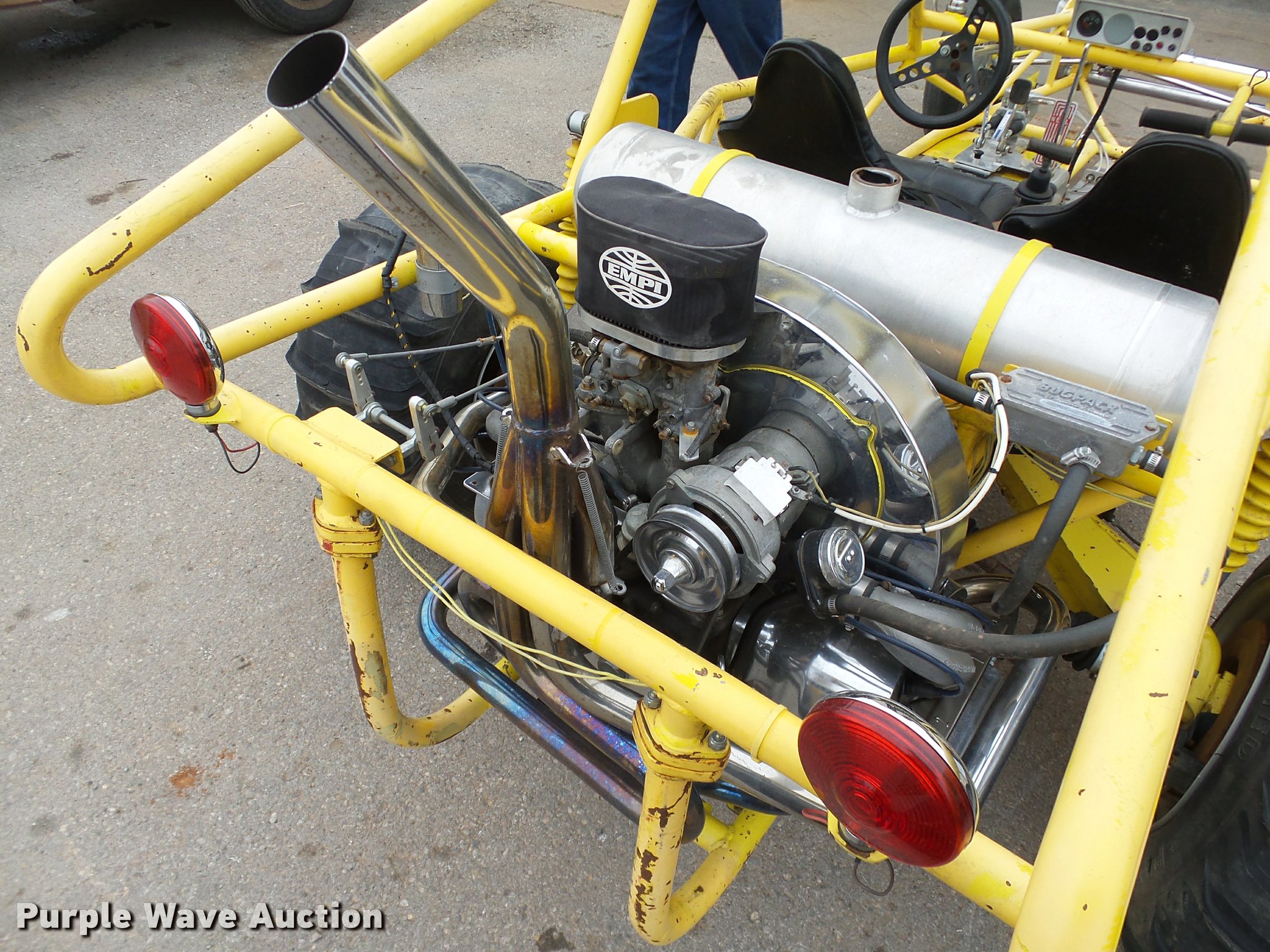 Purple Wave is selling a used Sporting Goods in Oklahoma. This item is a Shop built Volkswagen Sand Rail dune buggy with the following: 1,835 C.I.D. four cylinder gas engine, 110 HP, Volkswagen Rock Crusher four speed manual transmission, Four point harness, Adjustable pedals, 930 CV joints, External oil filter, Extended breather box for crank case, Running and brake lights, Tuned suspension, Turning brakes, Aluminum front axle, Spindle front axle, Aluminum wheels, Smoothie front tires, Sand Paddle rear tires