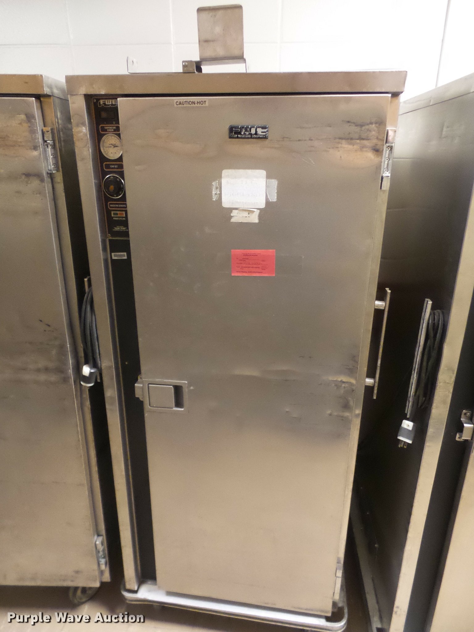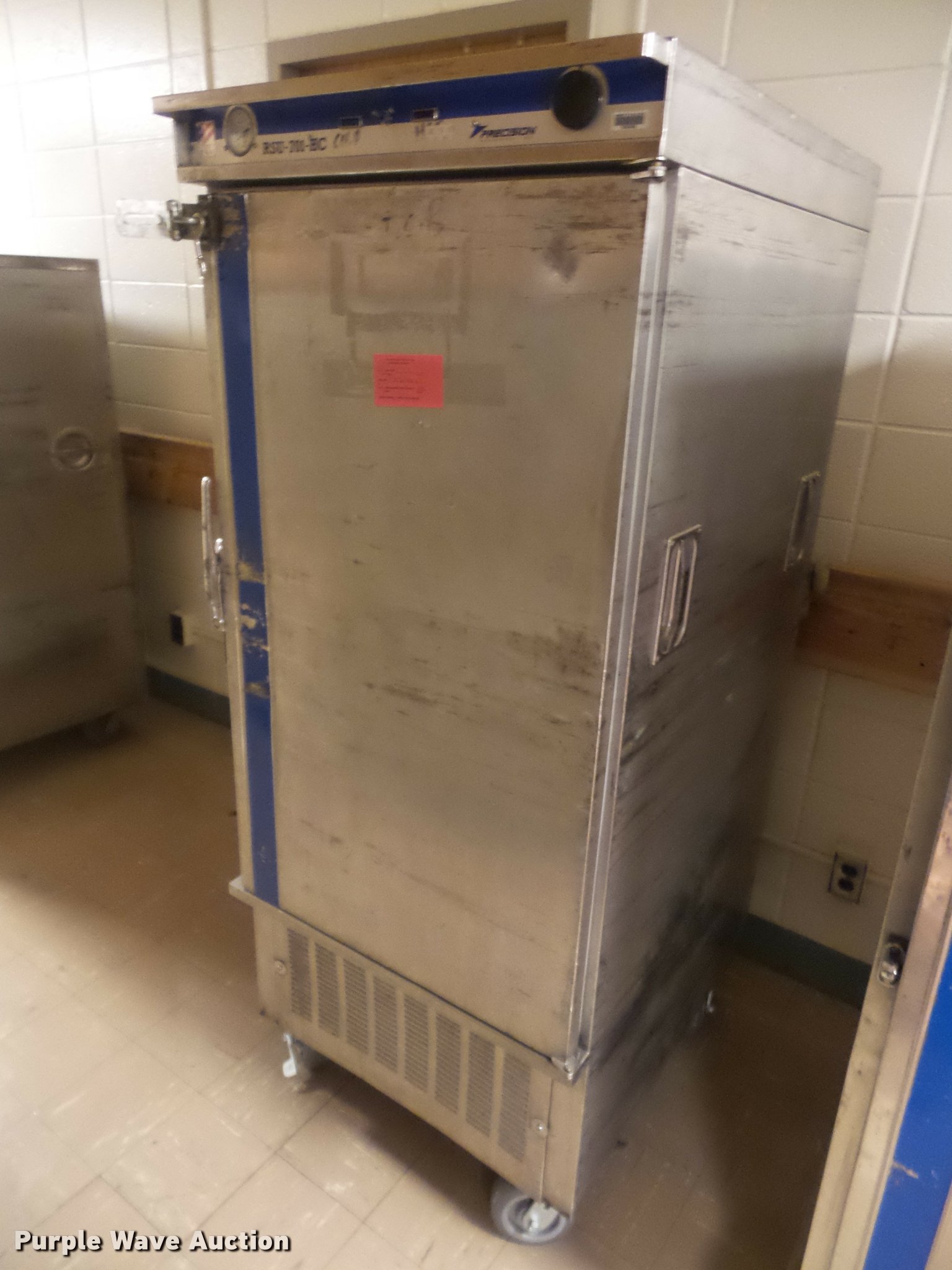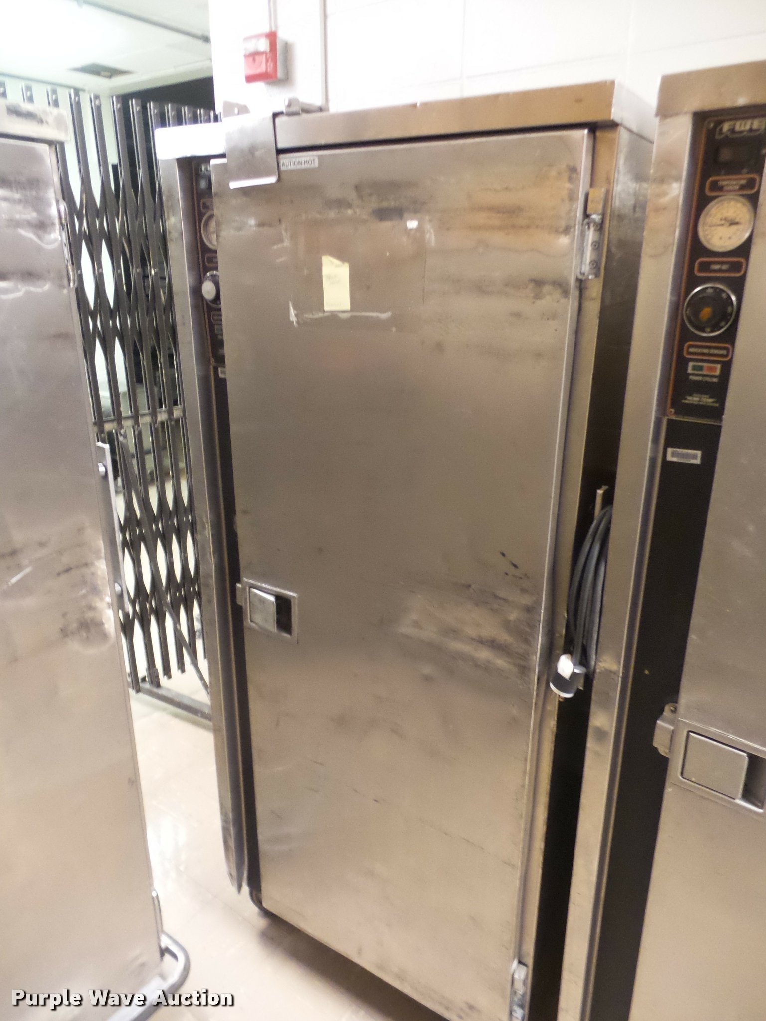 Purple Wave is selling a used Restaurant Equip. in Kansas. This item is a (8) food warming carts with the following: Precision RSV-401, 29"W x 33"D x 65.5"H, Precision RSV-701-HC, Hot or cold, 29"W x 35"D x 71"H, Precision RS-418-1, 29.5"W x 35"D x 68"H, (4) FWE warming carts, 28"W x 31"D x 69"H, Unknown brand, 29"W x 33.5"D x 64.5"H, Some damage, Some door hinges broken, Latches will not latch, Additional racking brackets