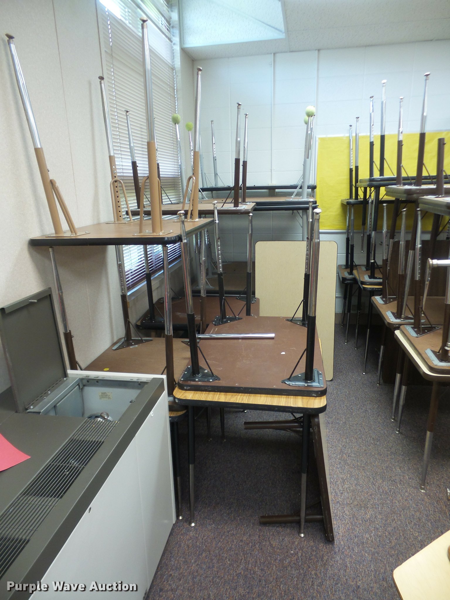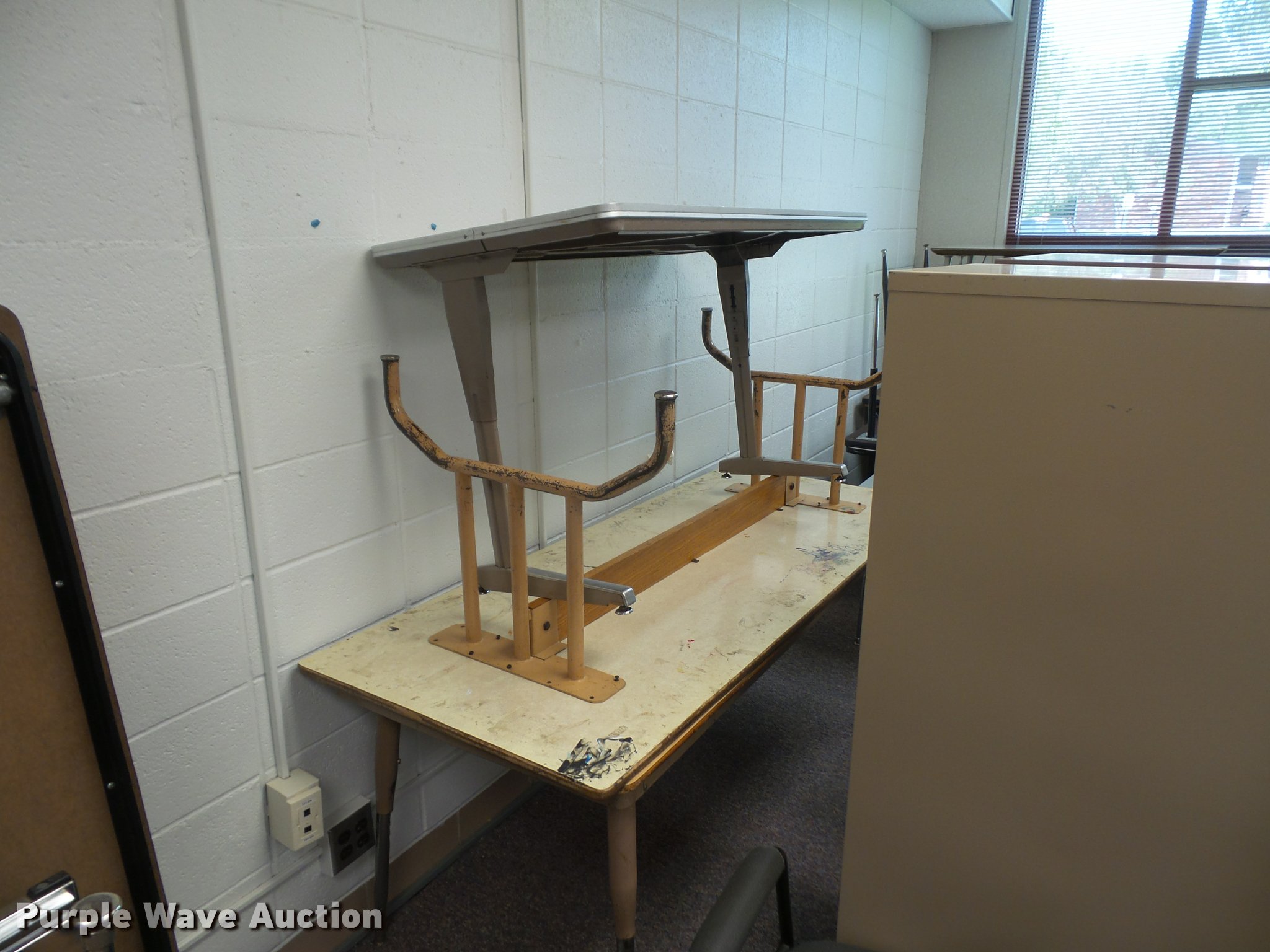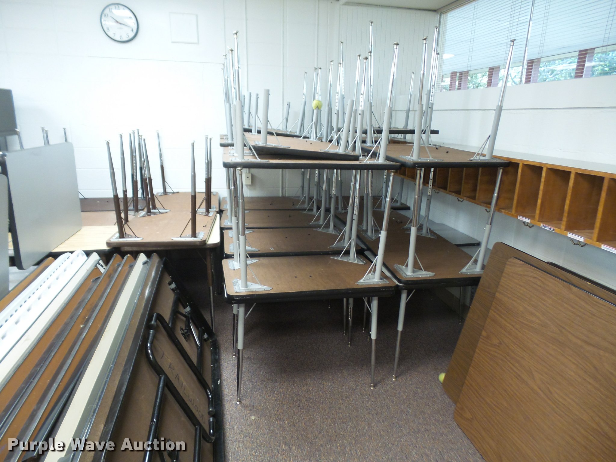 Furniture. (25) 3'W silver tables, (15) 3'W wood tables, (12) 2.5'W wood tables, (3) 4'W silver tables, (3) 4'W wood tables (2) cubbies, (8) 2.5'W silver tables, (4) 4'W wood tables, (10) 3.5'W wood tables, (6) 3.5'W silver tables, (4) 5'W wood tables, (2) five drawer filing cabinets, (14) 6' folding tables, (2) folding tables 8', 6' plastic, Unit# 121. Shawnee Mission School District. Overland Park, KS 66204