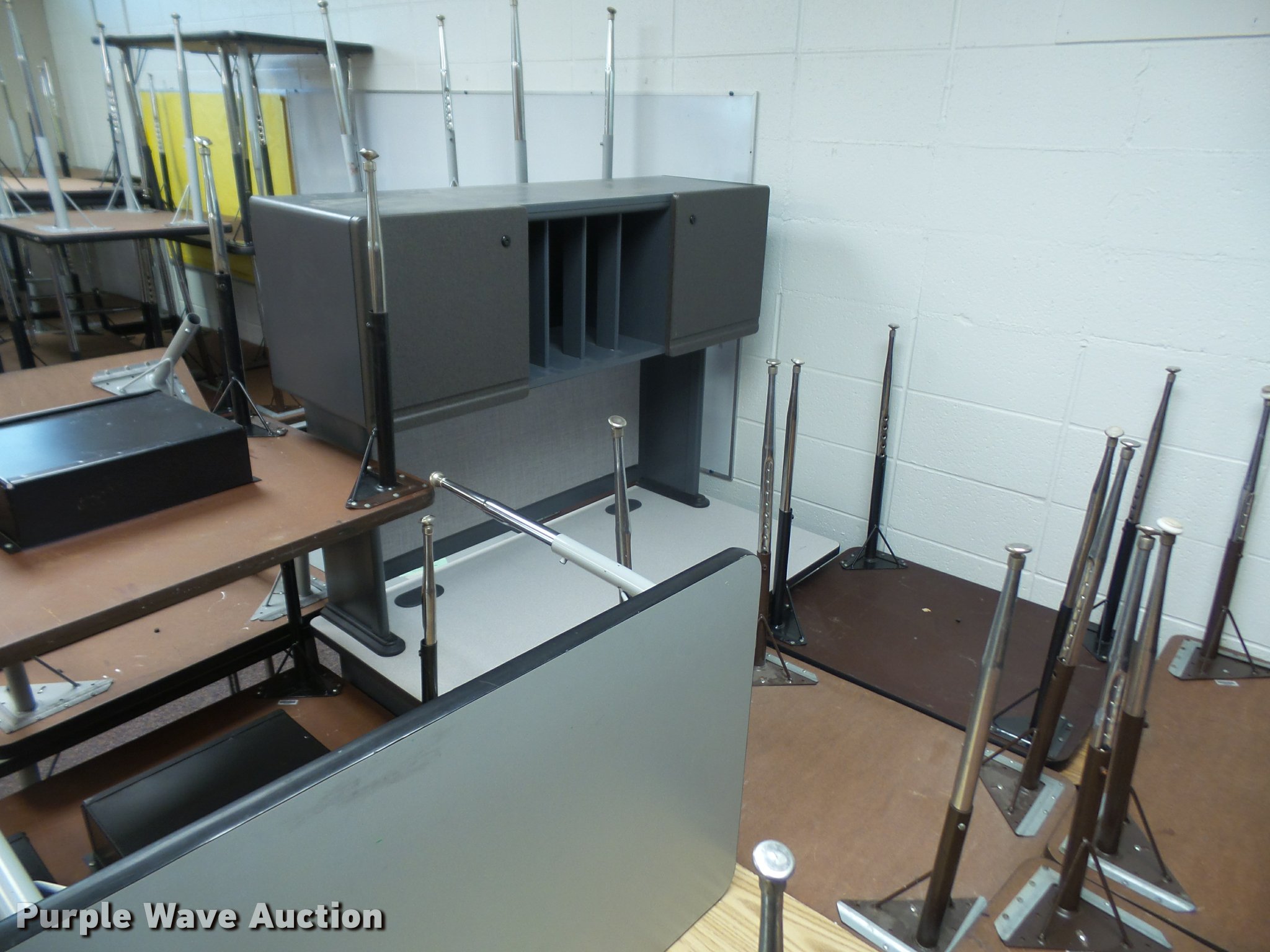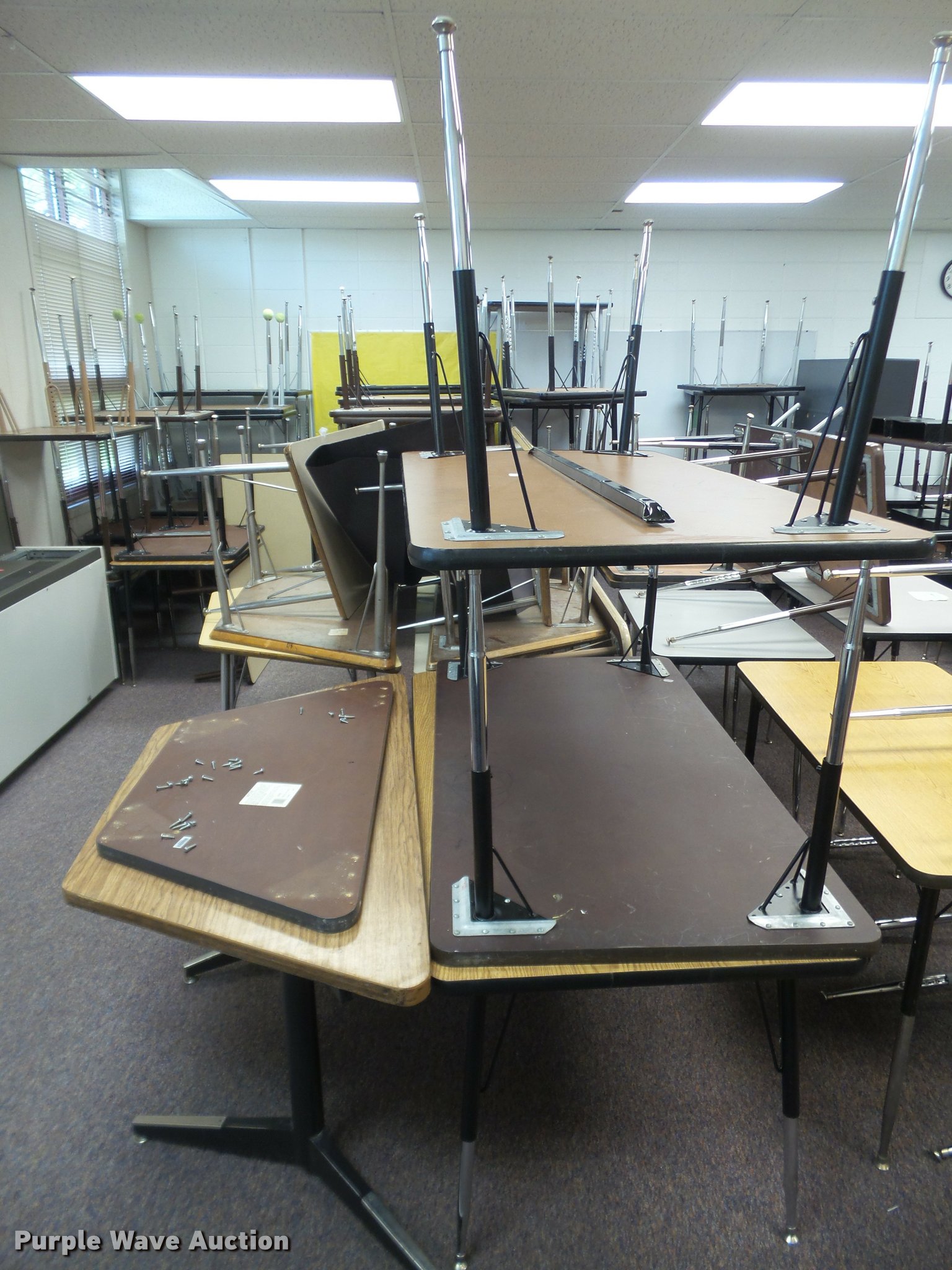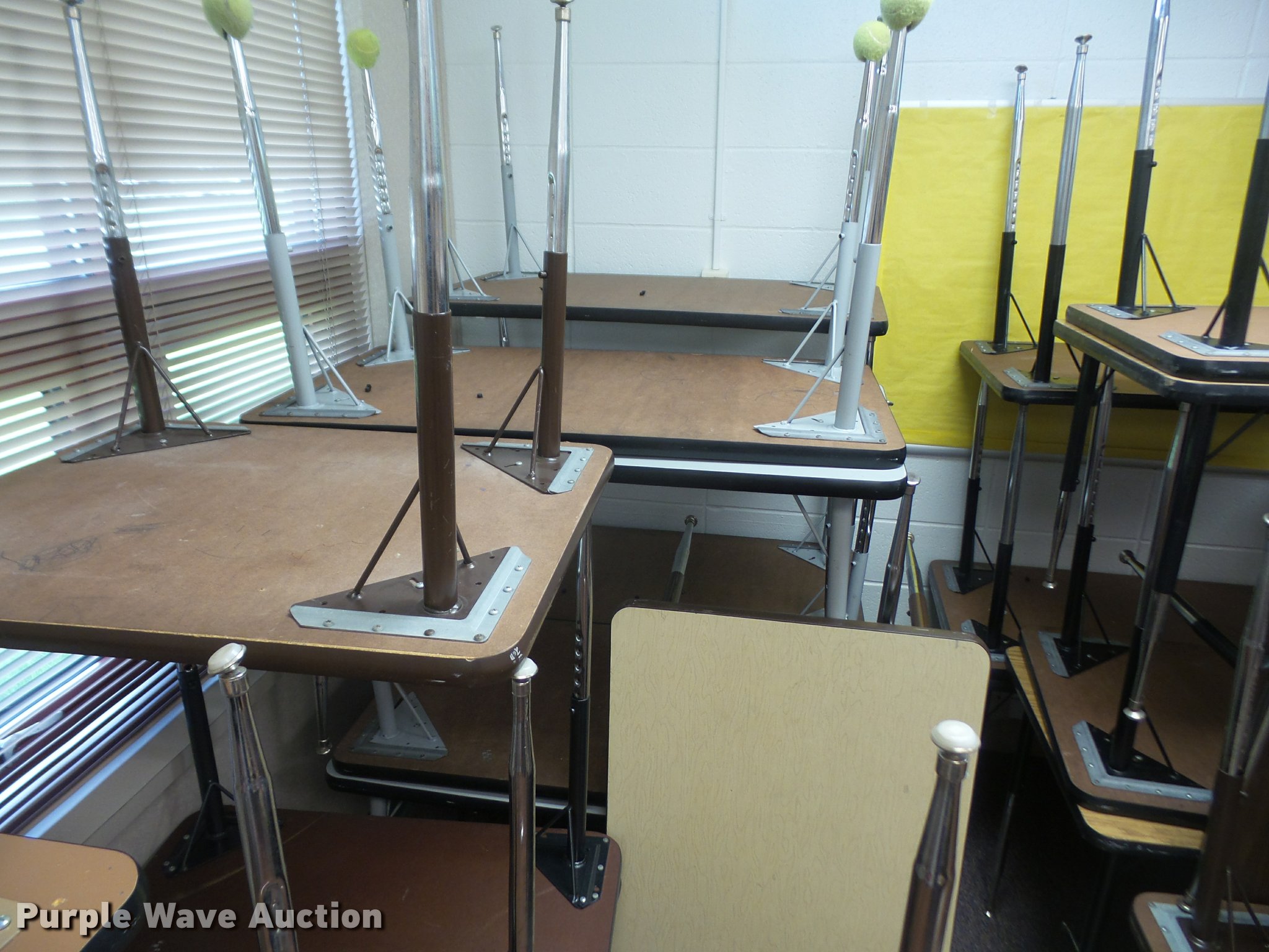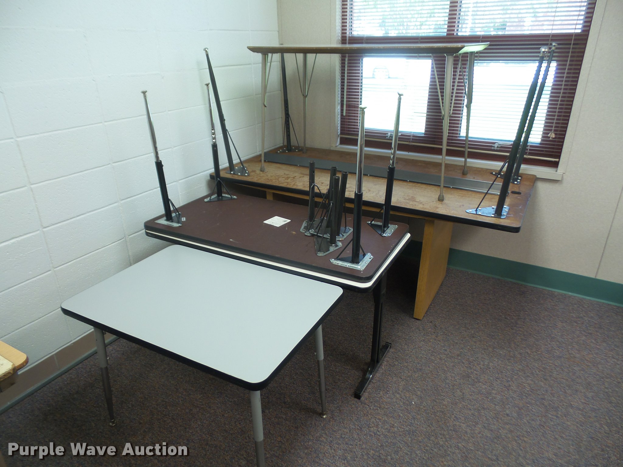 Furniture. (25) 3'W silver tables, (15) 3'W wood tables, (12) 2.5'W wood tables, (3) 4'W silver tables, (3) 4'W wood tables (2) cubbies, (8) 2.5'W silver tables, (4) 4'W wood tables, (10) 3.5'W wood tables, (6) 3.5'W silver tables, (4) 5'W wood tables, (2) five drawer filing cabinets, (14) 6' folding tables, (2) folding tables 8', 6' plastic, Unit# 121. Shawnee Mission School District. Overland Park, KS 66204