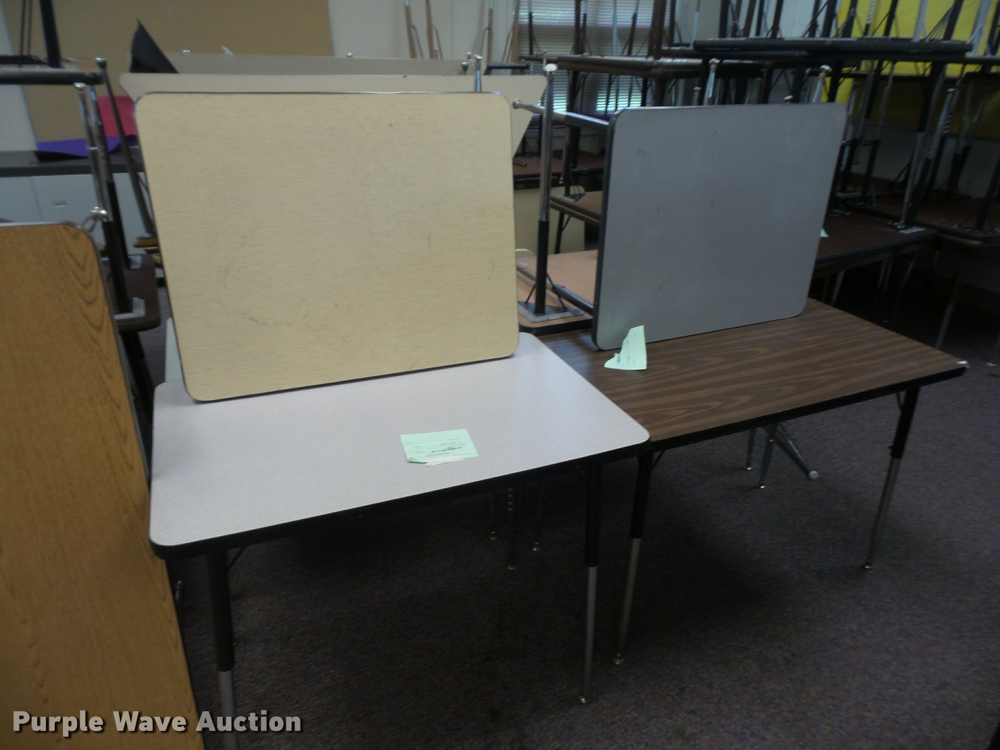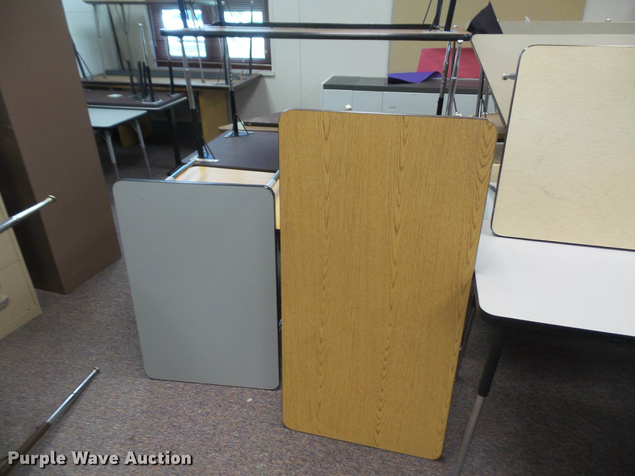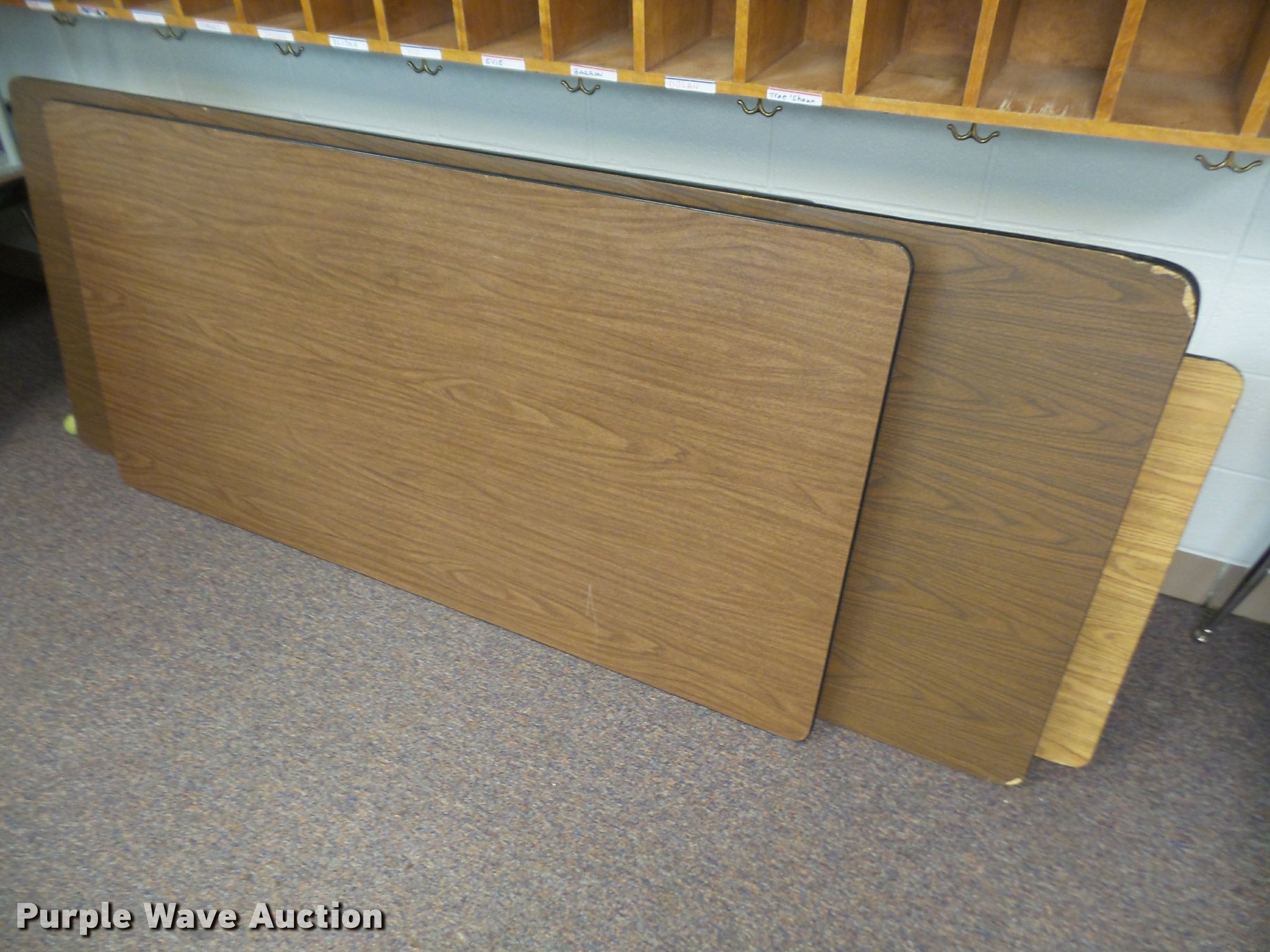 Purple Wave is selling a used Furniture in Kansas. This item is a Furniture with the following: (25) 3'W silver tables, (15) 3'W wood tables, (12) 2.5'W wood tables, (3) 4'W silver tables, (3) 4'W wood tables, (2) cubbies, (8) 2.5'W silver tables, (4) 4'W wood tables, (10) 3.5'W wood tables, (6) 3.5'W silver tables, (4) 5'W wood tables, (2) five drawer filing cabinets, (14) 6' folding tables, (2) folding tables, 8', 6' plastic, Unit# 121