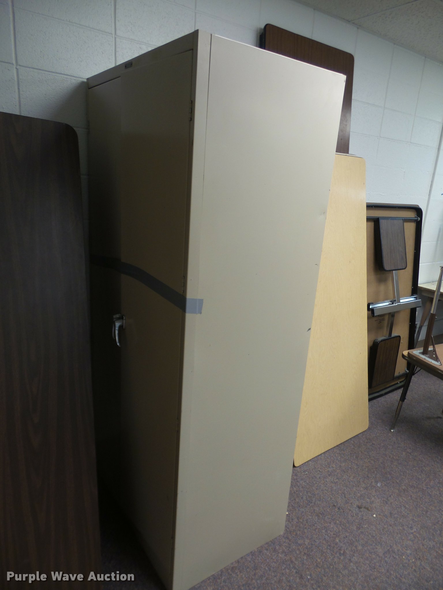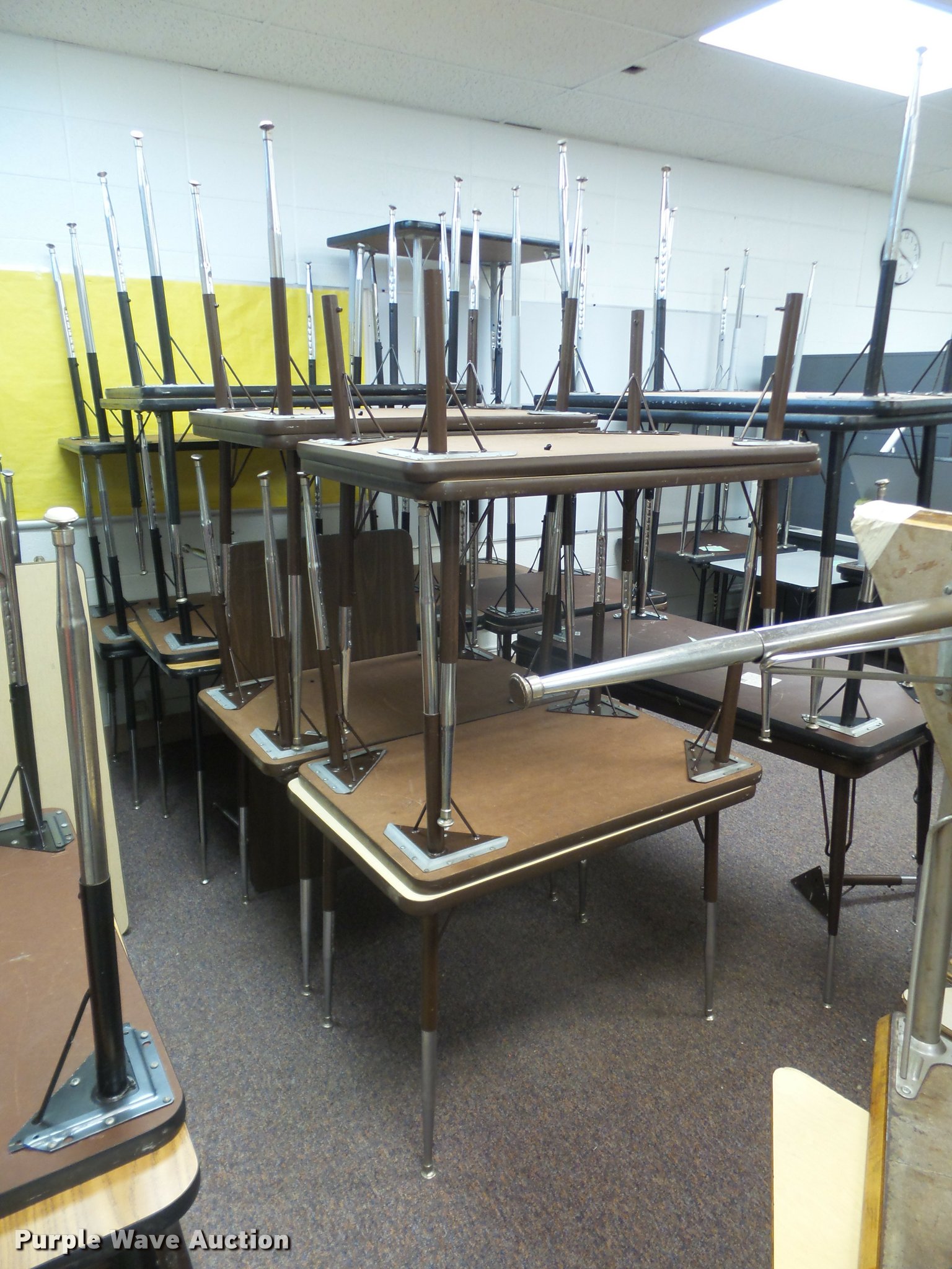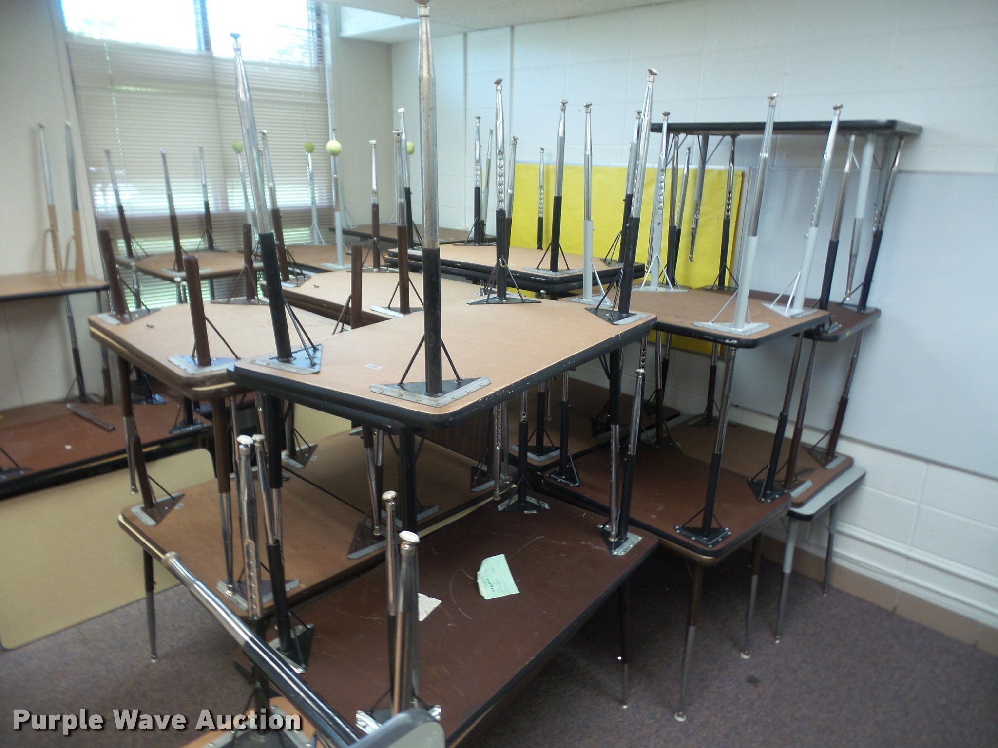Purple Wave is selling a used Furniture in Kansas. This item is a Furniture with the following: (25) 3'W silver tables, (15) 3'W wood tables, (12) 2.5'W wood tables, (3) 4'W silver tables, (3) 4'W wood tables, (2) cubbies, (8) 2.5'W silver tables, (4) 4'W wood tables, (10) 3.5'W wood tables, (6) 3.5'W silver tables, (4) 5'W wood tables, (2) five drawer filing cabinets, (14) 6' folding tables, (2) folding tables, 8', 6' plastic, Unit# 121