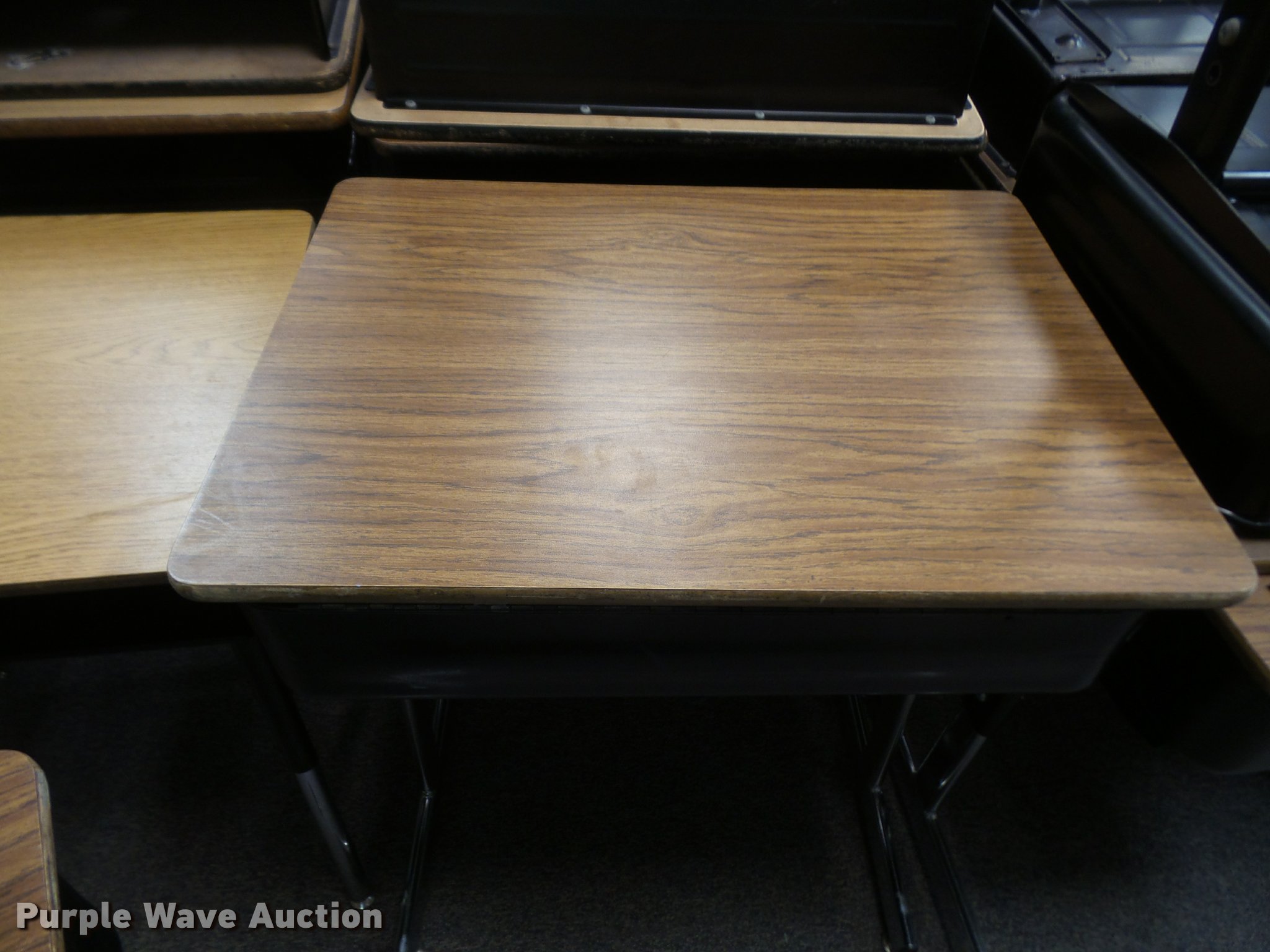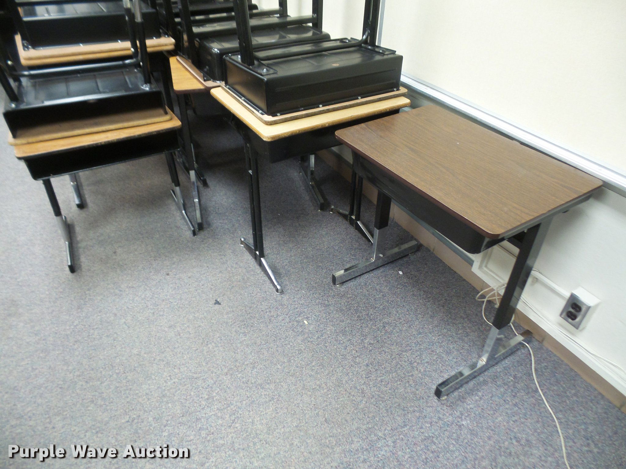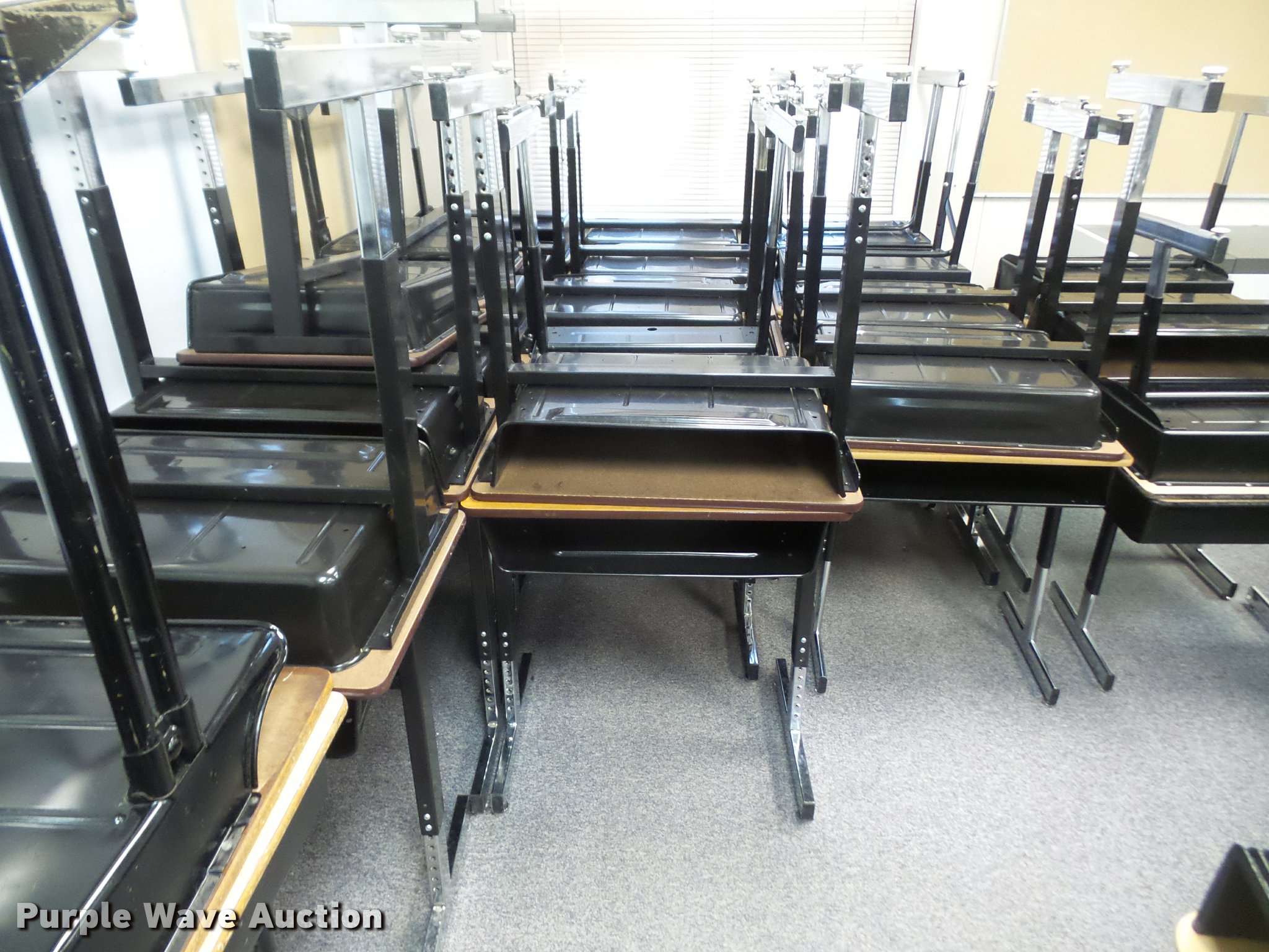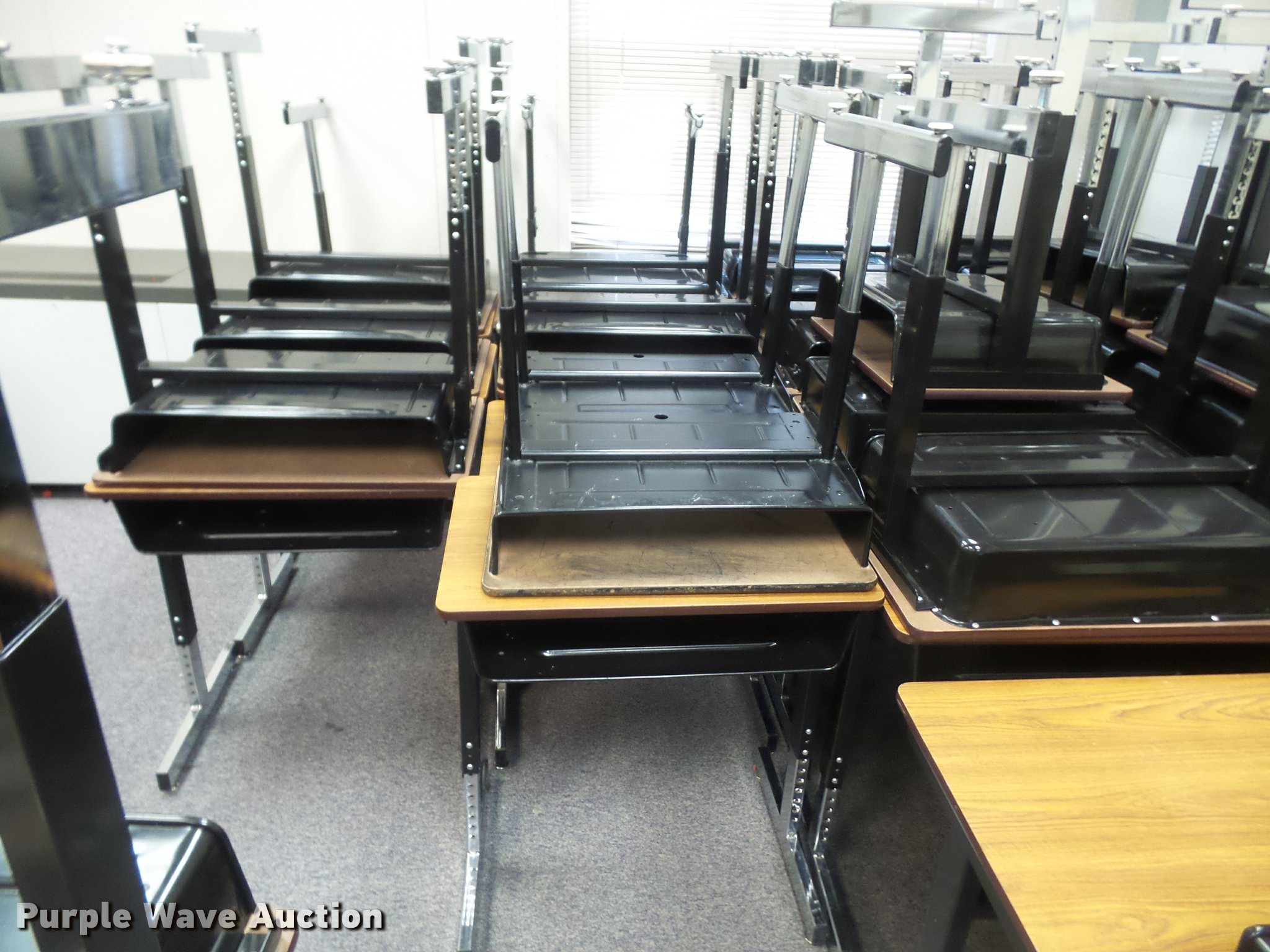 Purple Wave is selling a used Furniture in Kansas. This item is a (254) student desks with the following: (172) wood tops, (82) plastic tops, Most are 24"W x 18"D, Most are adjustable height, Unit# 123