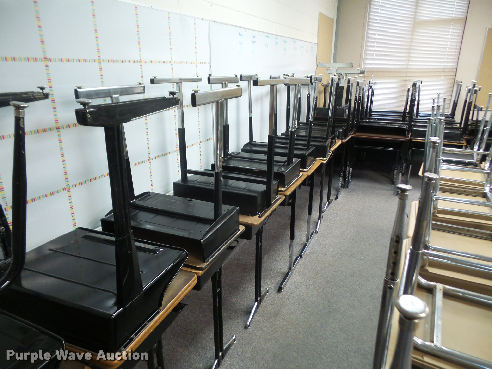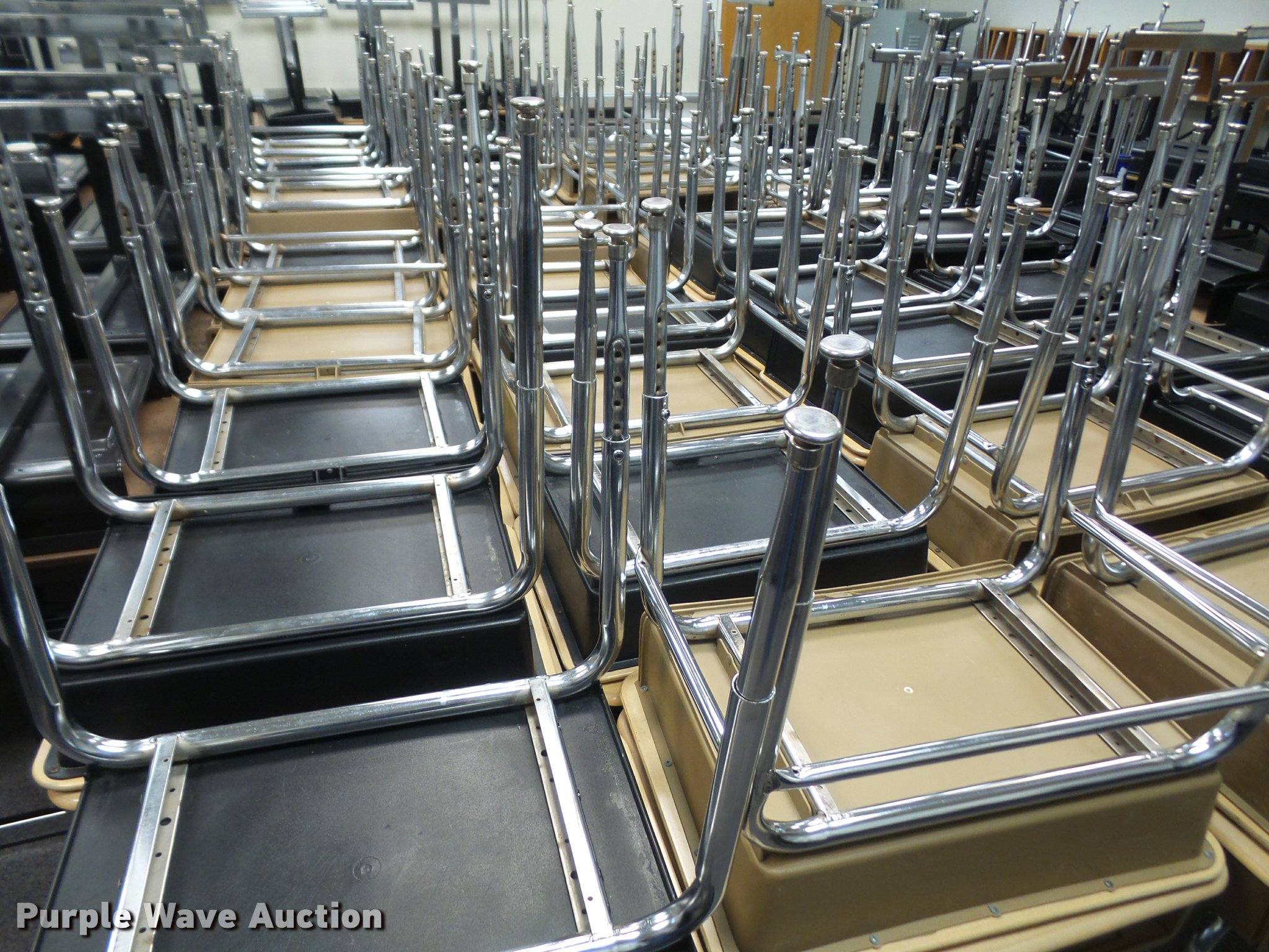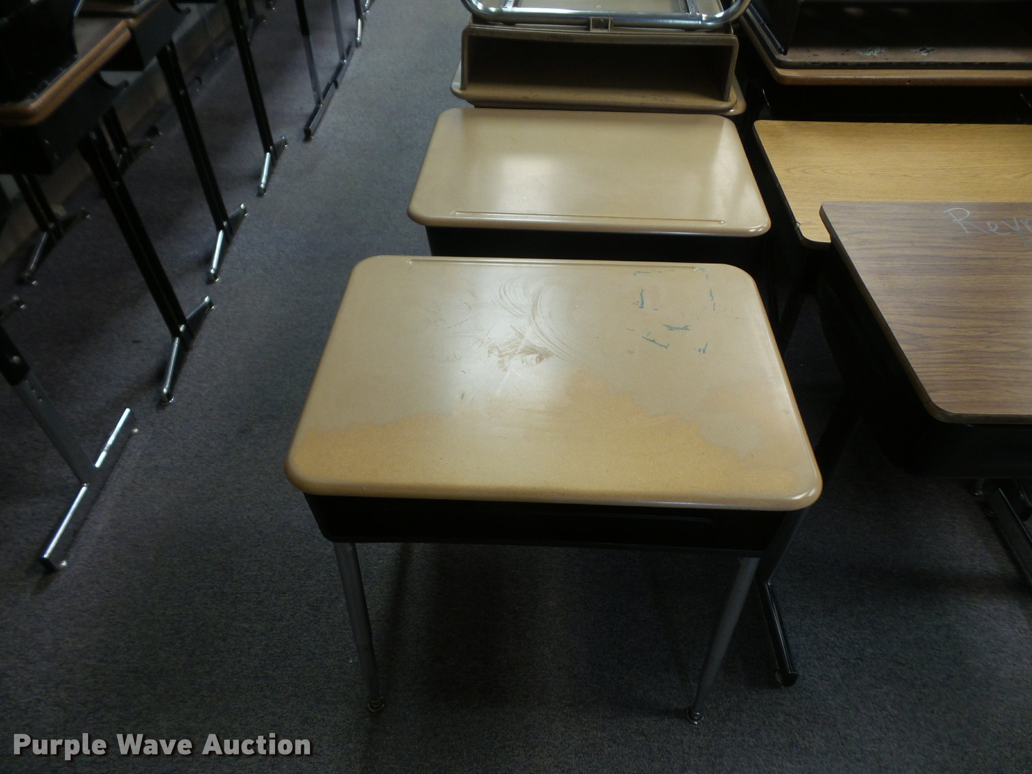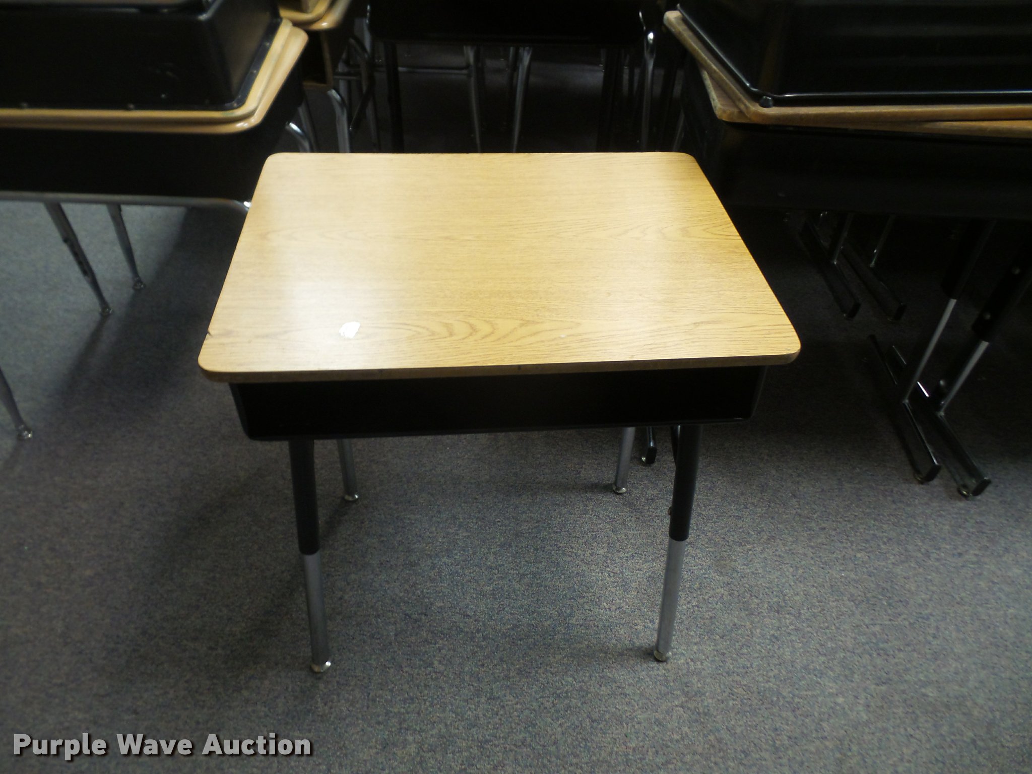 Purple Wave is selling a used Furniture in Kansas. This item is a (254) student desks with the following: (172) wood tops, (82) plastic tops, Most are 24"W x 18"D, Most are adjustable height, Unit# 123