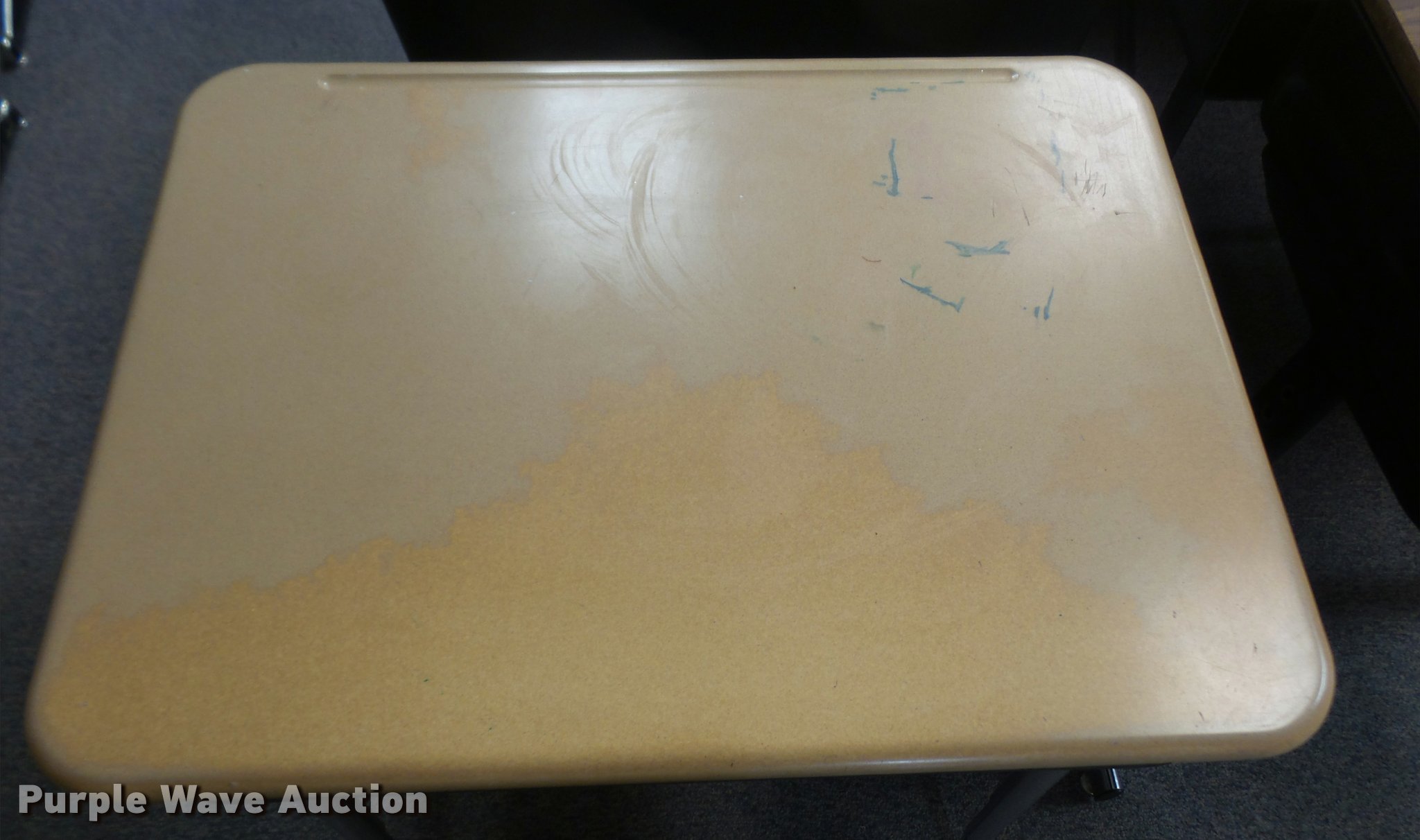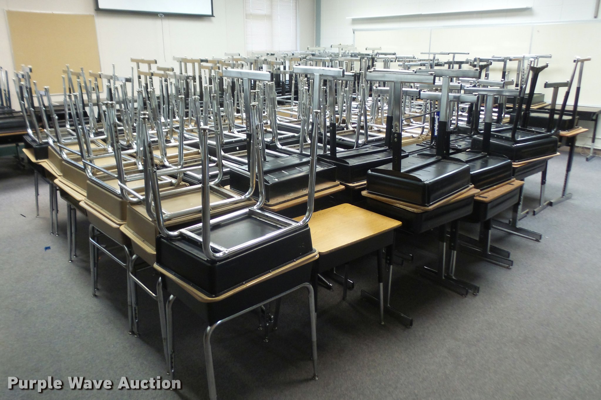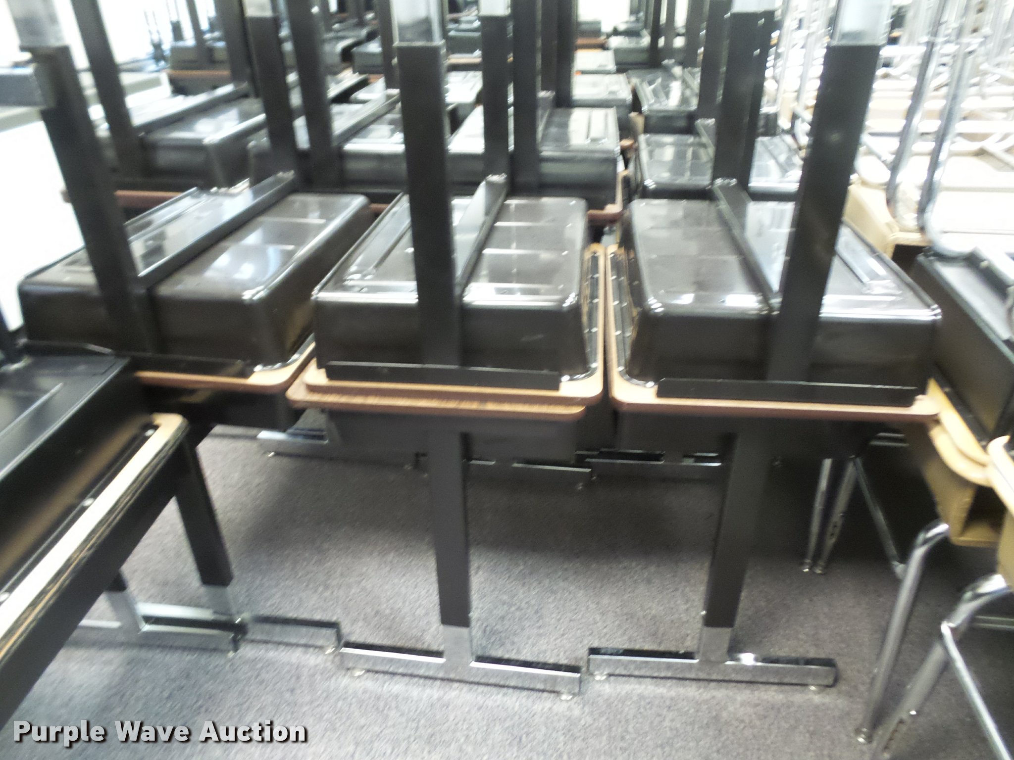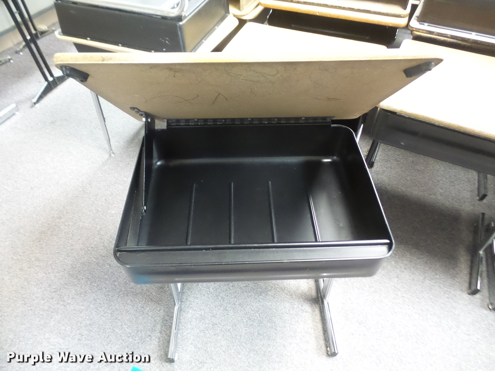 Purple Wave is selling a used Furniture in Kansas. This item is a (254) student desks with the following: (172) wood tops, (82) plastic tops, Most are 24"W x 18"D, Most are adjustable height, Unit# 123