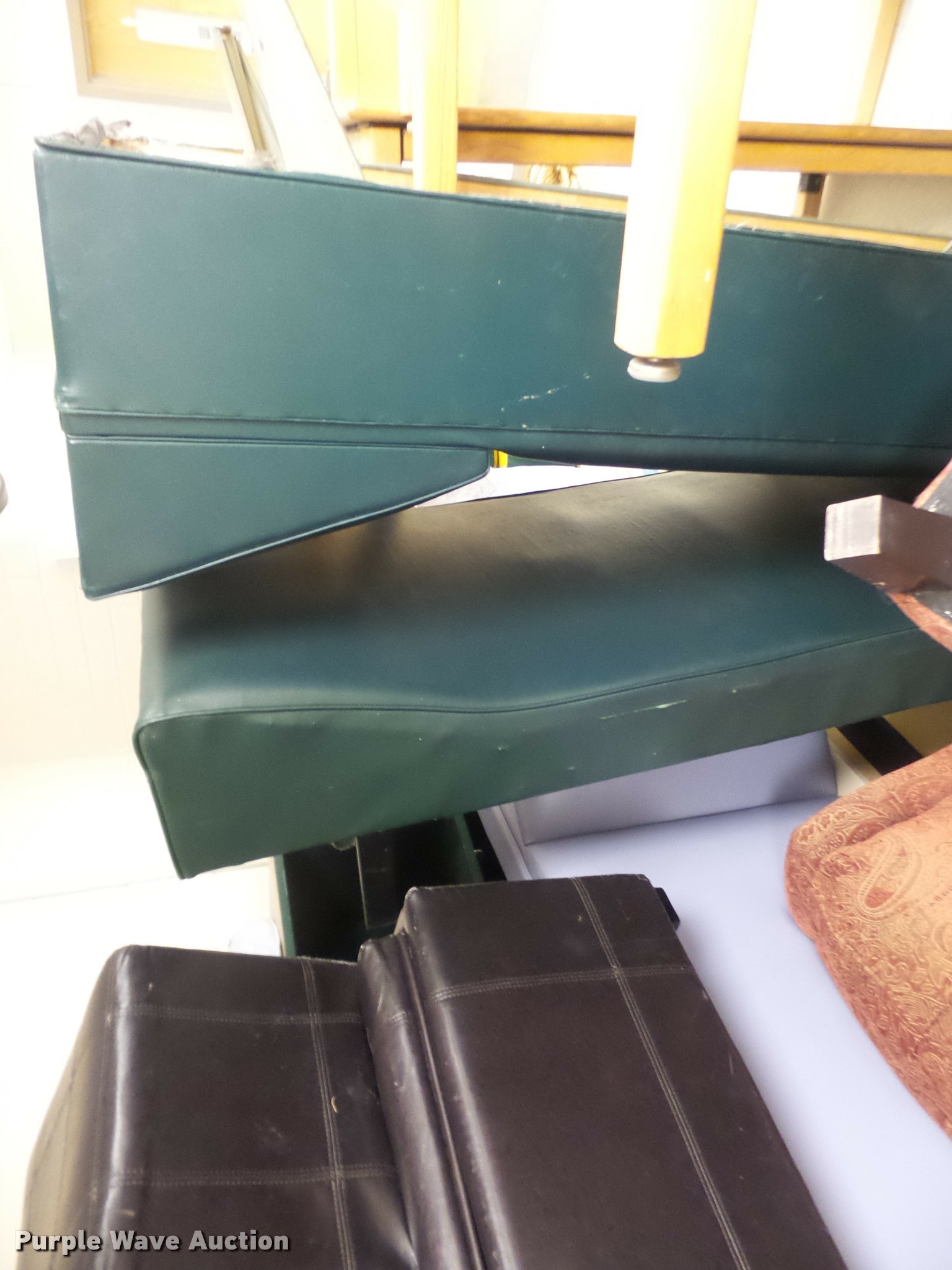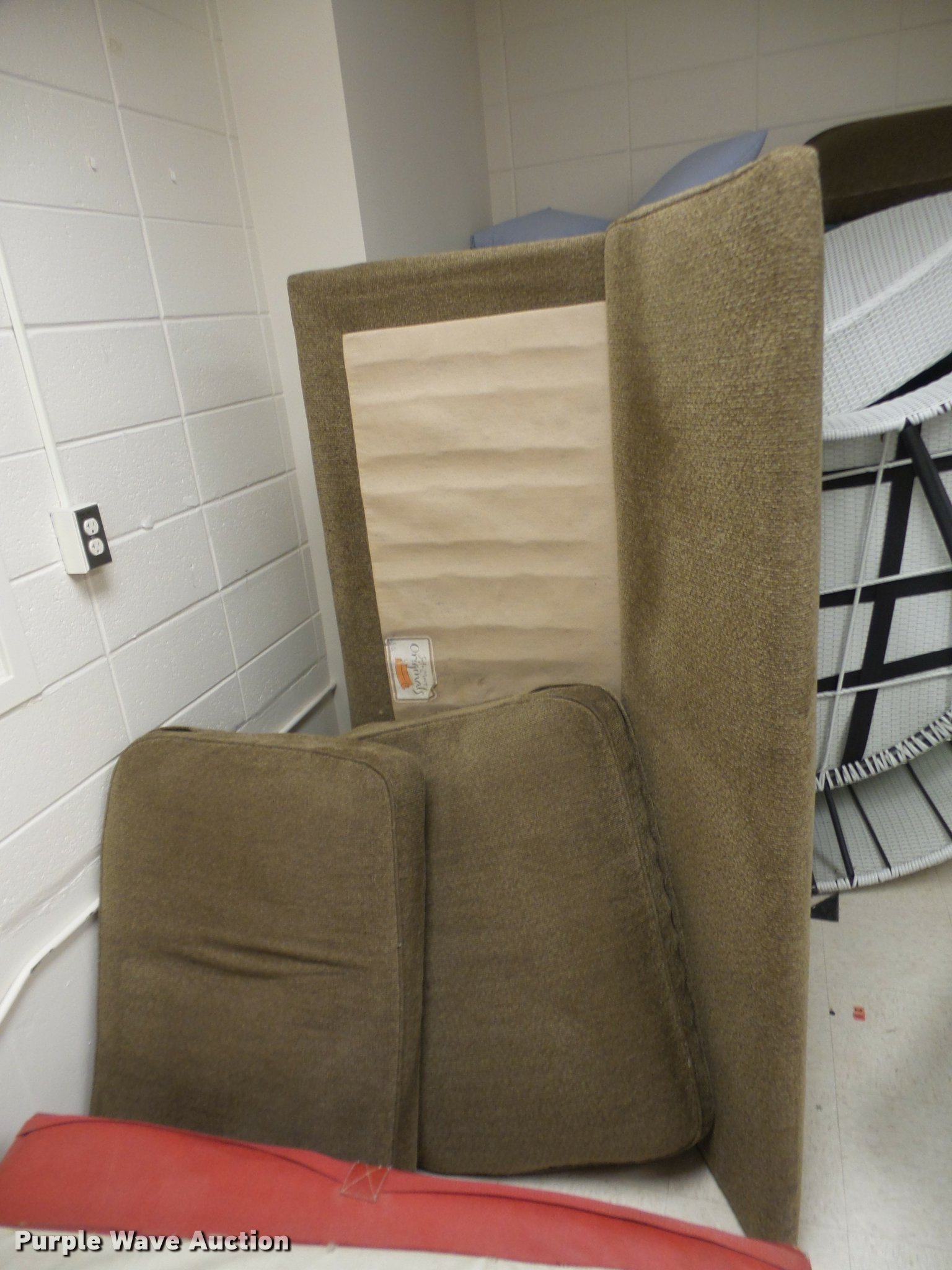 Purple Wave is selling a used Furniture in Kansas. This item is a Furniture with the following: (3) nurse beds, (5) 5' library tables, (5) wood chairs, (6) cushion chairs, (3) 3' silver tables, 2.5' silver table, (4) cushion chairs, Wicker seat, Love seat, Unit# 132B