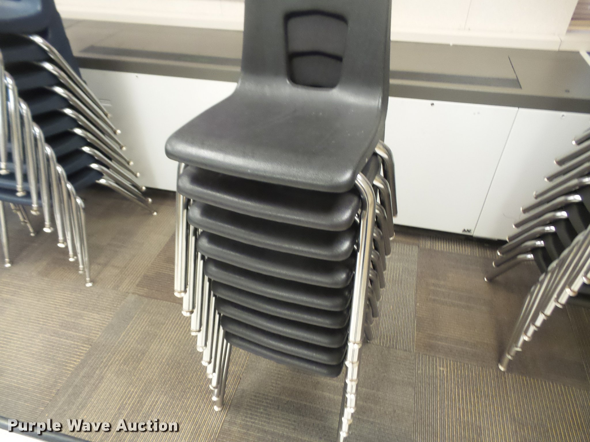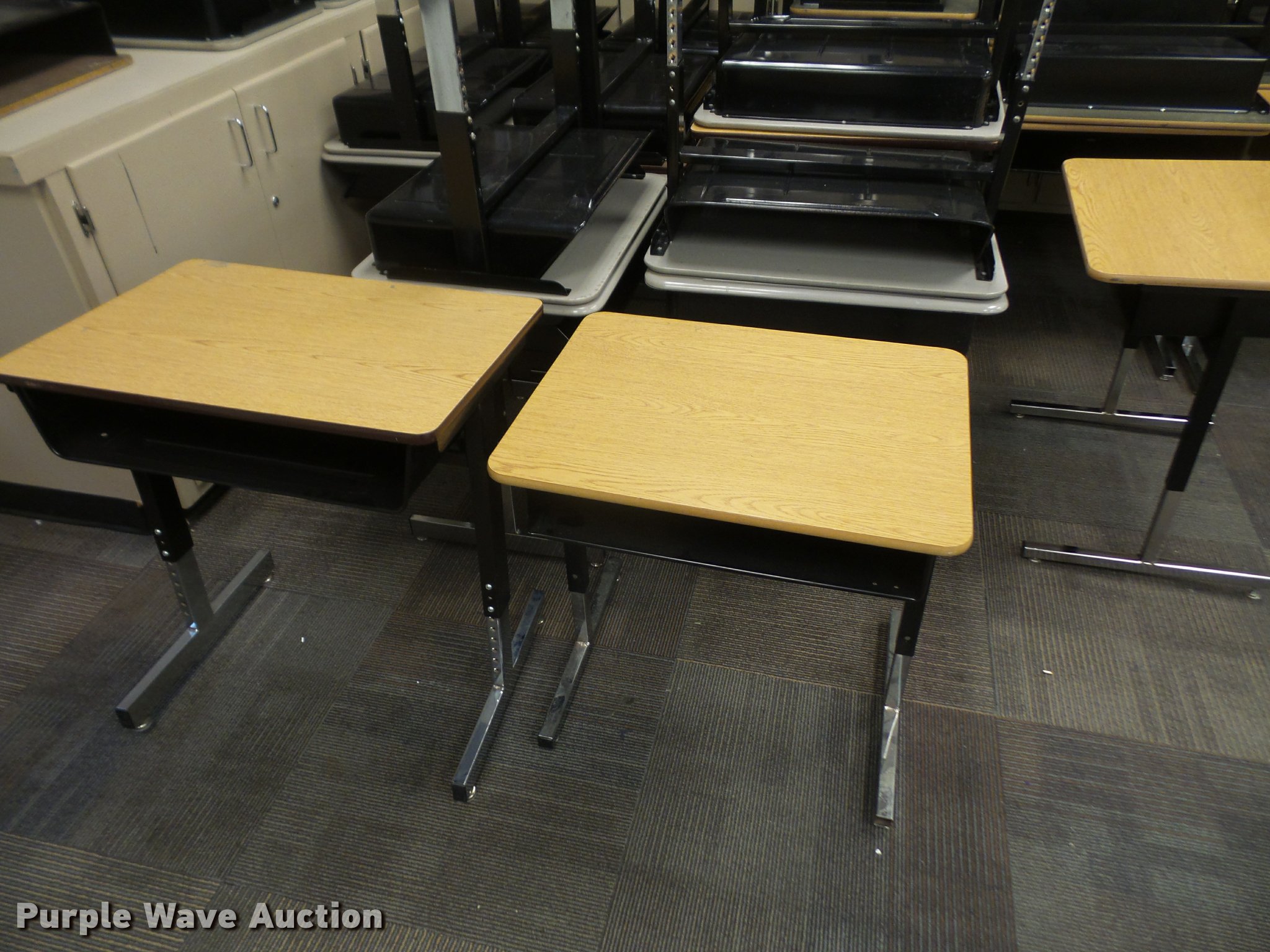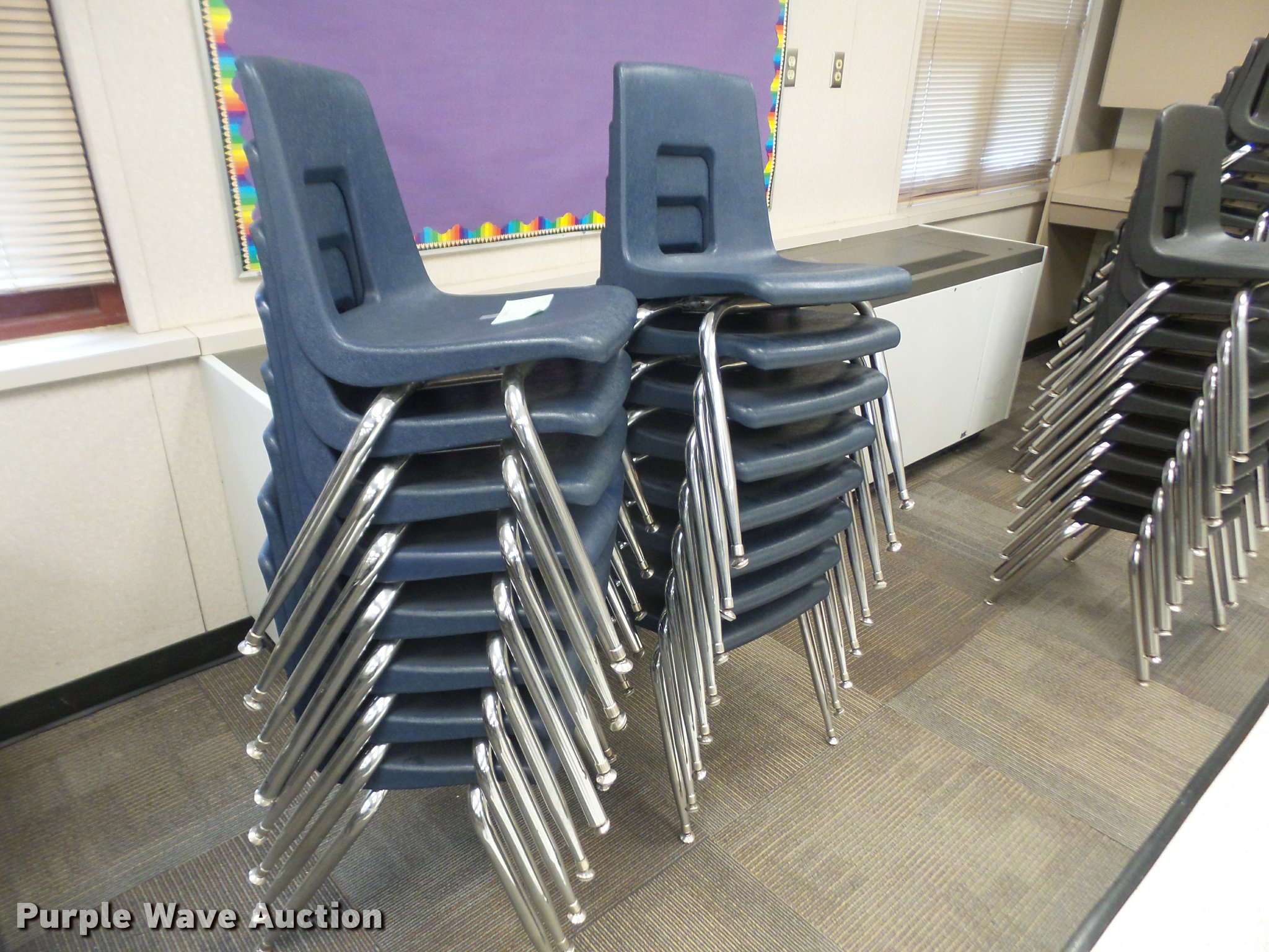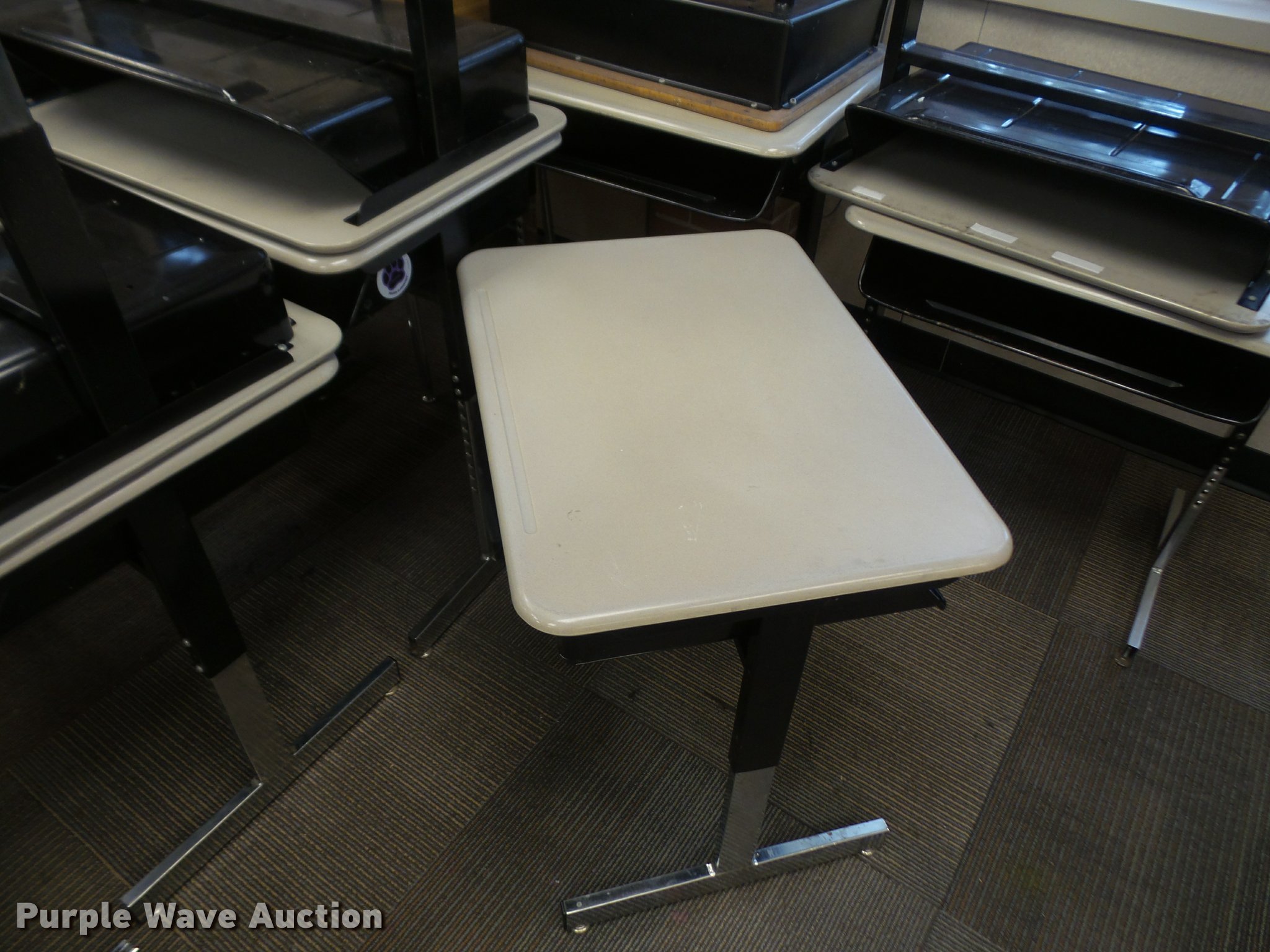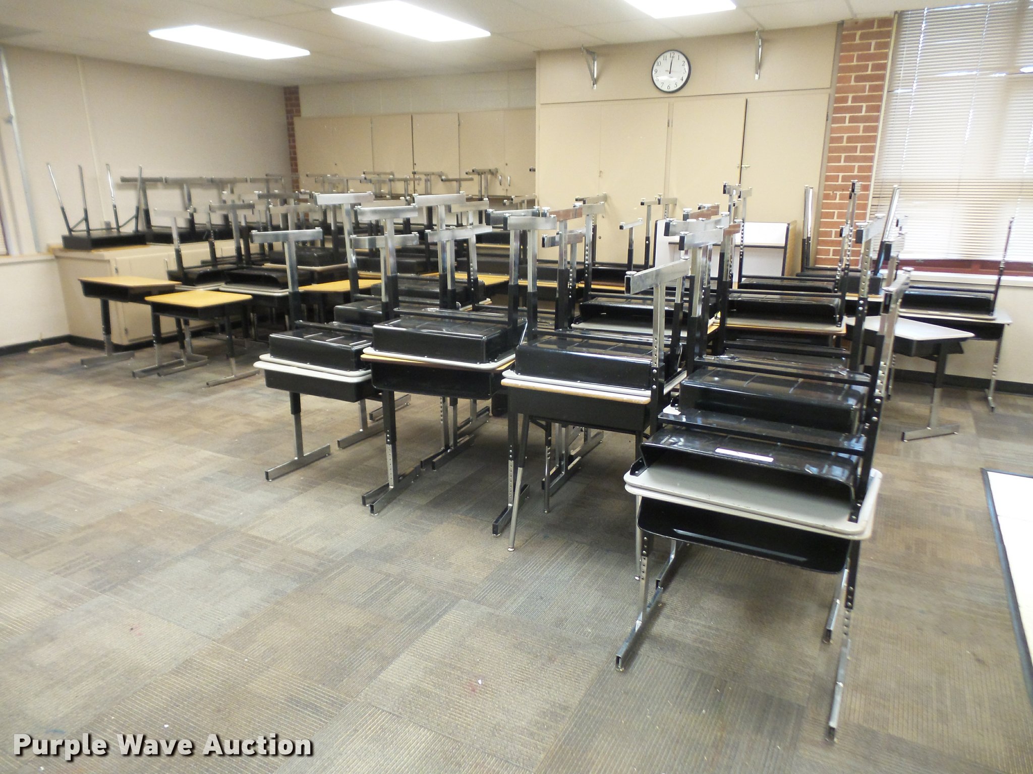 Purple Wave is selling a used Furniture in Kansas. This item is a Furniture with the following: (124) student desks, Wood and plastic style tops, (34) 16" four leg chairs, (16) 18" four leg chairs, Computer desk, Unit# 16