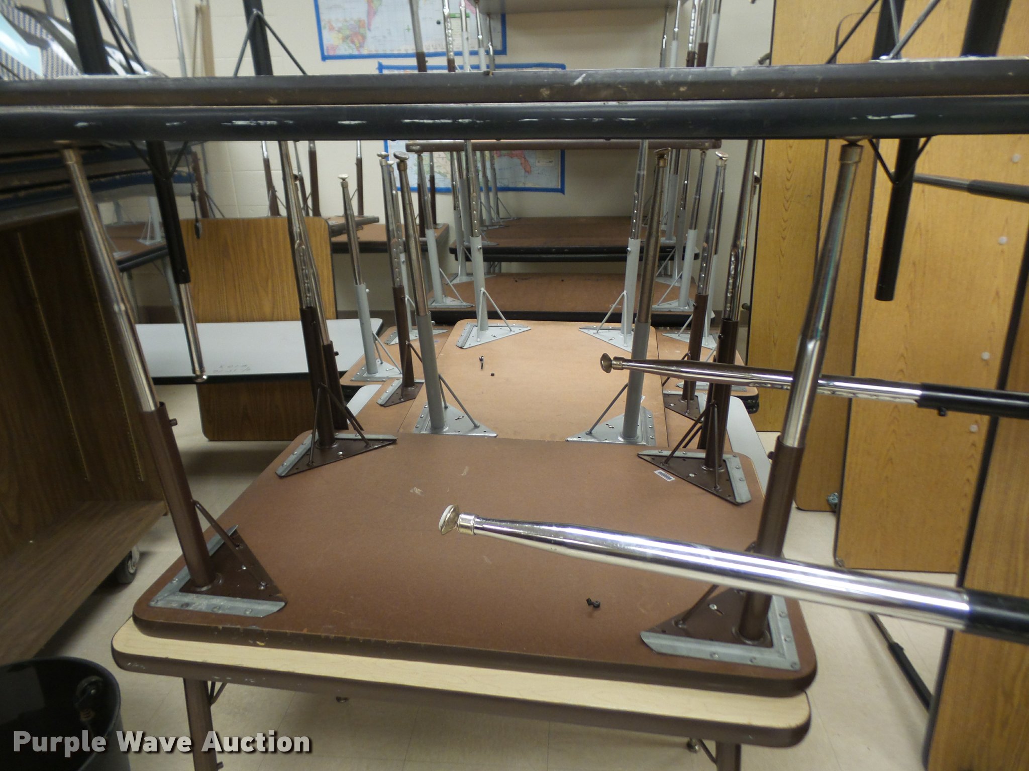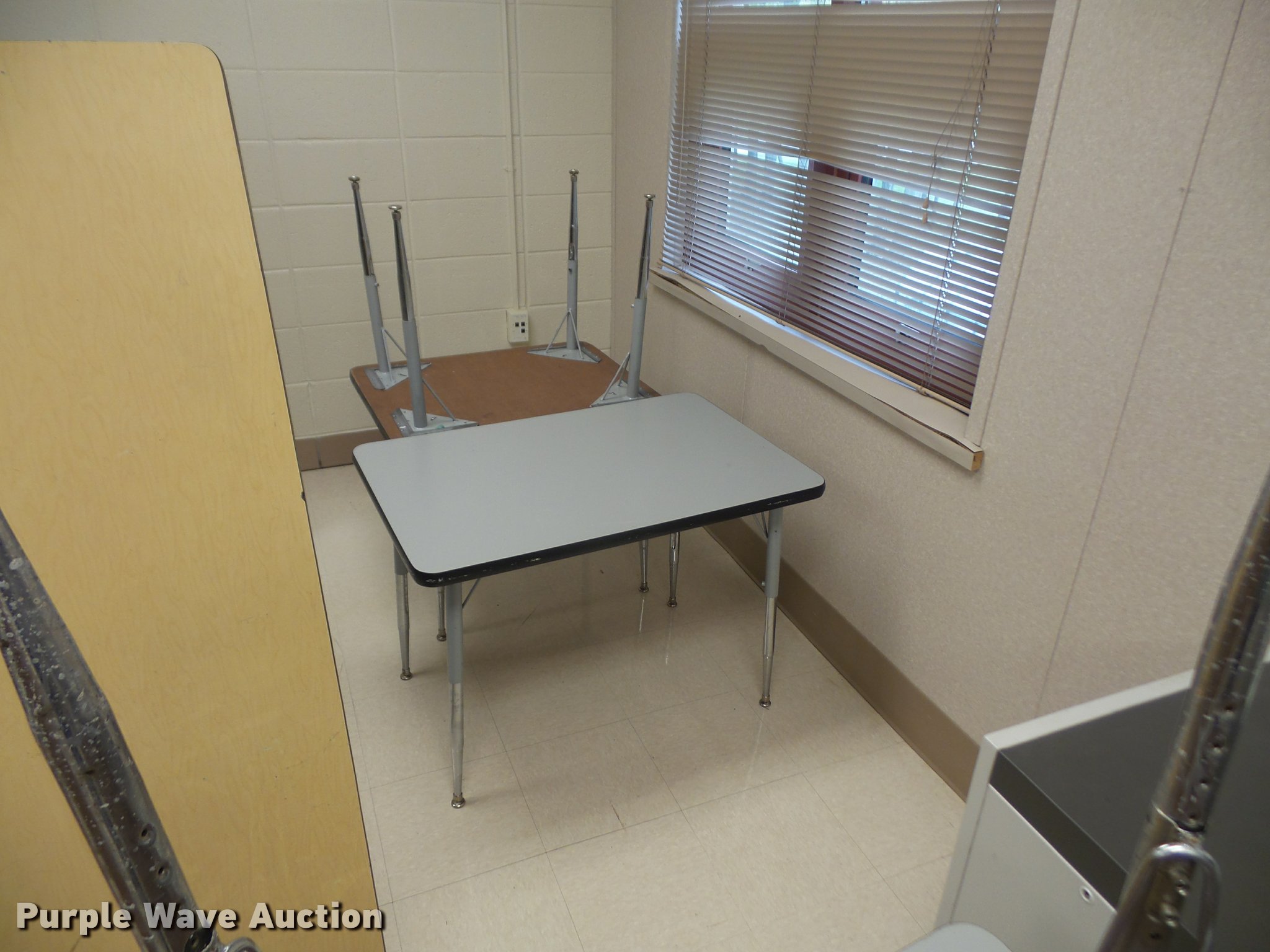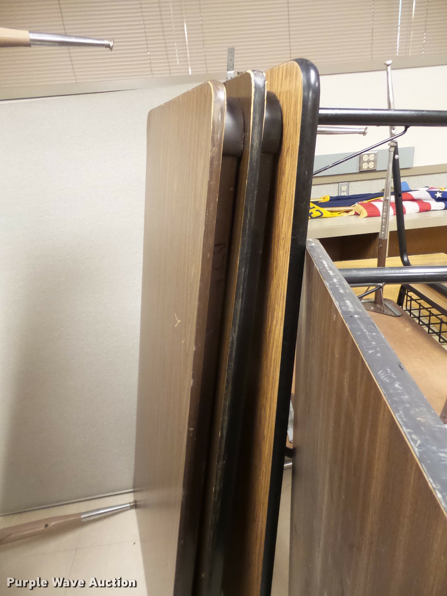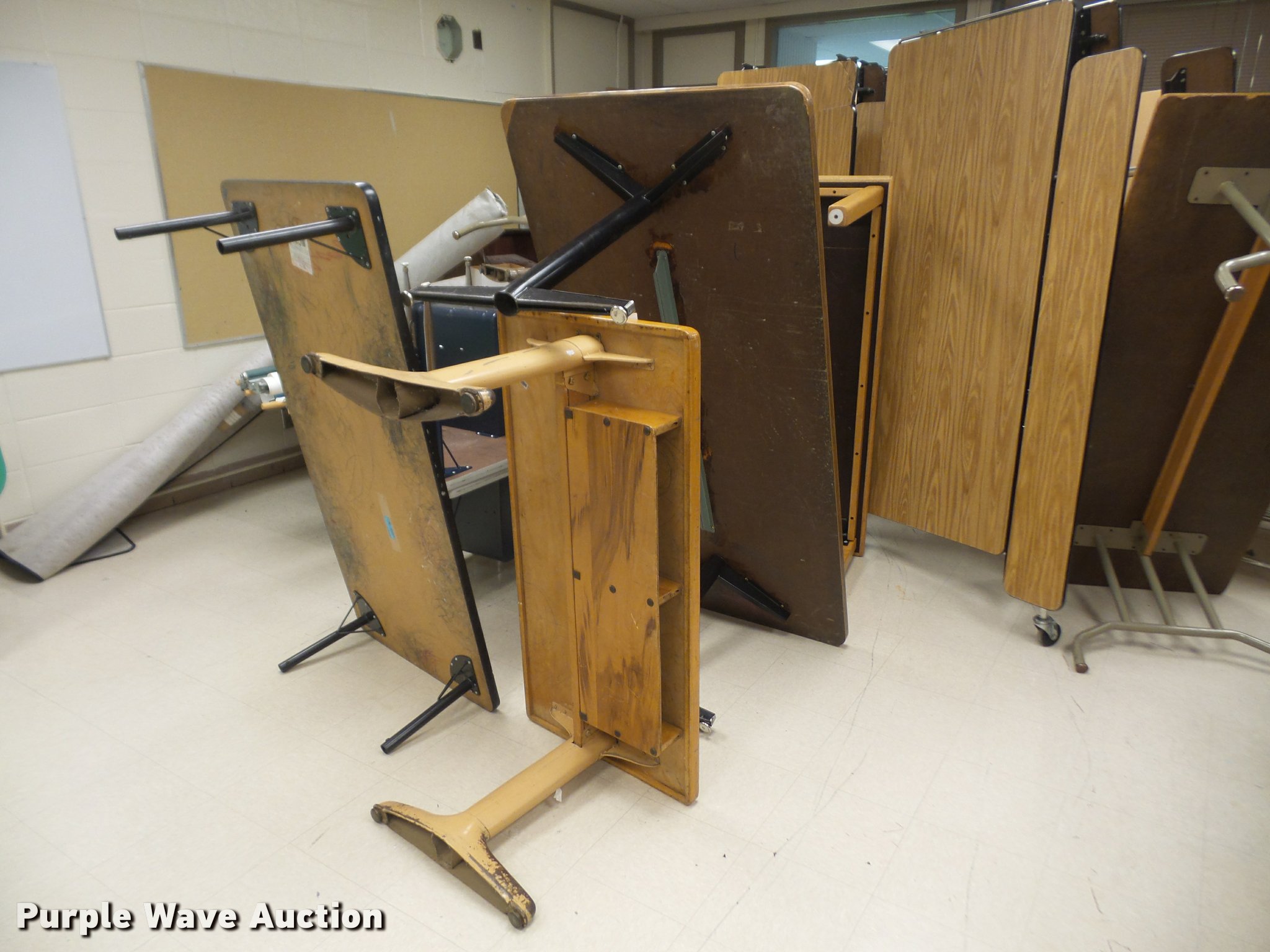 Purple Wave is selling a used Furniture in Kansas. This item is a Furniture with the following: (3) 12' folding lunch tables, (20) 3' tables, (9) 2.5' tables, (4) 6' tables, (14) 4' tables, (5) 5' tables, (2) 4' round tables, Assorted tables, Unit# 138