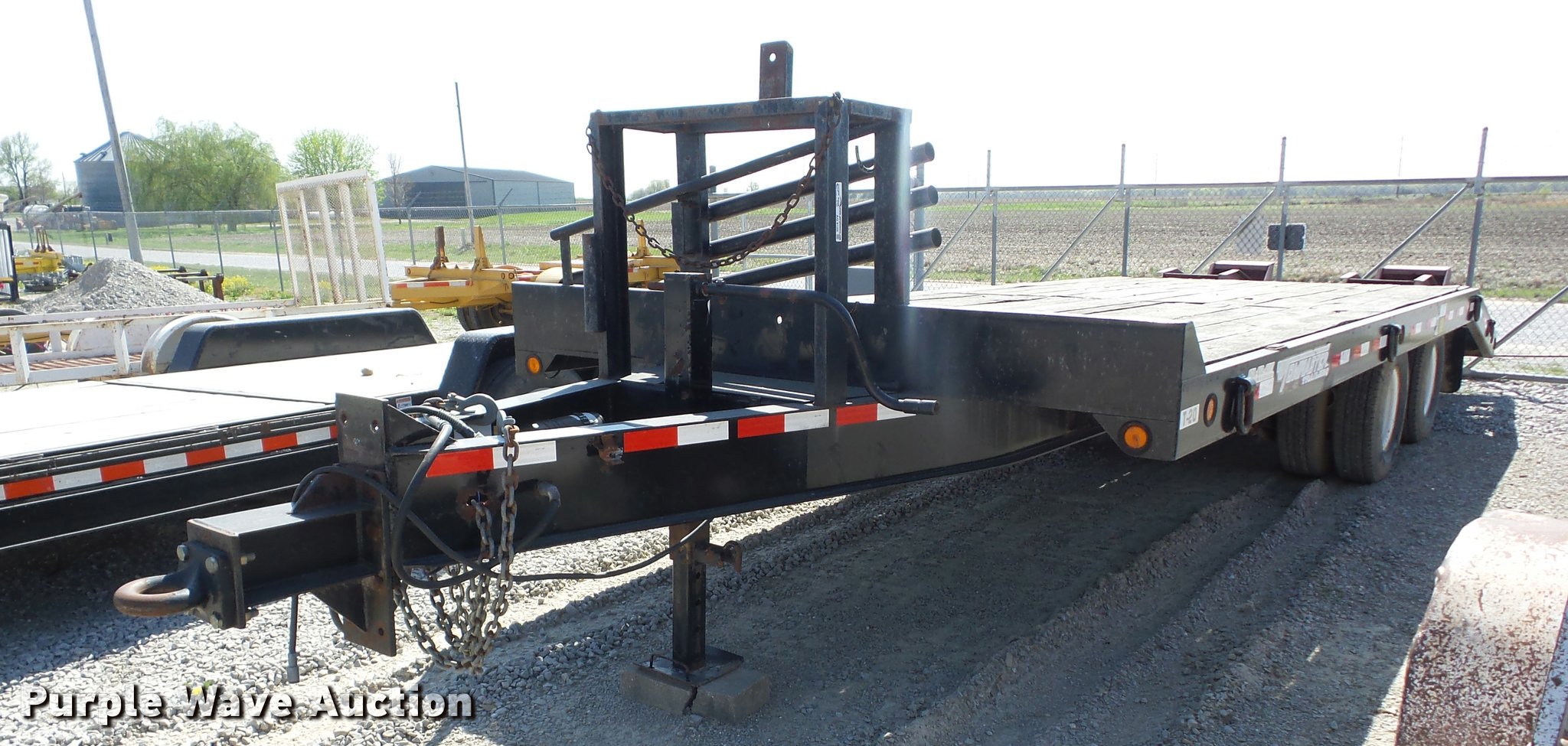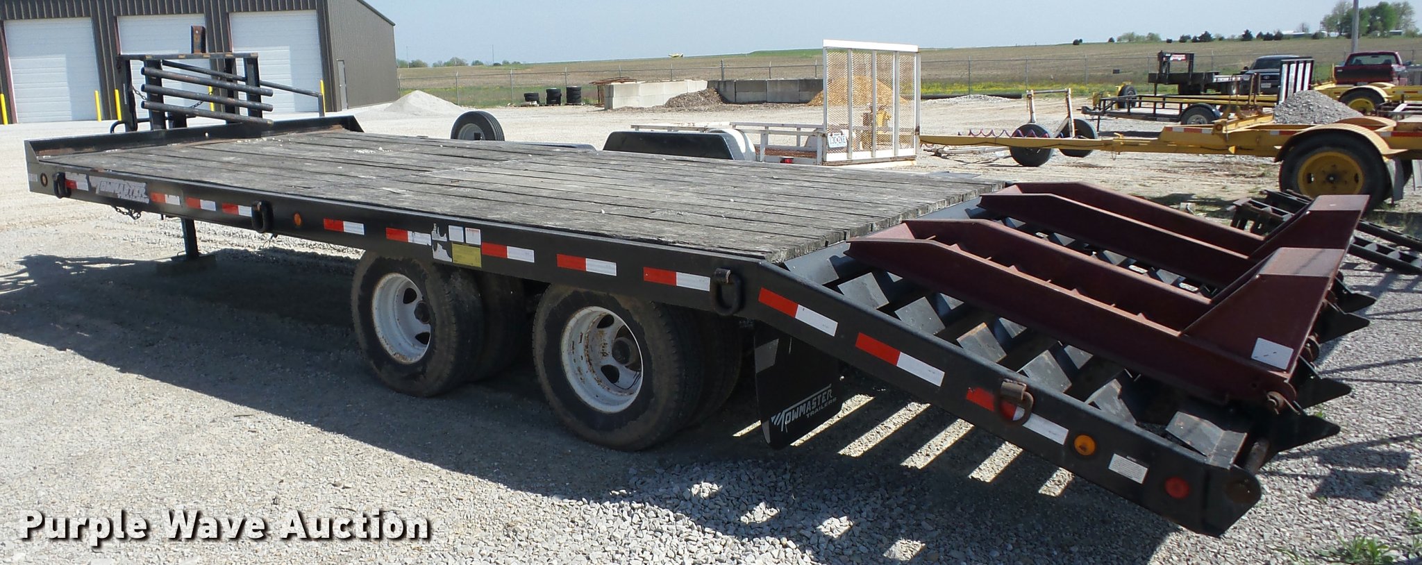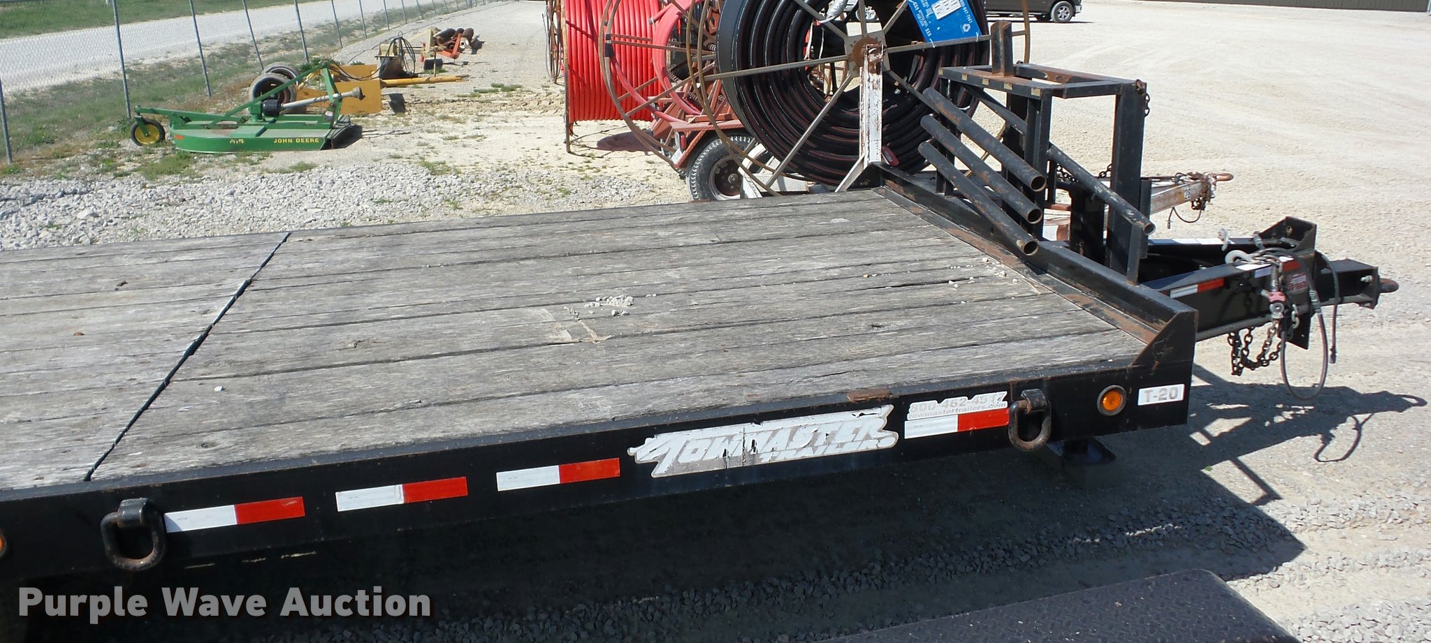 Purple Wave is selling a used Equip. Trailer in Missouri. This item is a 2005 Towmaster T20 equipment trailer with the following: 24'L x 102"W, 5'L dovetail, Ramps, Wood deck, D-ring tie downs, Single leg landing gear, Pintle hitch, Tandem axle, Spring suspension, Air brakes, Steel wheels