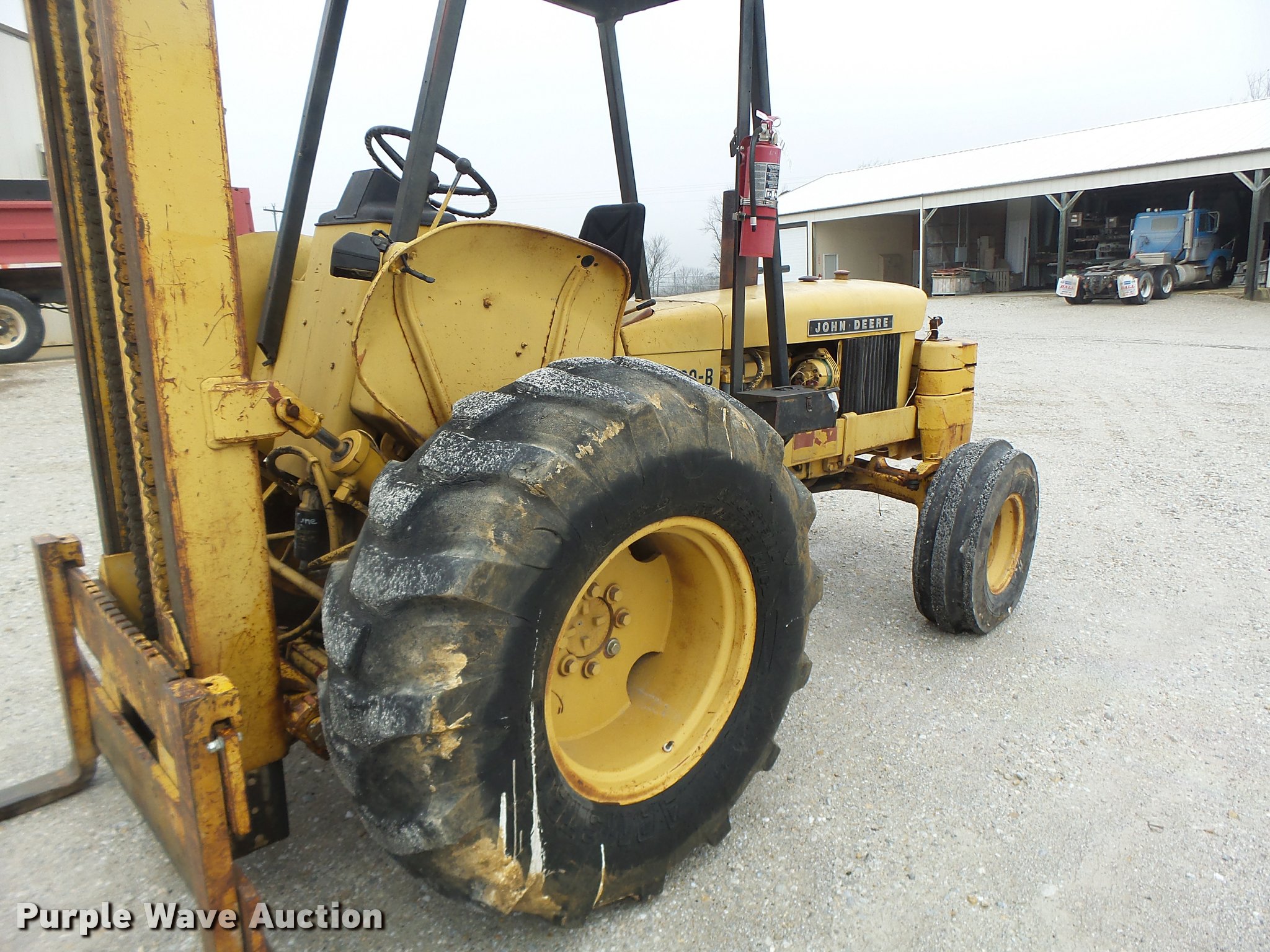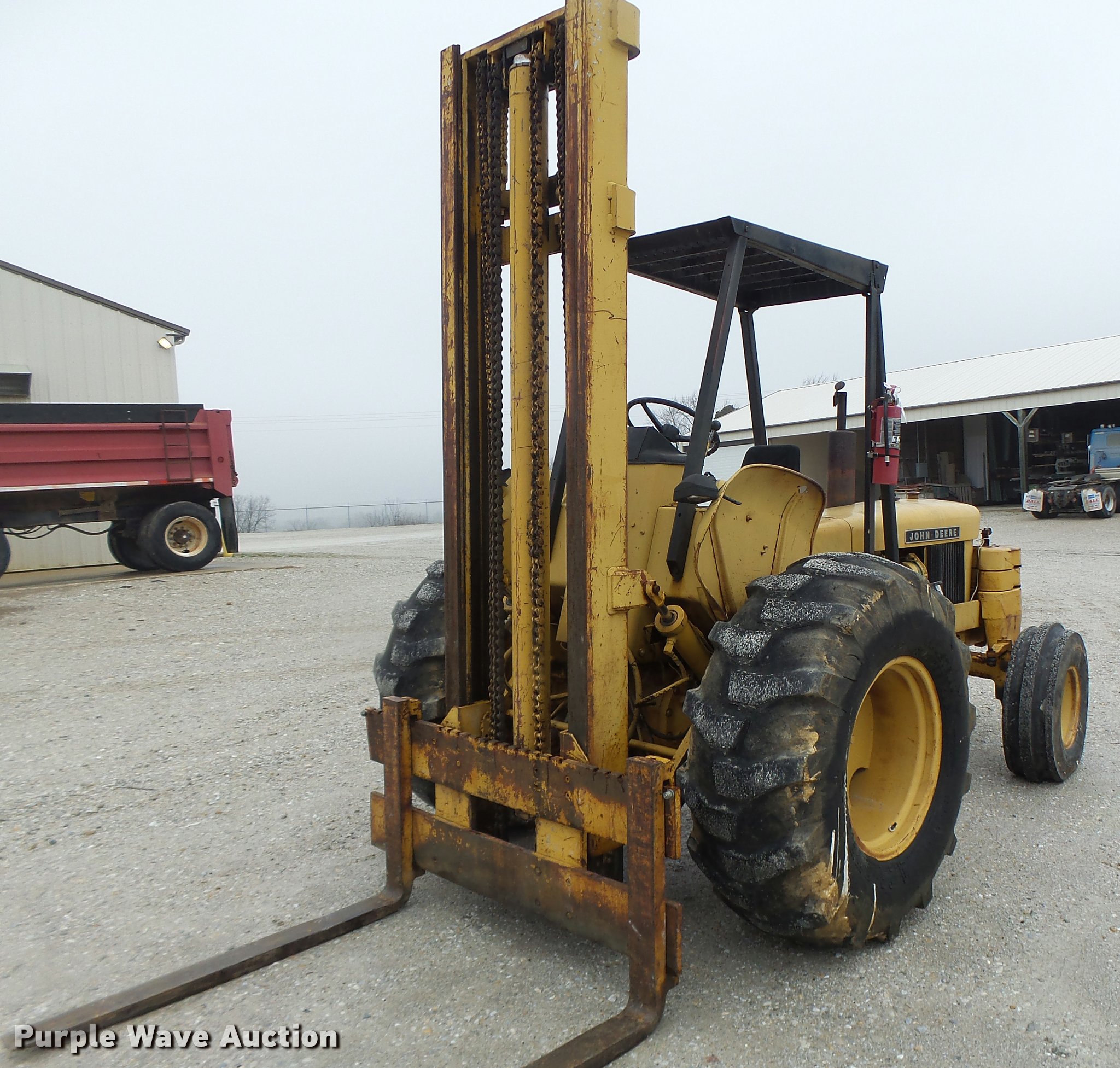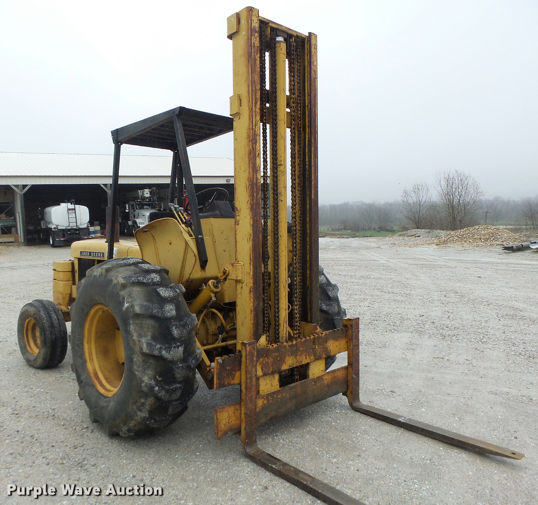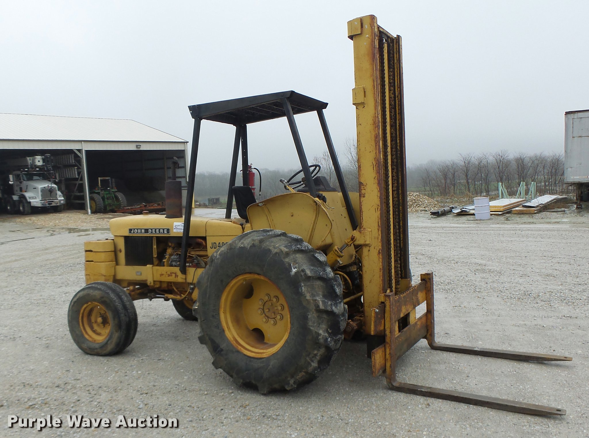 Purple Wave is selling a used Strt. Mast Rough Terr. Forklift in Missouri. This item is a John Deere 480-B forklift with the following: 4,092 hours on meter, John Deere four cylinder diesel engine, Manual transmission, 8F-8R gears, Canopy, 5,000 lbs maximum lift capacity, 21' maximum lift height, 48"L forks, Side shift, Counter weights, 19.5L-24 tires, 11L-15 tires, Serial 347155T