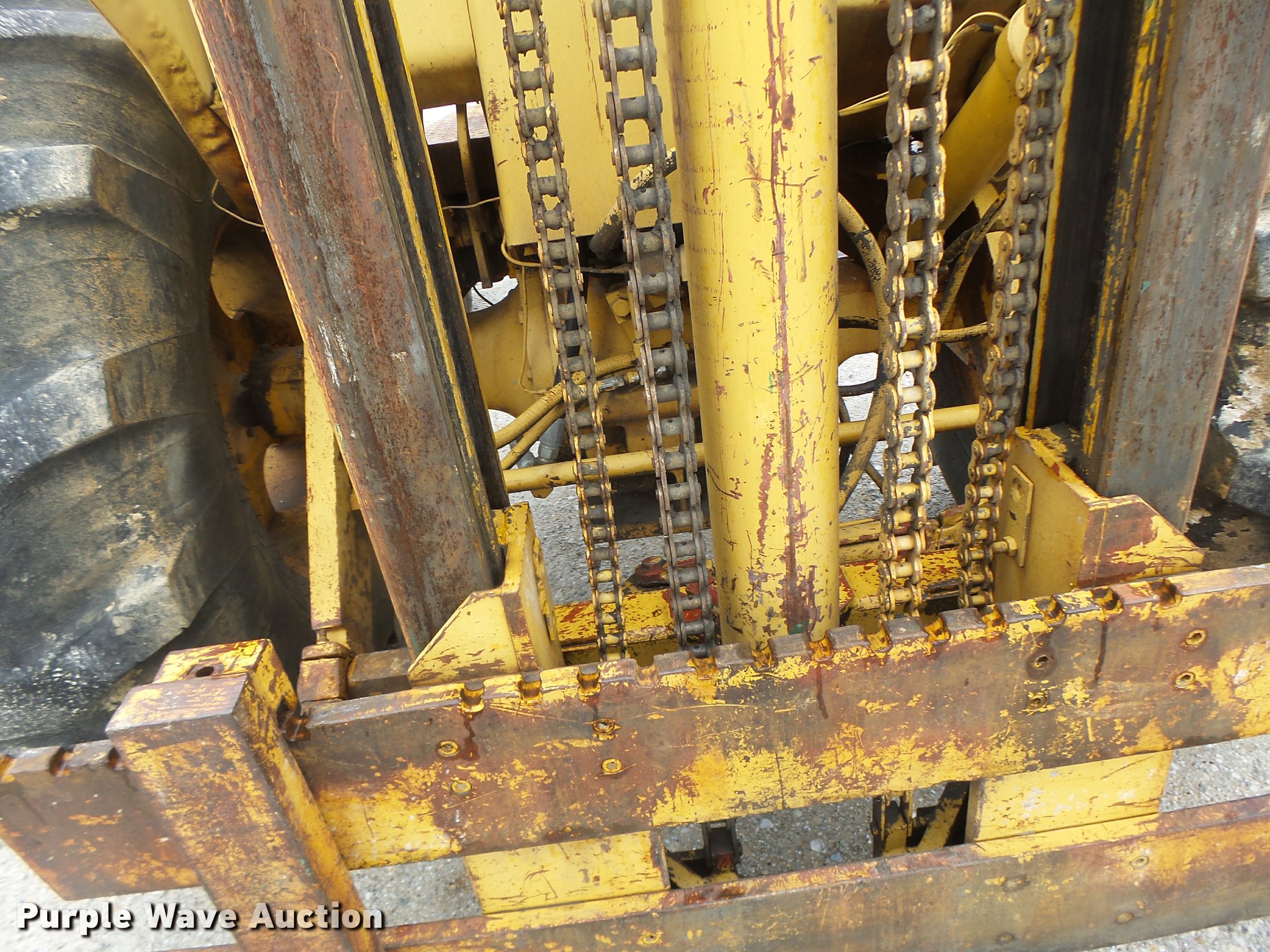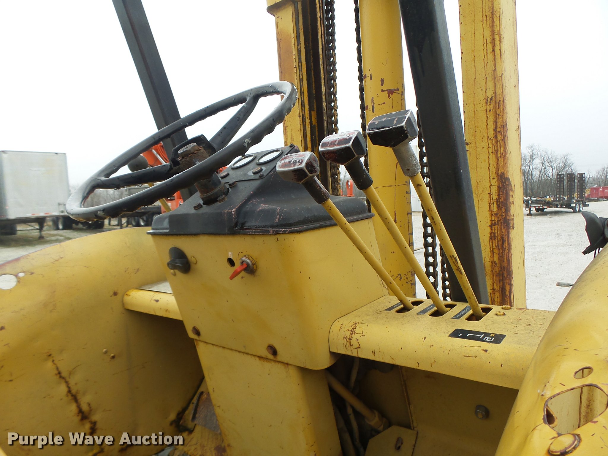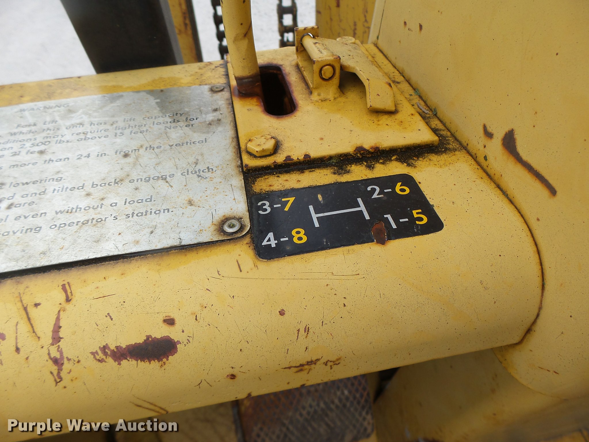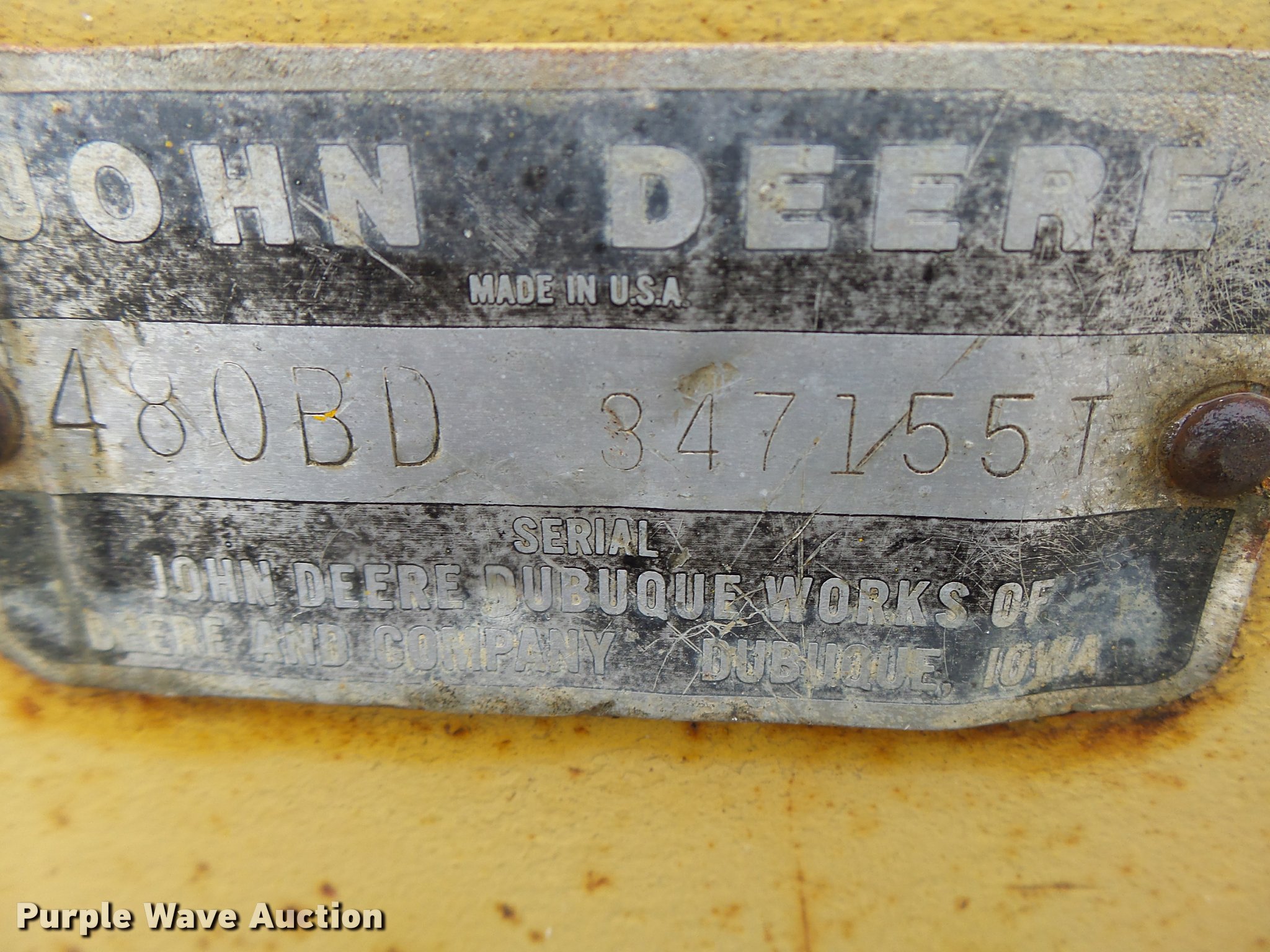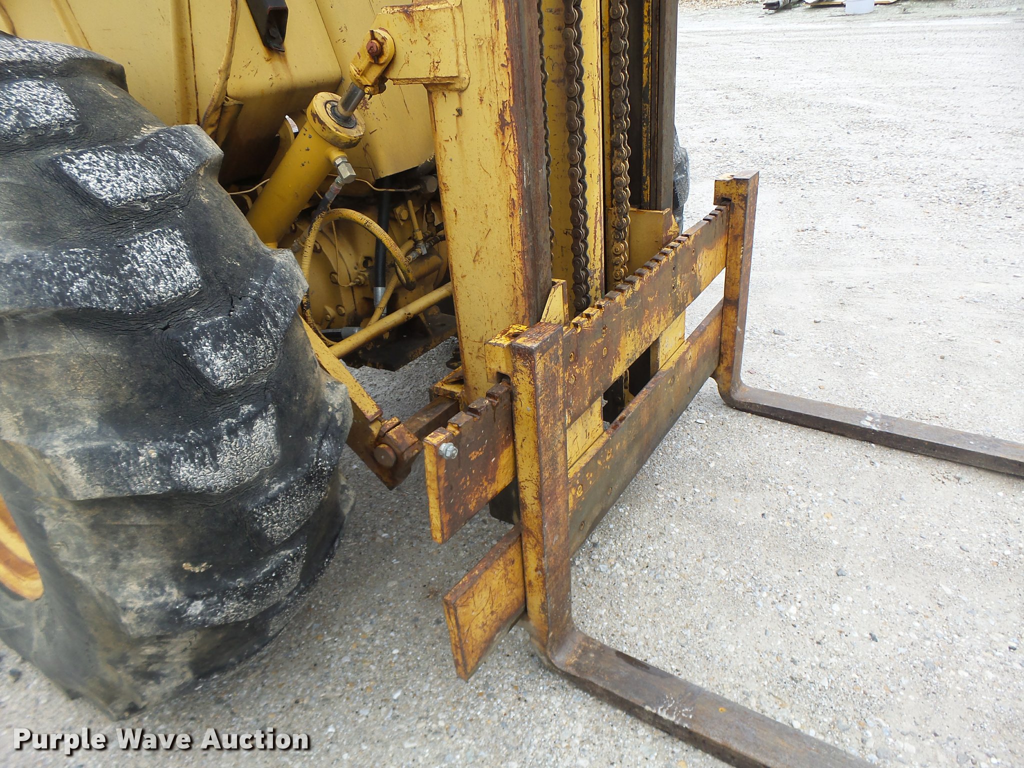 Purple Wave is selling a used Strt. Mast Rough Terr. Forklift in Missouri. This item is a John Deere 480-B forklift with the following: 4,092 hours on meter, John Deere four cylinder diesel engine, Manual transmission, 8F-8R gears, Canopy, 5,000 lbs maximum lift capacity, 21' maximum lift height, 48"L forks, Side shift, Counter weights, 19.5L-24 tires, 11L-15 tires, Serial 347155T