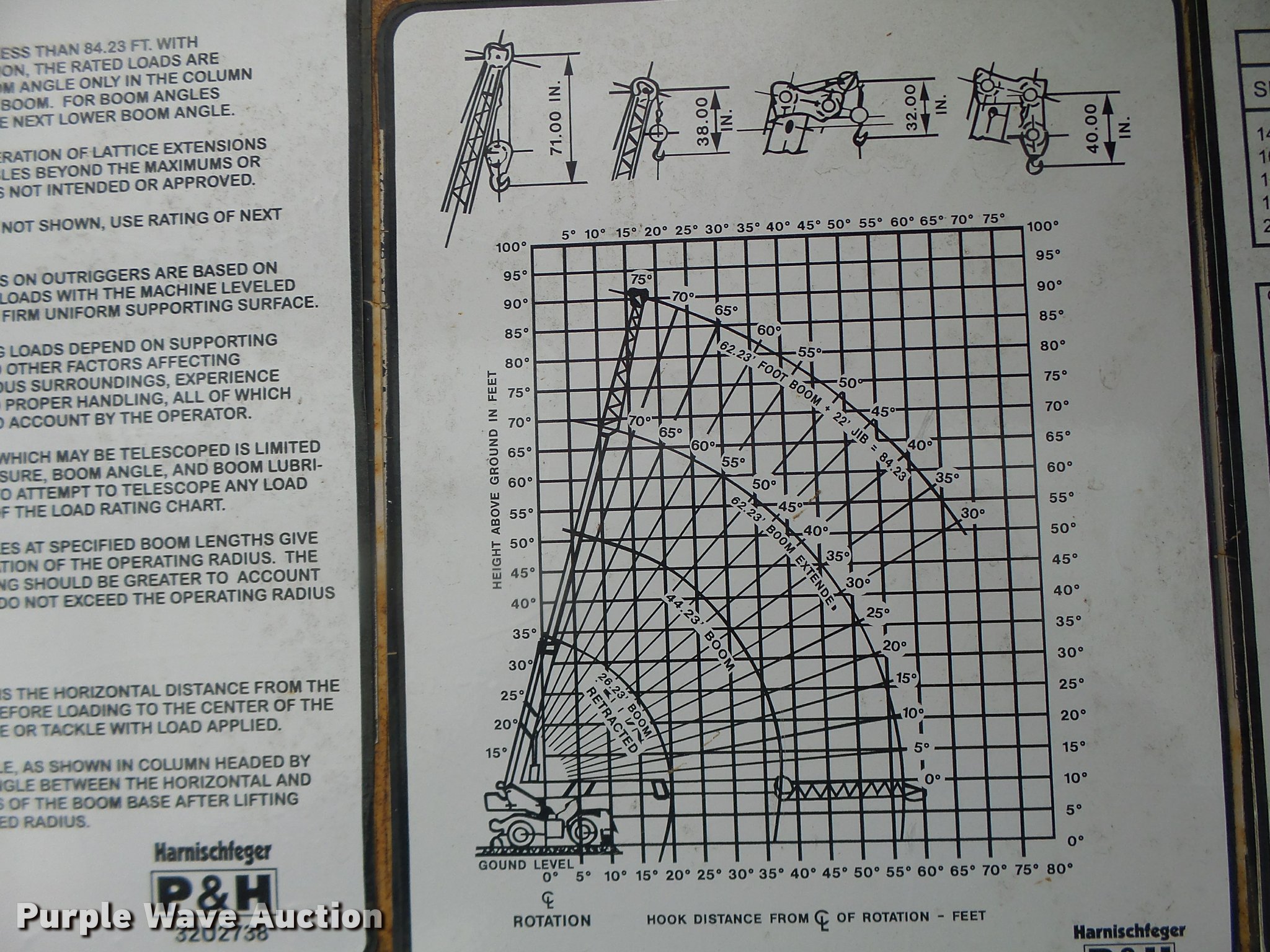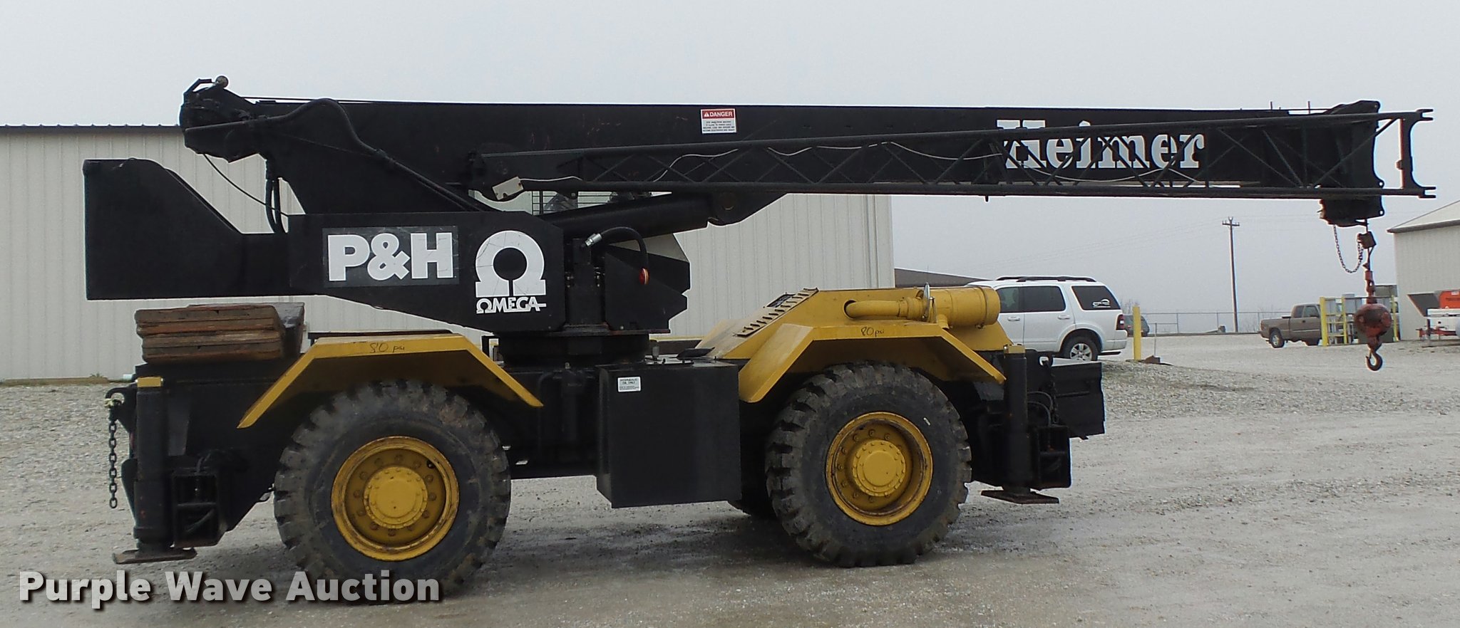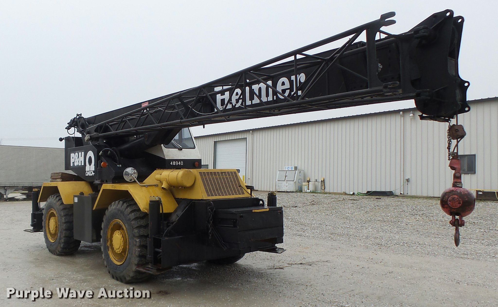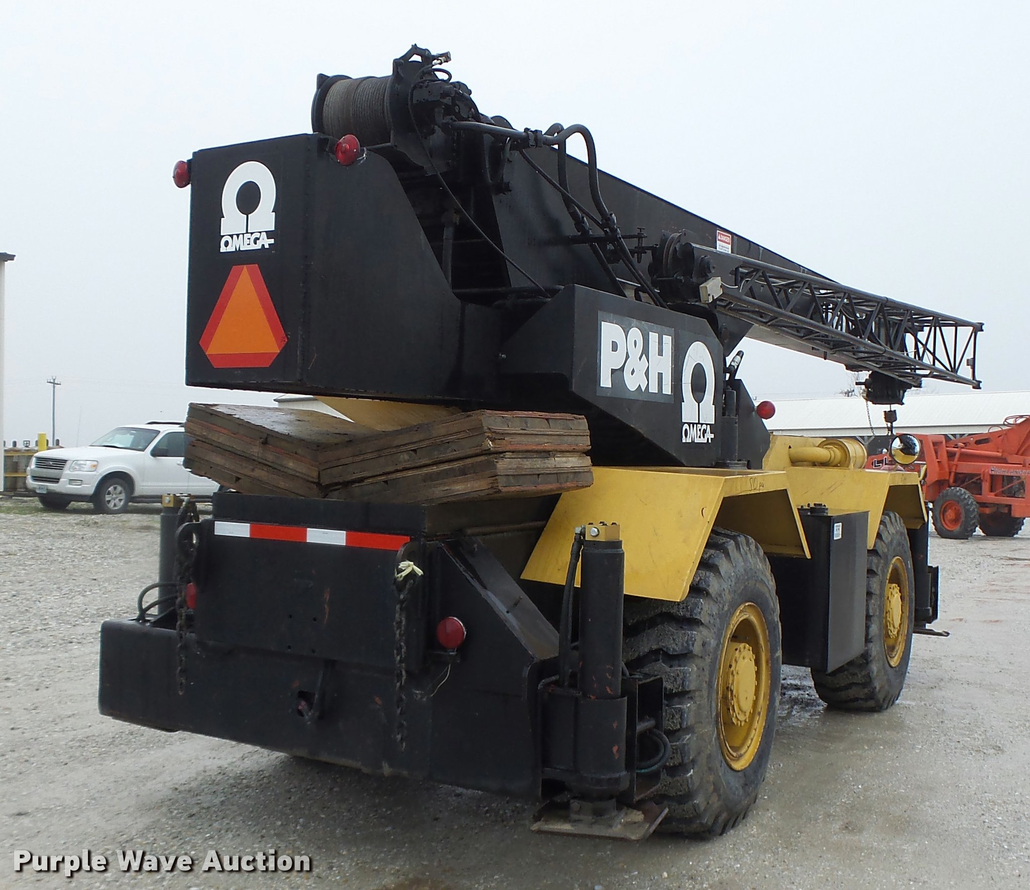 Purple Wave is selling a used Rough or All Terrain Crane in Missouri. This item is a 1980 P & H Omega 18 crane with the following: Detroit Diesel four cylinder diesel engine, 6,984 hours on meter, Three speed manual transmission, (2) axles, Suspension seat, Stick crane controls, Telescopic boom, 70' boom length, 22' jib, 36,000 lbs maximum lift capacity, In-cab boom controls, Crane block, Crane ball and hook, (4) stabilizers, Spring suspension, Hydraulic brakes, 17.5-25 tires, Certification valid through May 24, 2017, Serial 48940