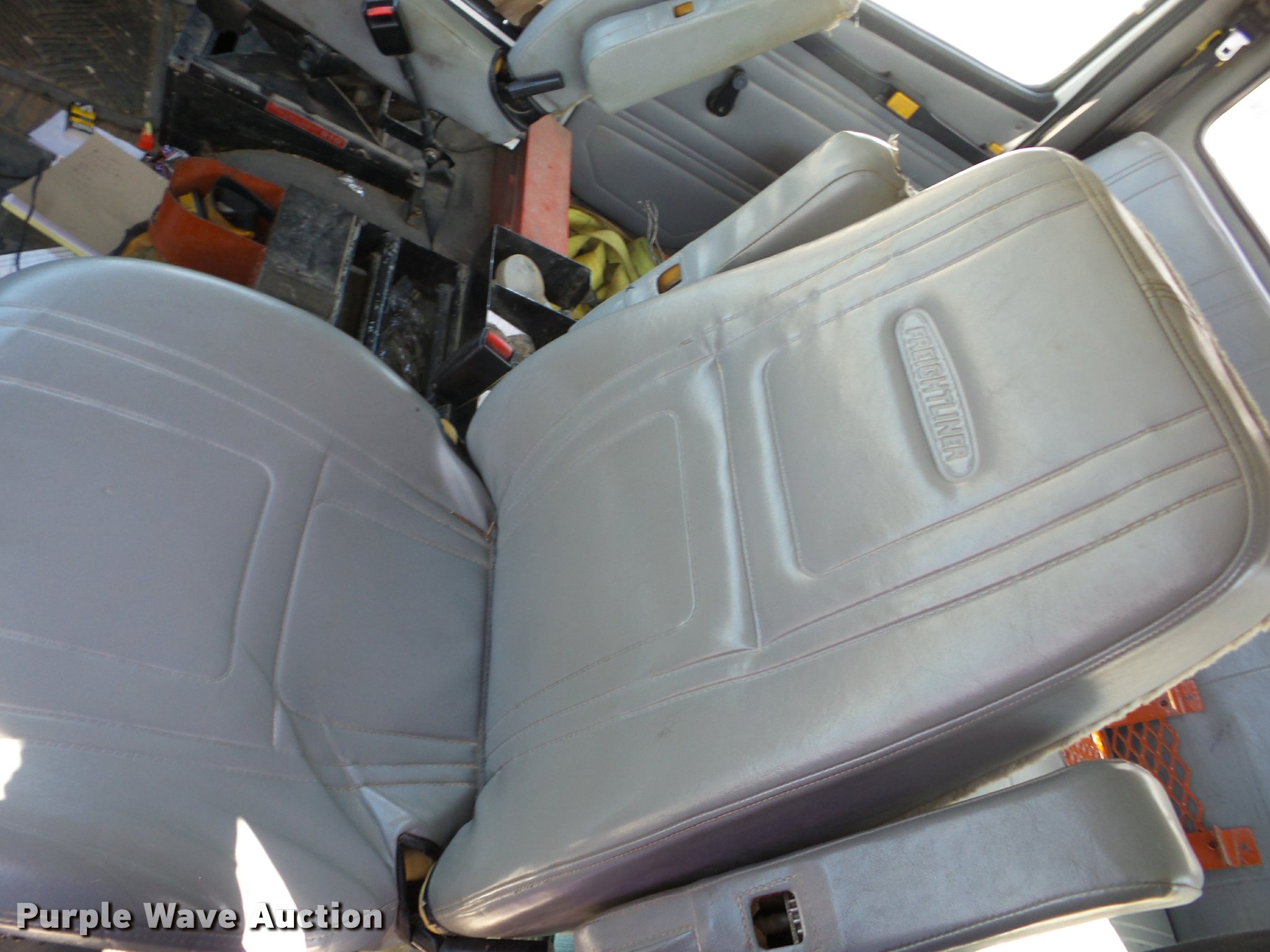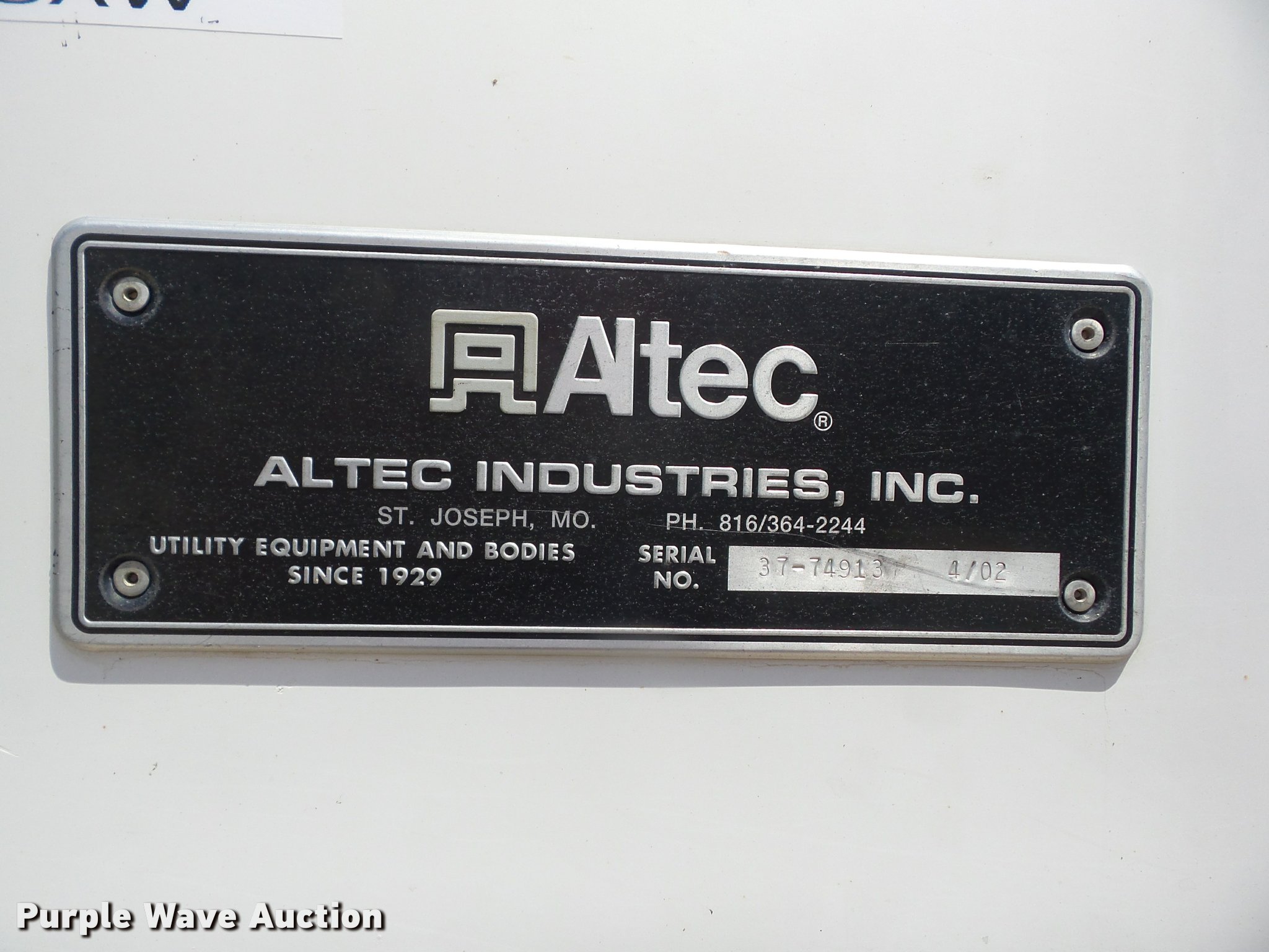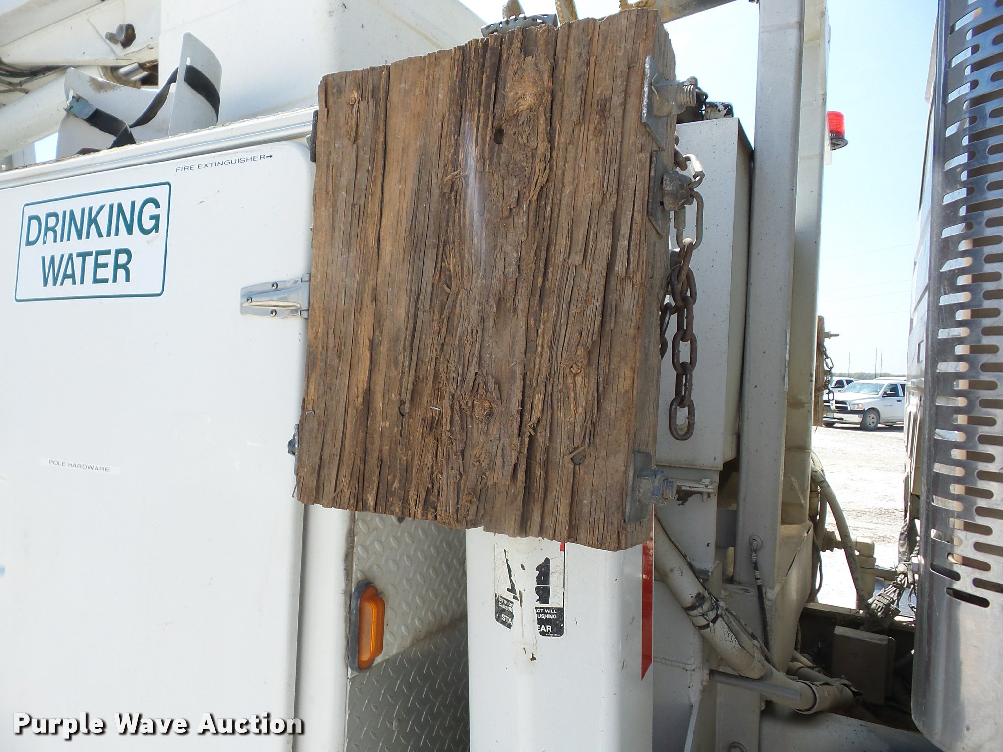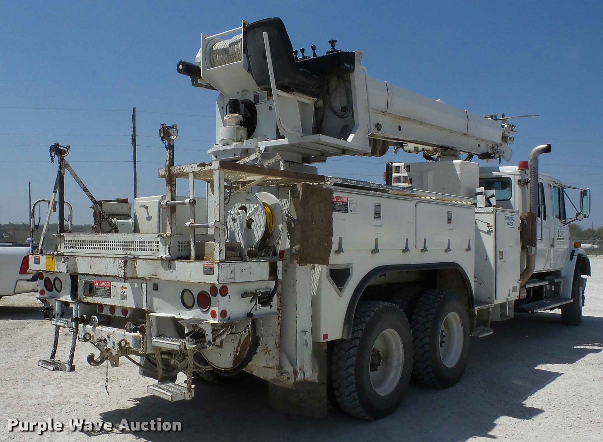 Purple Wave is selling a used Digger Derrick Truck in Missouri. This item is a 2002 Freightliner FL80 digger derrick truck with the following: 143,933 miles on odometer, 2,621 PTO hours on meter, Caterpillar 3126 7.2L L6 turbo diesel engine, Automatic transmission, Inter-axle differential lock, Tandem axle, AC and heat, Cruise, AM/FM, Heated mirrors, Air suspension seat, Block heater, Front tow hooks, PTO, Altec service bed, 15'L, Shelving, Slide-out drawers, Catwalk, Worklights, Serial 37-74913, 2002 Altec D2050TR boom, 30,000 lbs maximum lift height, 50' maximum lift height, Man basket, Ground and platform controls, Boom rotation, Pole guide, Remote control, Insulated, telescopic boom, Rope material handler, Outriggers, Certification valid through August 2017, Auger not included, Single exhaust stack, Dual fuel tanks, Pintle hitch, Spring over walking beam suspension, Air brakes, Hankook 315/80R22.5 front tires, 11R22.5 rear tires, GVWR 56,000 lbs, Unit# 4