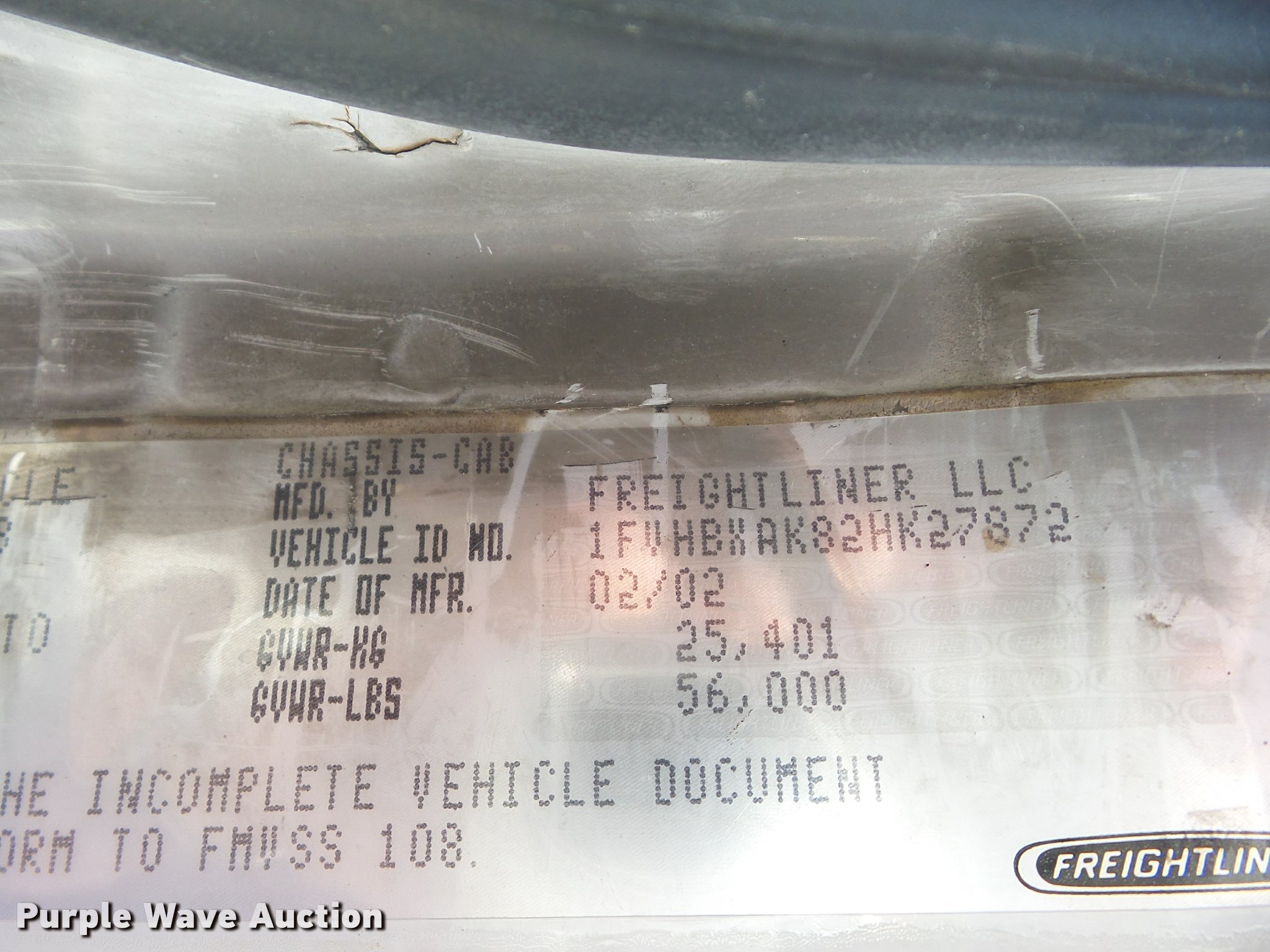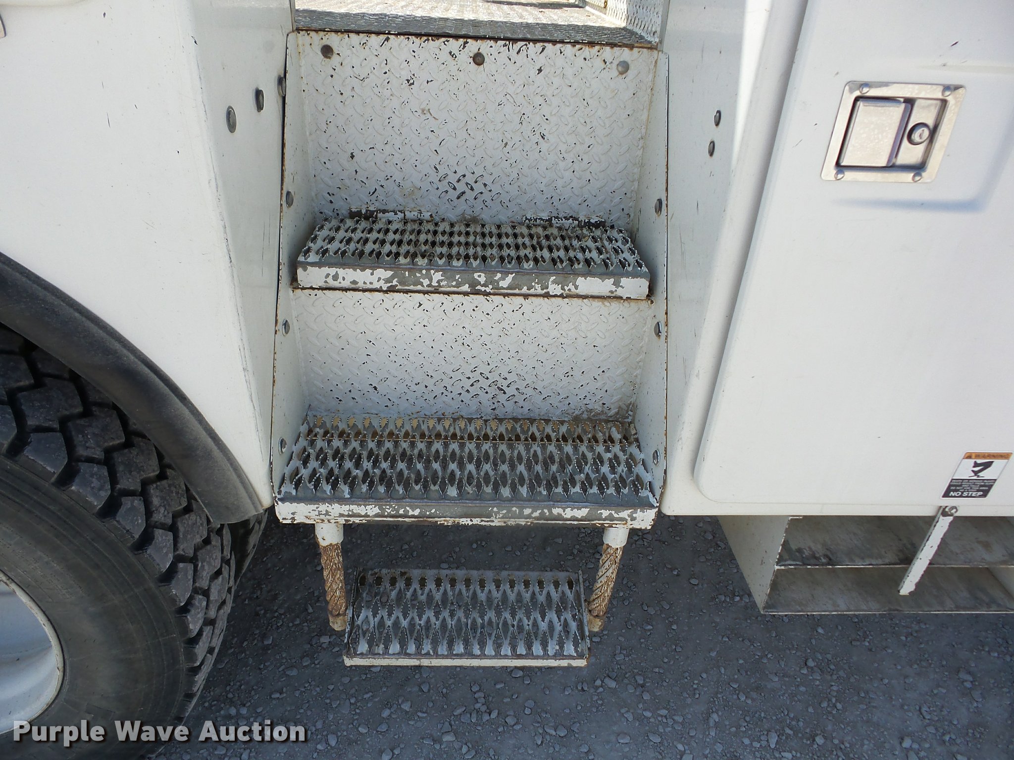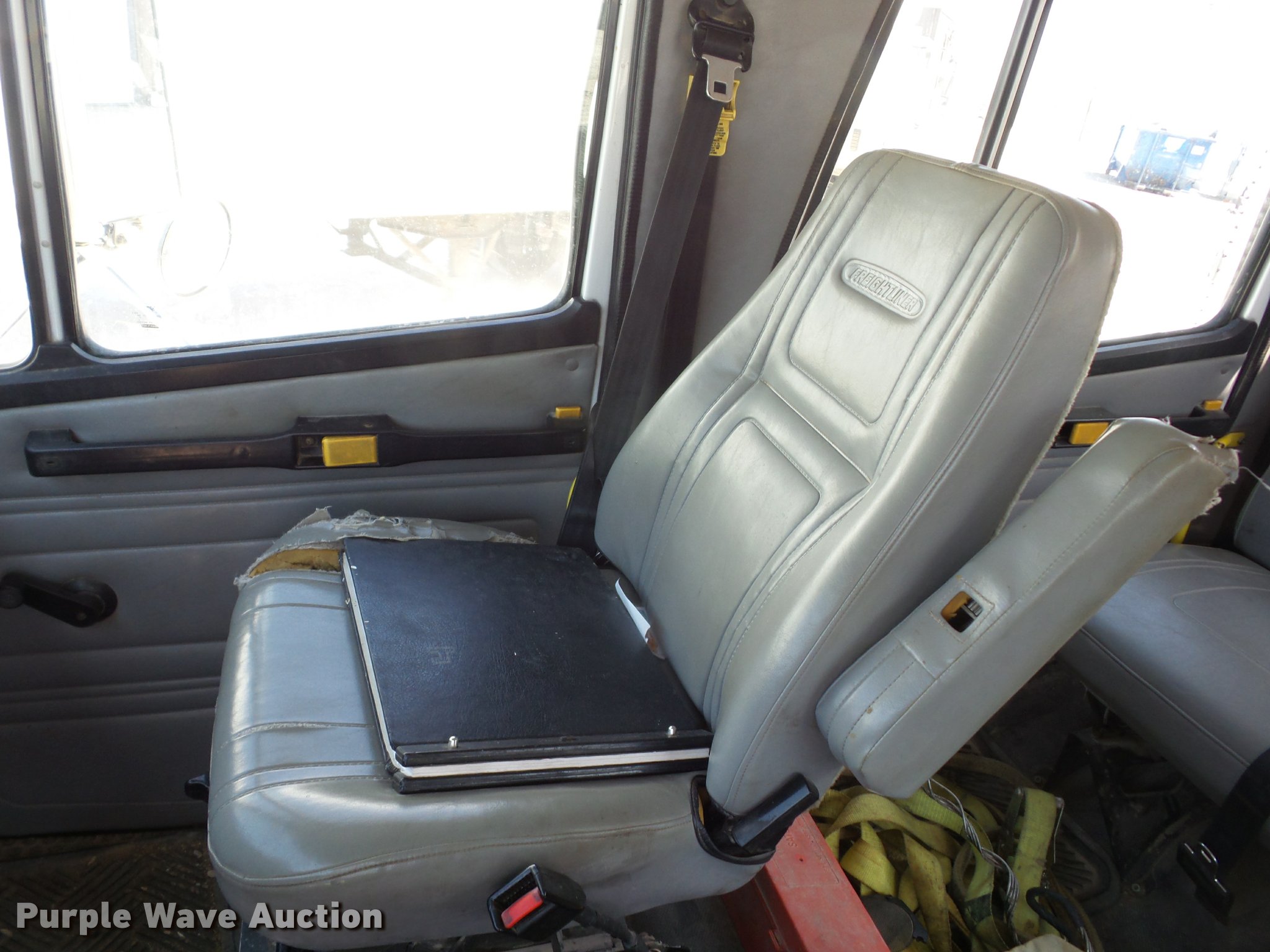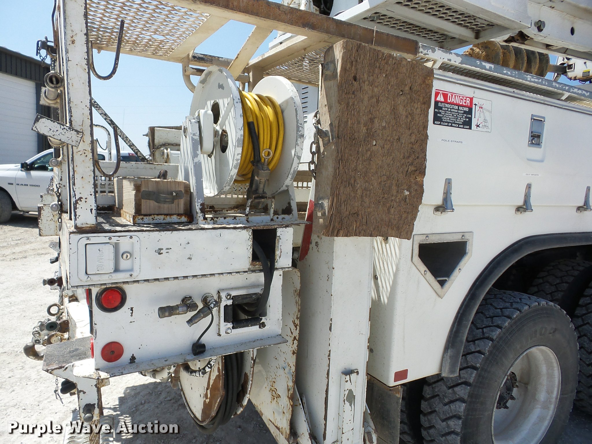 Purple Wave is selling a used Digger Derrick Truck in Missouri. This item is a 2002 Freightliner FL80 digger derrick truck with the following: 143,933 miles on odometer, 2,621 PTO hours on meter, Caterpillar 3126 7.2L L6 turbo diesel engine, Automatic transmission, Inter-axle differential lock, Tandem axle, AC and heat, Cruise, AM/FM, Heated mirrors, Air suspension seat, Block heater, Front tow hooks, PTO, Altec service bed, 15'L, Shelving, Slide-out drawers, Catwalk, Worklights, Serial 37-74913, 2002 Altec D2050TR boom, 30,000 lbs maximum lift height, 50' maximum lift height, Man basket, Ground and platform controls, Boom rotation, Pole guide, Remote control, Insulated, telescopic boom, Rope material handler, Outriggers, Certification valid through August 2017, Auger not included, Single exhaust stack, Dual fuel tanks, Pintle hitch, Spring over walking beam suspension, Air brakes, Hankook 315/80R22.5 front tires, 11R22.5 rear tires, GVWR 56,000 lbs, Unit# 4
